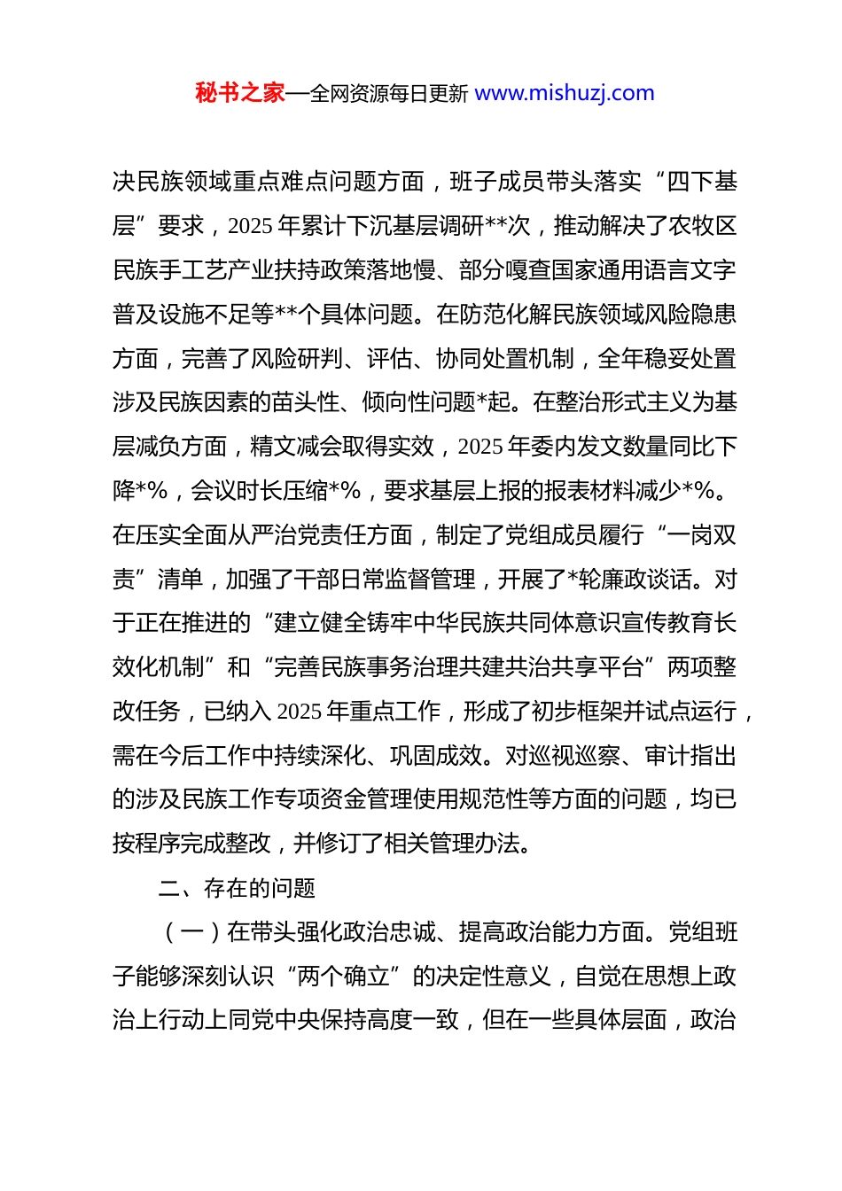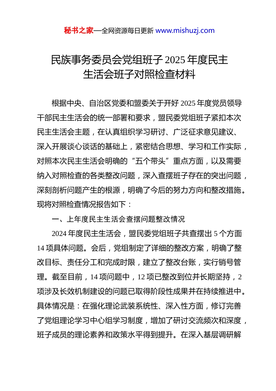 秘书之家—全网资源每日更新 www.mishuzj.com民族事务委员会党组班子 2025 年度民主生活会班子对照检查材料 根据中央、自治区党委和盟委关于开好 2025 年度党员领导干部民主生活会的统一部署和要求,盟民委党组班子紧扣本次民主生活会主题,在认真组织学习研讨、广泛征求意见建议、深入开展谈心谈话的基础上,紧密结合思想、学习和工作实际,对照本次民主生活会明确的“五个带头”重点方面,以及需要纳入对照检查的各类整改问题,深入查摆班子存在的突出问题,深刻剖析问题产生的根源,明确了今后的努力方向和整改措施。现将对照检查情况报告如下:一、上年度民主生活会查摆问题整改情况2024 年度民主生活会,盟民委党组班子共查摆出 5 个方面14 项具体问题。会后,党组制定了详细的整改方案,明确了整改目标、责任分工和完成时限,建立了整改台账,实行销号管理。截至目前,14 项问题中,12 项已整改到位并长期坚持,2项涉及长效机制建设的问题已取得阶段性成果并在持续推进中。具体情况是:在强化理论武装系统性、深入性方面,修订完善了党组理论学习中心组学习制度,增加了研讨交流频次和深度,班子成员的理论素养和政策水平得到提升。在深入基层调研解秘书之家—全网资源每日更新 www.mishuzj.com决民族领域重点难点问题方面,班子成员带头落实“四下基层”要求,2025 年累计下沉基层调研**次,推动解决了农牧区民族手工艺产业扶持政策落地慢、部分嘎查国家通用语言文字普及设施不足等**个具体问题。在防范化解民族领域风险隐患方面,完善了风险研判、评估、协同处置机制,全年稳妥处置涉及民族因素的苗头性、倾向性问题*起。在整治形式主义为基层减负方面,精文减会取得实效,2025 年委内发文数量同比下降*%,会议时长压缩*%,要求基层上报的报表材料减少*%。在压实全面从严治党责任方面,制定了党组成员履行“一岗双责”清单,加强了干部日常监督管理,开展了*轮廉政谈话。对于正在推进的“建立健全铸牢中华民族共同体意识宣传教育长效化机制”和“完善民族事务治理共建共治共享平台”两项整改任务,已纳入 2025 年重点工作,形成了初步框架并试点运行,需在今后工作中持续深化、巩固成效。对巡视巡察、审计指出的涉及民族工作专项资金管理使用规范性等方面的问题,均已按程序完成整改,并修订了相关管理办法。二、存在的问题(一)在带头强化政治忠诚、提高政治能力方面。党组班子能够深刻认识“两个确立”的决定性意义,自觉在思想上政治上行动上同党中央保持高度一致,但在一些具体层面,政治秘书之家—全网资源每日更新 www.mishuzj.com能力仍有待加强。一是理论武装“转化率”不够高。对习近平新时代中国特色社会主义思想,特别是总书记关于加强和改进民族工作的重要思想,学习领会是深入的,但在将其蕴含的立场、观点、方法创造性转化为符合**实际的民族工作思路、政策举措和具体实践上,有时还显得办法不多、创新不足。比如,在推动中华民族共同体建设由“纲”到“目”细化落实过程中,如何更精准地与我盟“两个屏障”“两个基地”“一个桥头堡”的战略定位相结合,打造具有**辨识度的标志性成果,系统性谋划和突破性抓手还不够多。二是政治判断力、领悟力、执行力有待持续淬炼。对新时代新征程民族工作面临的复杂环境和风险挑战,有时预见性、敏锐性还不够强。比如,对网络空间可能影响民族团结的错误思潮、负面信息的监测、研判和引导,虽然建立了机制,但主动设置议题、有效对冲的能力还有短板。在贯彻执行中央关于民族工作的决策部署和自治区党委、盟委的工作要求时,有时存在“上下一般粗”的现象,结合我盟边境地区、多民族聚居、生态脆弱等实际进行差异化、精细化落实的功夫下得还不够深。三是在严明政治纪律和政治规矩上,压力传导存在“温差”。班子成员自身能够做到严守规矩,但对分管领域和科室党员干部的日常政治言行监督提醒不够经常化、具体化,对一些苗头性、倾向性问题,有时“拉秘书之家—全网资源每日更新 www.mishuzj.com拉袖子、提提醒”做得不够及时、不够严厉,抓早抓小、防微杜渐的力度需进一步加大。(二)在带头固本培元...