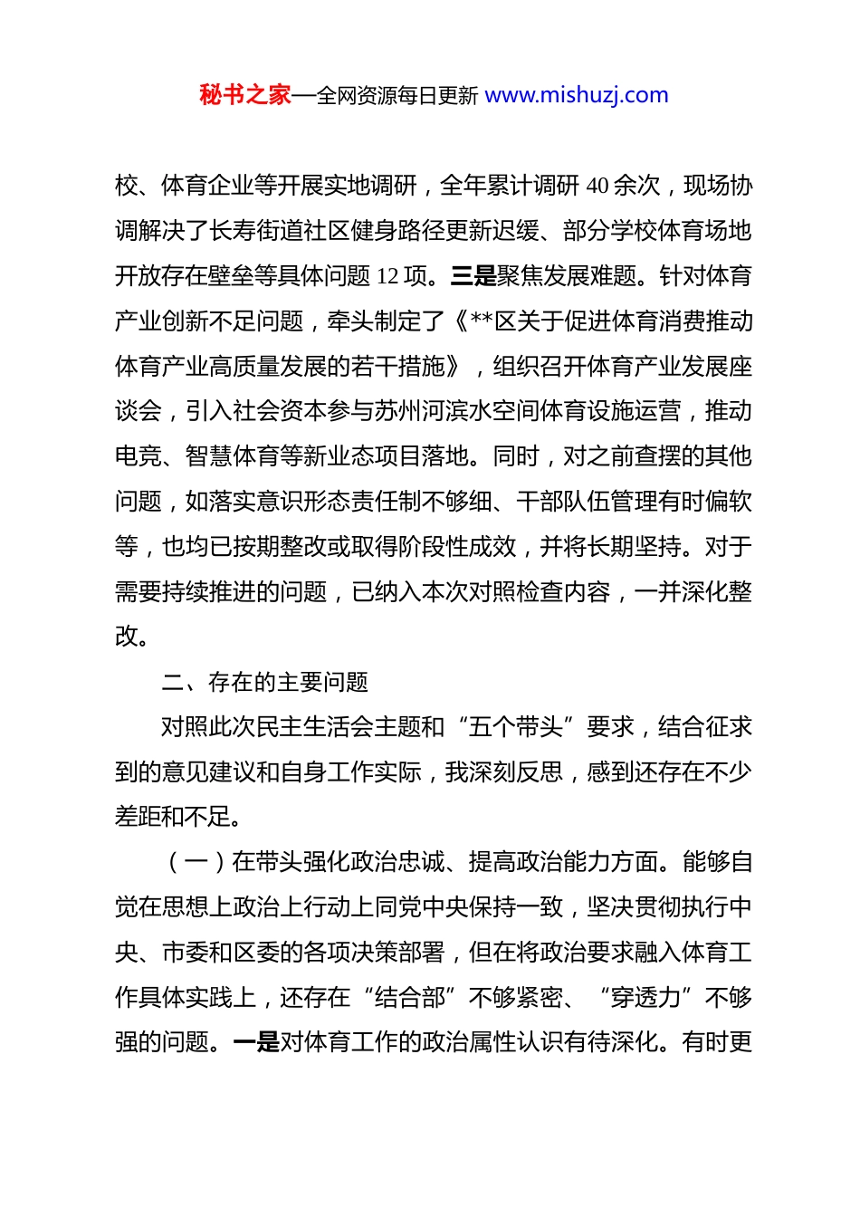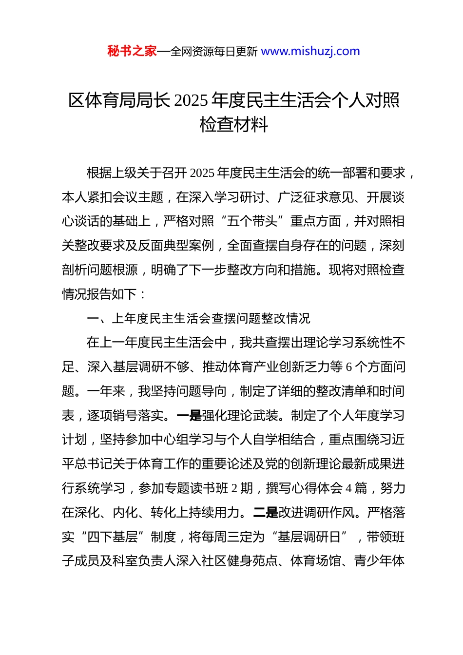 秘书之家—全网资源每日更新 www.mishuzj.com区体育局局长 2025 年度民主生活会个人对照检查材料 根据上级关于召开 2025 年度民主生活会的统一部署和要求,本人紧扣会议主题,在深入学习研讨、广泛征求意见、开展谈心谈话的基础上,严格对照“五个带头”重点方面,并对照相关整改要求及反面典型案例,全面查摆自身存在的问题,深刻剖析问题根源,明确了下一步整改方向和措施。现将对照检查情况报告如下:一、上年度民主生活会查摆问题整改情况在上一年度民主生活会中,我共查摆出理论学习系统性不足、深入基层调研不够、推动体育产业创新乏力等 6 个方面问题。一年来,我坚持问题导向,制定了详细的整改清单和时间表,逐项销号落实。一是强化理论武装。制定了个人年度学习计划,坚持参加中心组学习与个人自学相结合,重点围绕习近平总书记关于体育工作的重要论述及党的创新理论最新成果进行系统学习,参加专题读书班 2 期,撰写心得体会 4 篇,努力在深化、内化、转化上持续用力。二是改进调研作风。严格落实“四下基层”制度,将每周三定为“基层调研日”,带领班子成员及科室负责人深入社区健身苑点、体育场馆、青少年体秘书之家—全网资源每日更新 www.mishuzj.com校、体育企业等开展实地调研,全年累计调研 40 余次,现场协调解决了长寿街道社区健身路径更新迟缓、部分学校体育场地开放存在壁垒等具体问题 12 项。三是聚焦发展难题。针对体育产业创新不足问题,牵头制定了《**区关于促进体育消费推动体育产业高质量发展的若干措施》,组织召开体育产业发展座谈会,引入社会资本参与苏州河滨水空间体育设施运营,推动电竞、智慧体育等新业态项目落地。同时,对之前查摆的其他问题,如落实意识形态责任制不够细、干部队伍管理有时偏软等,也均已按期整改或取得阶段性成效,并将长期坚持。对于需要持续推进的问题,已纳入本次对照检查内容,一并深化整改。二、存在的主要问题对照此次民主生活会主题和“五个带头”要求,结合征求到的意见建议和自身工作实际,我深刻反思,感到还存在不少差距和不足。(一)在带头强化政治忠诚、提高政治能力方面。能够自觉在思想上政治上行动上同党中央保持一致,坚决贯彻执行中央、市委和区委的各项决策部署,但在将政治要求融入体育工作具体实践上,还存在“结合部”不够紧密、“穿透力”不够强的问题。一是对体育工作的政治属性认识有待深化。有时更秘书之家—全网资源每日更新 www.mishuzj.com多是从业务角度思考体育事业发展,对其在服务国家战略、促进区域经济、凝聚民心民力方面的政治功能挖掘不够深。例如,在落实全民健身国家战略时,更多关注设施建设和活动举办,但在如何通过体育活动铸牢中华民族共同体意识、增强市民城市认同感方面,思考谋划不足,未能完全将体育打造成展示**软实力和城区精神的重要窗口。二是政治判断力、领悟力、执行力在应对复杂局面时仍有提升空间。面对体育领域意识形态风险,如对个别商业赛事可能存在的隐性宣传、个别体育社会组织活动导向等问题,虽然能够保持警惕,但前瞻性预判和系统性防控措施还不够精准到位。在贯彻落实上级关于体育工作的指示精神时,有时存在“等文件”、“看惯例”的想法,主动结合**实际进行前瞻性、创新性落实的锐气有所减弱。例如,对“体教融合”的新要求,虽然联合教育局出台了方案,但在推动“一校一品”、体育教师共享机制等难点问题上,攻坚克难的决心和招数还不够硬。(二)在带头固本培元、增强党性方面。能够坚持学习党的创新理论,遵守党章党规,但对照高标准严要求,党性锻炼的主动性和自觉性仍需加强。一是理论学习的深度和转化效果有差距。对习近平新时代中国特色社会主义思想,特别是关于文化建设、社会建设等方面的重要论述,系统性研读、透彻性秘书之家—全网资源每日更新 www.mishuzj.com理解还不够,存在“用到才学、急用才补”的现象。学习成果转化为谋划体育工作思路、破解发展难题的具体能力还不够强。比如,对“推动高质量发展”的理解,在体育领域如何体现为高品质的公共体育服务供给和高效益的体育产业发展,思路还不够开阔,举措创新...