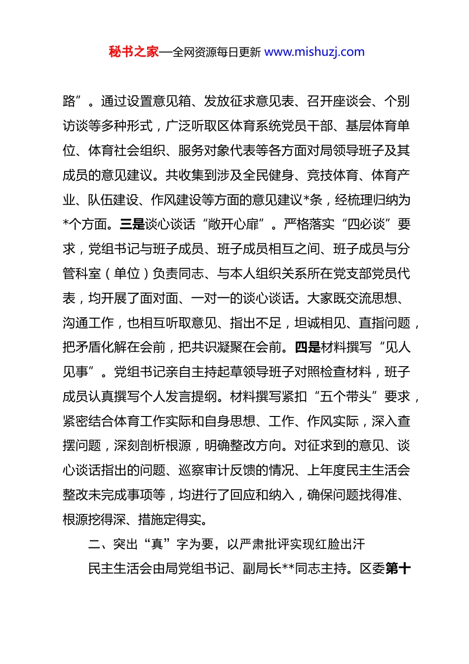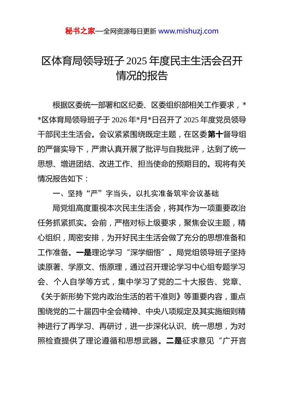 秘书之家—全网资源每日更新 www.mishuzj.com区体育局领导班子 2025 年度民主生活会召开情况的报告 根据区委统一部署和区纪委、区委组织部相关工作要求,**区体育局领导班子于 2026 年*月*日召开了 2025 年度党员领导干部民主生活会。会议紧紧围绕既定主题,在区委第十督导组的严督实导下,严肃认真开展了批评与自我批评,达到了统一思想、增进团结、改进工作、担当使命的预期目的。现将有关情况报告如下:一、坚持“严”字当头,以扎实准备筑牢会议基础局党组高度重视本次民主生活会,将其作为一项重要政治任务抓紧抓实。会前,严格对标上级要求,聚焦会议主题,精心组织,周密安排,为开好民主生活会做了充分的思想准备和工作准备。一是理论学习“深学细悟”。局党组领导班子坚持读原著、学原文、悟原理,通过召开理论学习中心组专题学习会、个人自学等方式,集中学习了党的二十大报告、党章、《关于新形势下党内政治生活的若干准则》等重要内容,重点围绕党的二十届四中全会精神、中央八项规定及其实施细则精神进行了再学习、再研讨,进一步深化认识、统一思想,为对照检查提供了理论遵循和思想武器。二是征求意见“广开言秘书之家—全网资源每日更新 www.mishuzj.com路”。通过设置意见箱、发放征求意见表、召开座谈会、个别访谈等多种形式,广泛听取区体育系统党员干部、基层体育单位、体育社会组织、服务对象代表等各方面对局领导班子及其成员的意见建议。共收集到涉及全民健身、竞技体育、体育产业、队伍建设、作风建设等方面的意见建议*条,经梳理归纳为*个方面。三是谈心谈话“敞开心扉”。严格落实“四必谈”要求,党组书记与班子成员、班子成员相互之间、班子成员与分管科室(单位)负责同志、与本人组织关系所在党支部党员代表,均开展了面对面、一对一的谈心谈话。大家既交流思想、沟通工作,也相互听取意见、指出不足,坦诚相见、直指问题,把矛盾化解在会前,把共识凝聚在会前。四是材料撰写“见人见事”。党组书记亲自主持起草领导班子对照检查材料,班子成员认真撰写个人发言提纲。材料撰写紧扣“五个带头”要求,紧密结合体育工作实际和自身思想、工作、作风实际,深入查摆问题,深刻剖析根源,明确整改方向。对征求到的意见、谈心谈话指出的问题、巡察审计反馈的情况、上年度民主生活会整改未完成事项等,均进行了回应和纳入,确保问题找得准、根源挖得深、措施定得实。二、突出“真”字为要,以严肃批评实现红脸出汗民主生活会由局党组书记、副局长**同志主持。区委第十秘书之家—全网资源每日更新 www.mishuzj.com督导组组长、区纪委监委第四派驻纪检监察组副组长**同志及督导组全体成员到会指导。会议通报了深入贯彻中央八项规定精神学习教育整改整治情况、2024 年度民主生活会整改落实情况和本次民主生活会征求意见情况。会上,**同志首先代表局领导班子作对照检查,重点从“带头强化政治忠诚、提高政治能力”“带头固本培元、增强党性”“带头敬畏人民、敬畏组织、敬畏法纪”“带头干事创业、担当作为”“带头坚决扛起管党治党责任”等五个方面,查摆了存在的突出问题。例如,在政治能力方面,存在运用党的创新理论指导体育强国、体育强市建设在**落地见效的穿透力不足问题,对区委“半马苏河品质区”建设中的体育赋能思考谋划不够系统深入;在担当作为方面,面对群众日益增长的多元化、高品质体育需求,公共服务供给的精准性和有效性有待提升,体育产业培育的创新突破点不多;在管党治党方面,对下属单位、体育社会组织的党建指导和日常监督还需加强等。同时,班子成员结合分管领域和自身实际,聚焦一个反面典型案例进行了深入剖析,汲取教训,举一反三。随后,**同志带头作个人对照检查,主动接受其他班子成员批评。其他班子成员逐一进行个人对照检查,并相互开展批评。自我批评时,大家勇于解剖自己,揭短亮丑,既从工作中秘书之家—全网资源每日更新 www.mishuzj.com找差距,又从思想上、党性上找原因,做到落细落小、见人见事。相互批评时,大家出于公心、直截了当,真点问题、点真问题,既有严肃查摆问题的“辣味”,又有同志之间相互帮...