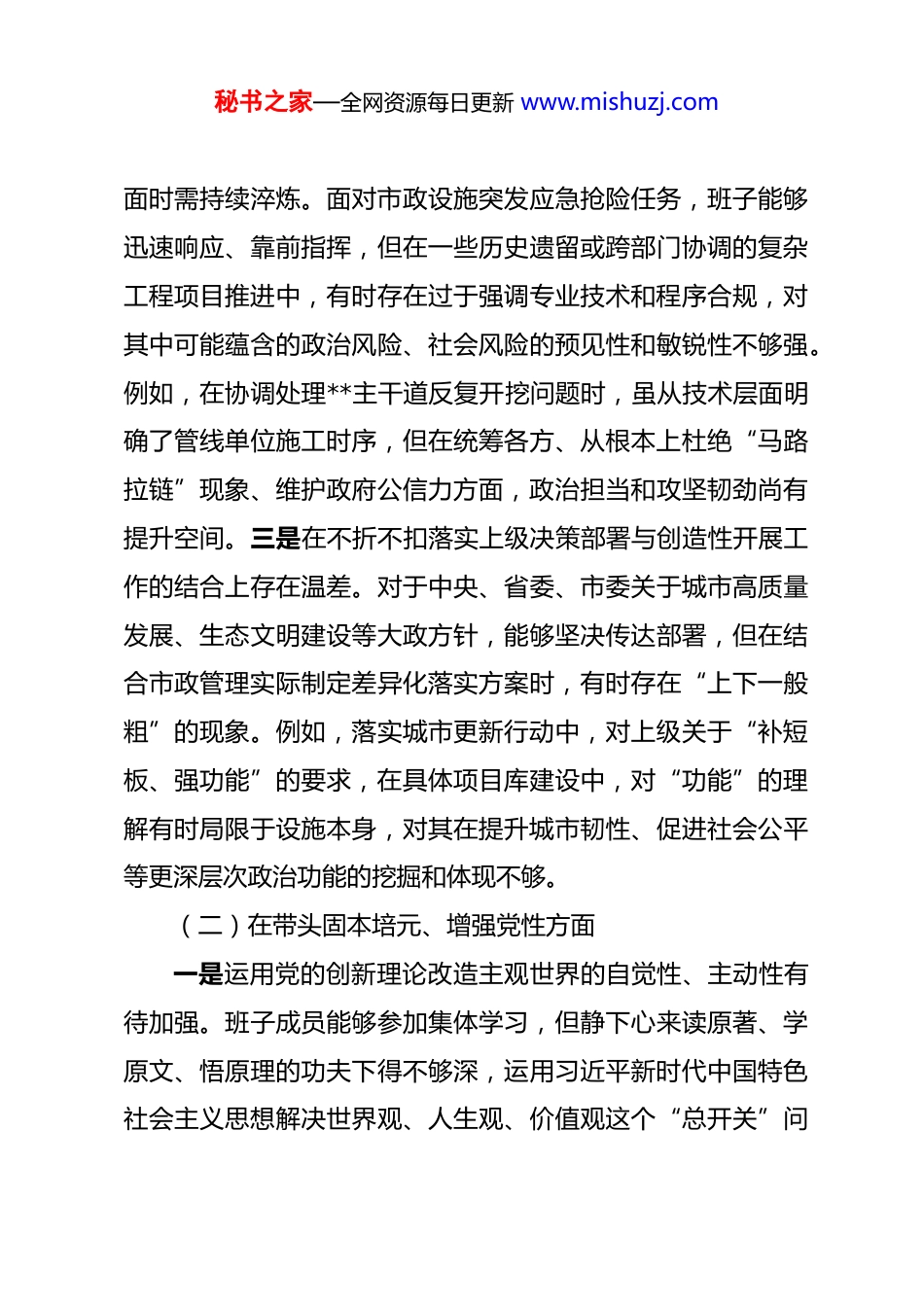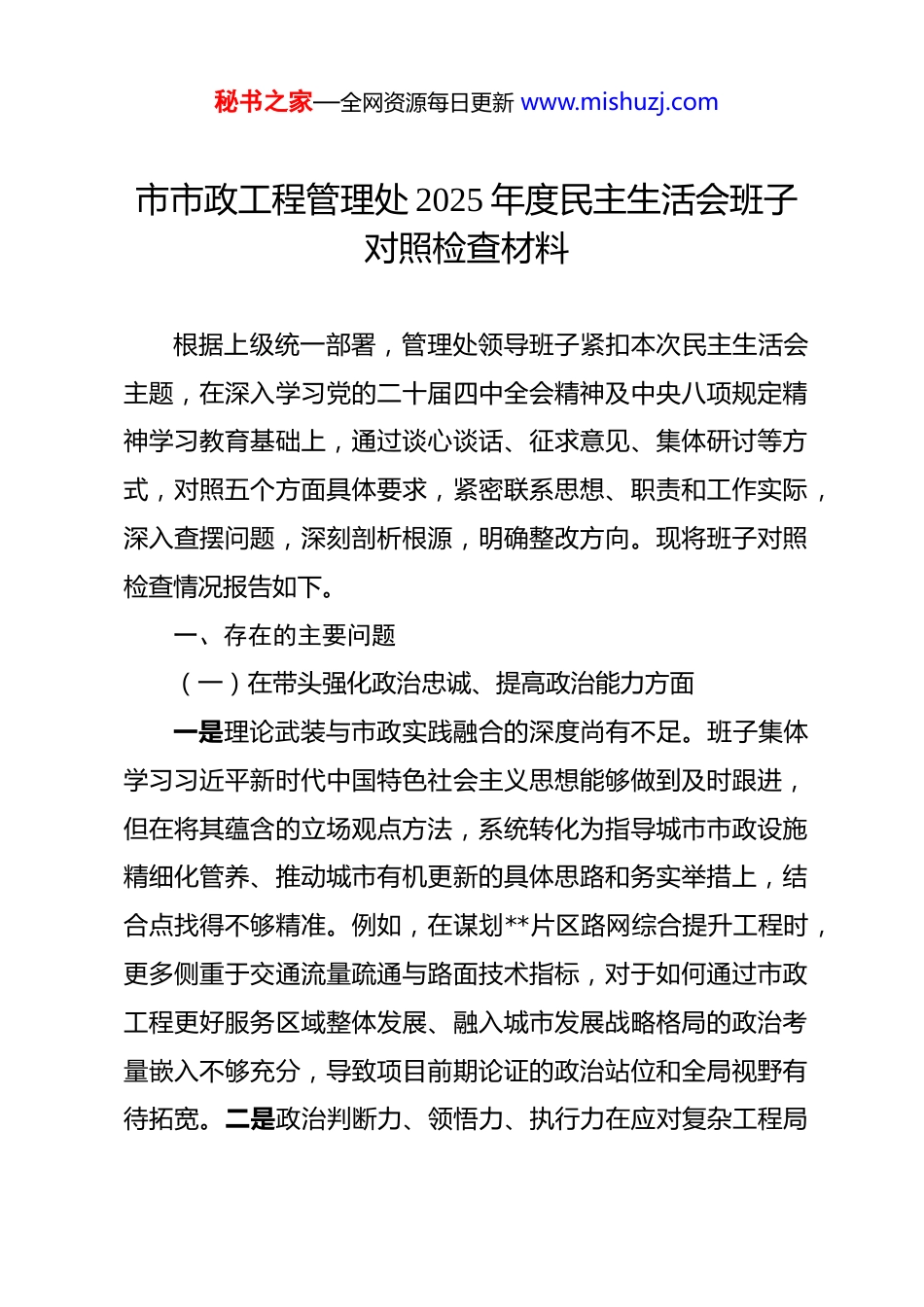 秘书之家—全网资源每日更新 www.mishuzj.com市市政工程管理处 2025 年度民主生活会班子对照检查材料 根据上级统一部署,管理处领导班子紧扣本次民主生活会主题,在深入学习党的二十届四中全会精神及中央八项规定精神学习教育基础上,通过谈心谈话、征求意见、集体研讨等方式,对照五个方面具体要求,紧密联系思想、职责和工作实际,深入查摆问题,深刻剖析根源,明确整改方向。现将班子对照检查情况报告如下。一、存在的主要问题(一)在带头强化政治忠诚、提高政治能力方面一是理论武装与市政实践融合的深度尚有不足。班子集体学习习近平新时代中国特色社会主义思想能够做到及时跟进,但在将其蕴含的立场观点方法,系统转化为指导城市市政设施精细化管养、推动城市有机更新的具体思路和务实举措上,结合点找得不够精准。例如,在谋划**片区路网综合提升工程时,更多侧重于交通流量疏通与路面技术指标,对于如何通过市政工程更好服务区域整体发展、融入城市发展战略格局的政治考量嵌入不够充分,导致项目前期论证的政治站位和全局视野有待拓宽。二是政治判断力、领悟力、执行力在应对复杂工程局秘书之家—全网资源每日更新 www.mishuzj.com面时需持续淬炼。面对市政设施突发应急抢险任务,班子能够迅速响应、靠前指挥,但在一些历史遗留或跨部门协调的复杂工程项目推进中,有时存在过于强调专业技术和程序合规,对其中可能蕴含的政治风险、社会风险的预见性和敏锐性不够强。例如,在协调处理**主干道反复开挖问题时,虽从技术层面明确了管线单位施工时序,但在统筹各方、从根本上杜绝“马路拉链”现象、维护政府公信力方面,政治担当和攻坚韧劲尚有提升空间。三是在不折不扣落实上级决策部署与创造性开展工作的结合上存在温差。对于中央、省委、市委关于城市高质量发展、生态文明建设等大政方针,能够坚决传达部署,但在结合市政管理实际制定差异化落实方案时,有时存在“上下一般粗”的现象。例如,落实城市更新行动中,对上级关于“补短板、强功能”的要求,在具体项目库建设中,对“功能”的理解有时局限于设施本身,对其在提升城市韧性、促进社会公平等更深层次政治功能的挖掘和体现不够。(二)在带头固本培元、增强党性方面一是运用党的创新理论改造主观世界的自觉性、主动性有待加强。班子成员能够参加集体学习,但静下心来读原著、学原文、悟原理的功夫下得不够深,运用习近平新时代中国特色社会主义思想解决世界观、人生观、价值观这个“总开关”问秘书之家—全网资源每日更新 www.mishuzj.com题的意识不够强。有时存在“业务干部”思维,认为抓好工程项目、保障设施安全运行就是最大党性,对通过理论滋养不断坚定理想信念、筑牢信仰之基的极端重要性认识需进一步深化。例如,在组织生活会上开展批评与自我批评时,有时谈业务工作多、谈思想根源少,从党性原则高度进行深刻剖析的锐度和深度不足。二是党章党规党纪的日常涵养和内化践行有待强化。班子能够带头遵守党的各项纪律,但在将纪律规矩意识融入日常管理、浸润到工程审批、资金使用、队伍建设的全过程、各环节方面,抓得不够细、不够常。例如,在内部工程款支付审批流程中,虽然制度健全,但班子成员对流程执行中各环节可能存在的廉洁风险点进行常态化党性体检和提醒督促不够,满足于程序走完,在通过严格制度执行来锤炼干部党性、纯正道德品质方面作用发挥不充分。三是在传承红色基因、弘扬艰苦奋斗精神上表率作用不够突出。随着工作条件改善,班子有时在思想上对市政工程战线“晴天一身土、雨天一身泥”的优良传统强调有所弱化。例如,在推进**桥梁安全监测系统智慧化升级项目时,更多关注技术方案的先进性和预算合理性,但对于如何在此过程中培养锻炼年轻技术人员吃苦耐劳、深入一线的作风,思考谋划和具体引导不够。(三)在带头敬畏人民、敬畏组织、敬畏法纪方面秘书之家—全网资源每日更新 www.mishuzj.com一是践行“四下基层”制度、走好新时代群众路线存在“最后一公里”问题。班子成员能够定期下基层调研,但有时调研行程安排较满,“走马观花”听汇报多,“下马看花”深入街头巷尾、与一线养护工...