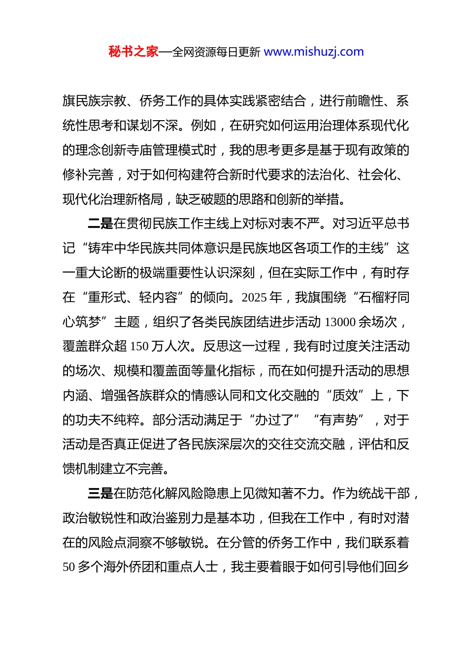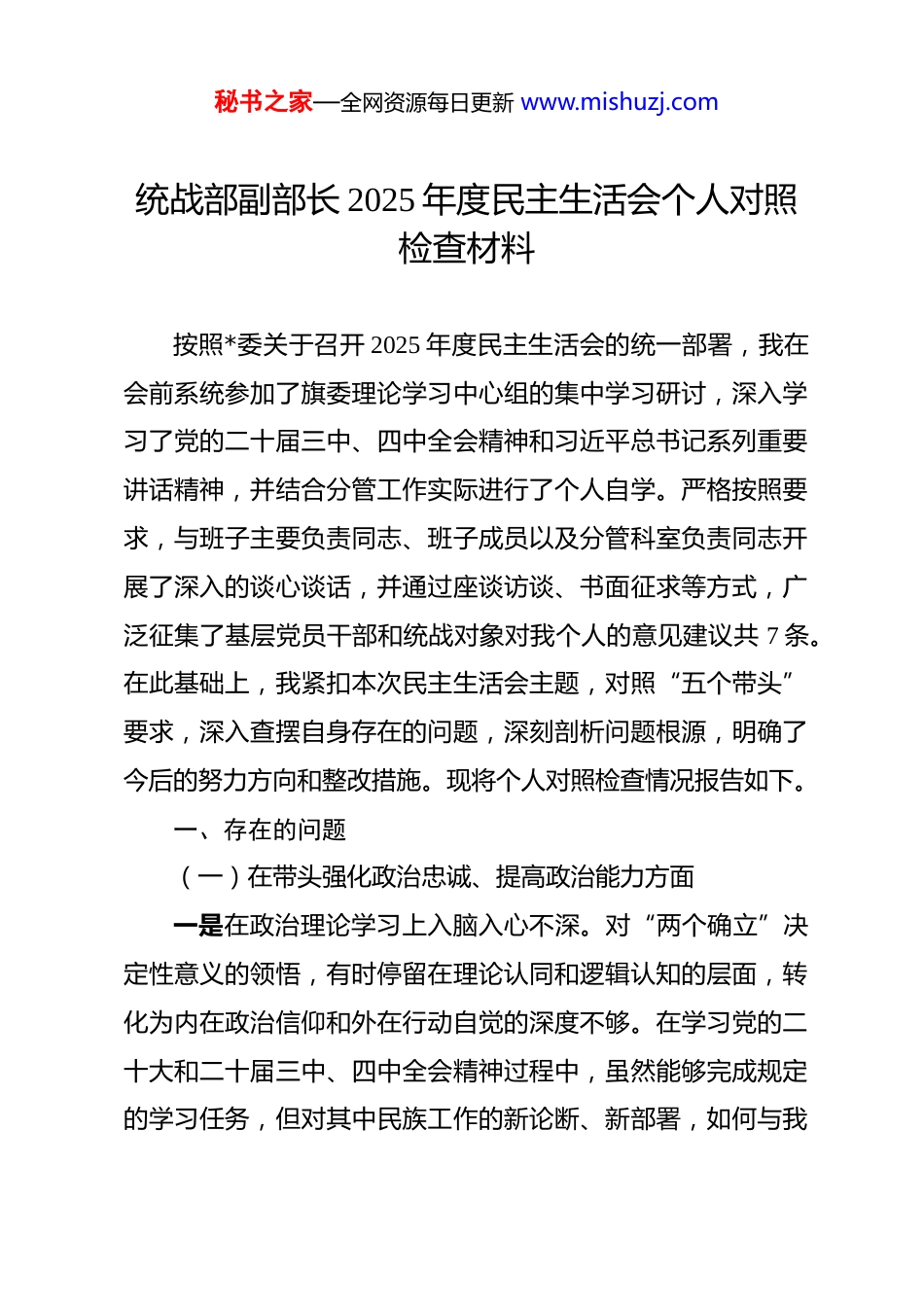 秘书之家—全网资源每日更新 www.mishuzj.com统战部副部长 2025 年度民主生活会个人对照检查材料 按照*委关于召开 2025 年度民主生活会的统一部署,我在会前系统参加了旗委理论学习中心组的集中学习研讨,深入学习了党的二十届三中、四中全会精神和习近平总书记系列重要讲话精神,并结合分管工作实际进行了个人自学。严格按照要求,与班子主要负责同志、班子成员以及分管科室负责同志开展了深入的谈心谈话,并通过座谈访谈、书面征求等方式,广泛征集了基层党员干部和统战对象对我个人的意见建议共 7 条。在此基础上,我紧扣本次民主生活会主题,对照“五个带头”要求,深入查摆自身存在的问题,深刻剖析问题根源,明确了今后的努力方向和整改措施。现将个人对照检查情况报告如下。一、存在的问题(一)在带头强化政治忠诚、提高政治能力方面一是在政治理论学习上入脑入心不深。对“两个确立”决定性意义的领悟,有时停留在理论认同和逻辑认知的层面,转化为内在政治信仰和外在行动自觉的深度不够。在学习党的二十大和二十届三中、四中全会精神过程中,虽然能够完成规定的学习任务,但对其中民族工作的新论断、新部署,如何与我秘书之家—全网资源每日更新 www.mishuzj.com旗民族宗教、侨务工作的具体实践紧密结合,进行前瞻性、系统性思考和谋划不深。例如,在研究如何运用治理体系现代化的理念创新寺庙管理模式时,我的思考更多是基于现有政策的修补完善,对于如何构建符合新时代要求的法治化、社会化、现代化治理新格局,缺乏破题的思路和创新的举措。二是在贯彻民族工作主线上对标对表不严。对习近平总书记“铸牢中华民族共同体意识是民族地区各项工作的主线”这一重大论断的极端重要性认识深刻,但在实际工作中,有时存在“重形式、轻内容”的倾向。2025 年,我旗围绕“石榴籽同心筑梦”主题,组织了各类民族团结进步活动 13000 余场次,覆盖群众超 150 万人次。反思这一过程,我有时过度关注活动的场次、规模和覆盖面等量化指标,而在如何提升活动的思想内涵、增强各族群众的情感认同和文化交融的“质效”上,下的功夫不纯粹。部分活动满足于“办过了”“有声势”,对于活动是否真正促进了各民族深层次的交往交流交融,评估和反馈机制建立不完善。三是在防范化解风险隐患上见微知著不力。作为统战干部,政治敏锐性和政治鉴别力是基本功,但我在工作中,有时对潜在的风险点洞察不够敏锐。在分管的侨务工作中,我们联系着50 多个海外侨团和重点人士,我主要着眼于如何引导他们回乡秘书之家—全网资源每日更新 www.mishuzj.com投资、捐资助学,发挥正面积极作用。但是,对于其中可能存在的意识形态渗透风险,以及个别人员在海外复杂背景下的言行可能对我旗造成的影响,缺乏一套常态化、动态化的分析研判和预警机制。工作部署满足于常规性的联络和政策宣传,对“两个屏障”建设中统战领域特别是涉侨领域可能出现的风险点,主动排查和前瞻性防范的意识不强。(二)在带头固本培元、增强党性方面一是锤炼政治修养缺乏恒心韧劲。将政治修养置于党性修养首位的自觉性是有的,但未能做到时时、处处、事事以高标准要求自己。在理论学习之外,对世界观、人生观、价值观这个“总开关”的改造不够彻底。尤其是在接触一些事业有成的归国华侨和民营企业家时,看到他们优越的生活条件,内心深处偶尔会闪过一丝羡慕的念头,虽然能迅速警醒并加以克制,但这本身就反映出自己艰苦奋斗、为民服务的共产党人精神追求还不够纯粹,抵御物质诱惑的思想防线扎得不牢。二是严守党章党规缺乏戒惧之心。能够认真学习党章党规党纪,但在具体执行中,有时存在“自我原谅”的倾向,对一些看似“细小”的问题不够警觉。例如,在一次下乡调研民族文化传承情况时,基层同志出于热情,在工作餐中上了一道略微超出标准的本地特色菜。当时考虑到基层同志的情面和当地秘书之家—全网资源每日更新 www.mishuzj.com风俗,我没有当场坚决制止,事后也只是做了口头提醒。这件事虽然微小,但反映出我在执行纪律规定上缺乏“勿以恶小而为之”的坚定和较真碰硬的勇气,对纪律的敬畏之心没有真正融入日常言...
