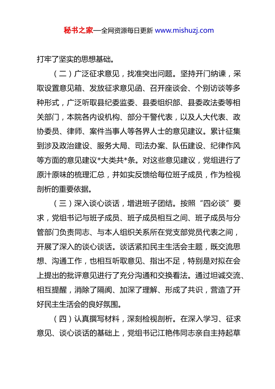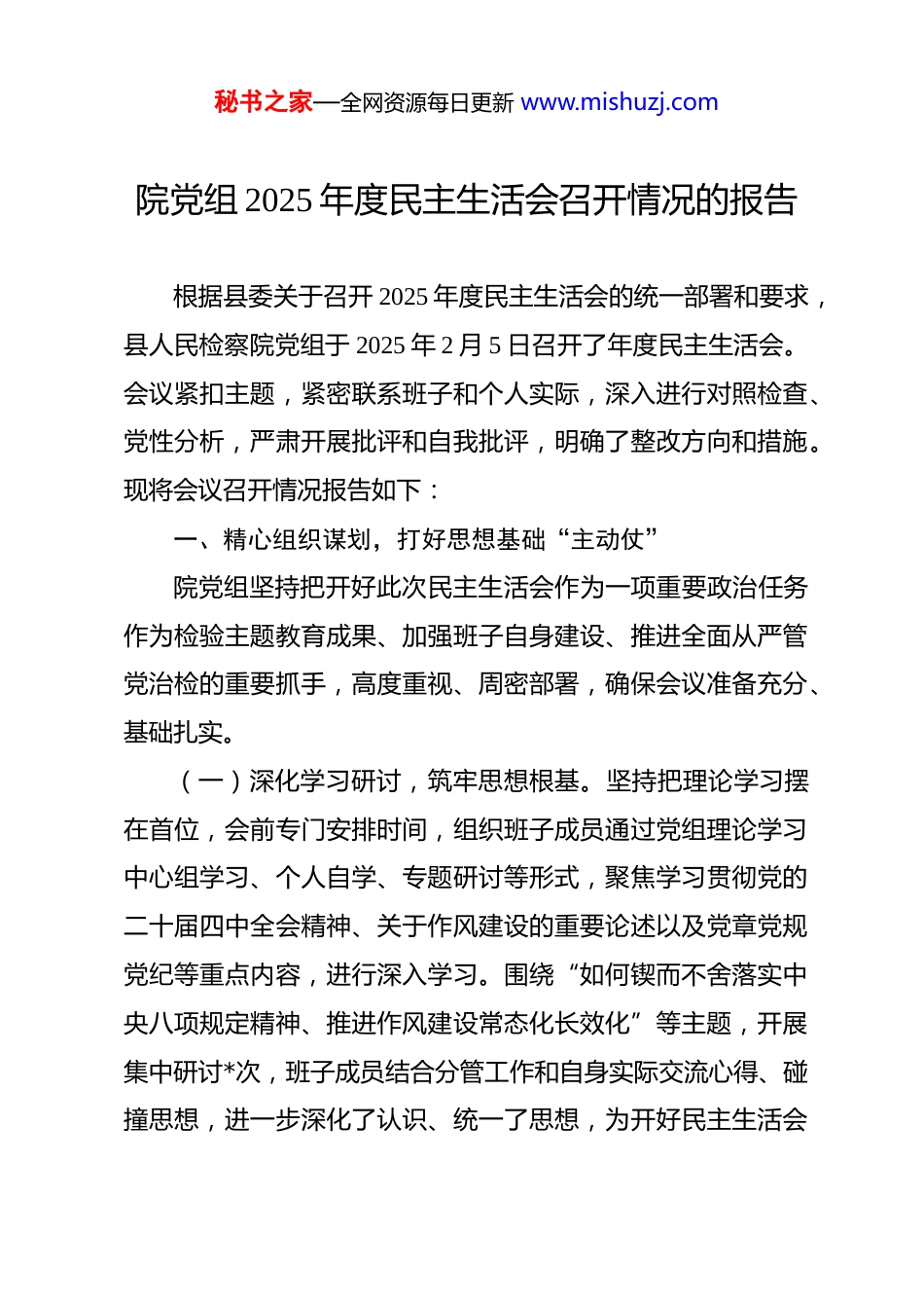 秘书之家—全网资源每日更新 www.mishuzj.com院党组 2025 年度民主生活会召开情况的报告 根据县委关于召开 2025 年度民主生活会的统一部署和要求,县人民检察院党组于 2025 年 2 月 5 日召开了年度民主生活会。会议紧扣主题,紧密联系班子和个人实际,深入进行对照检查、党性分析,严肃开展批评和自我批评,明确了整改方向和措施。现将会议召开情况报告如下:一、精心组织谋划,打好思想基础“主动仗”院党组坚持把开好此次民主生活会作为一项重要政治任务作为检验主题教育成果、加强班子自身建设、推进全面从严管党治检的重要抓手,高度重视、周密部署,确保会议准备充分、基础扎实。(一)深化学习研讨,筑牢思想根基。坚持把理论学习摆在首位,会前专门安排时间,组织班子成员通过党组理论学习中心组学习、个人自学、专题研讨等形式,聚焦学习贯彻党的二十届四中全会精神、关于作风建设的重要论述以及党章党规党纪等重点内容,进行深入学习。围绕“如何锲而不舍落实中央八项规定精神、推进作风建设常态化长效化”等主题,开展集中研讨*次,班子成员结合分管工作和自身实际交流心得、碰撞思想,进一步深化了认识、统一了思想,为开好民主生活会秘书之家—全网资源每日更新 www.mishuzj.com打牢了坚实的思想基础。(二)广泛征求意见,找准突出问题。坚持开门纳谏,采取设置意见箱、发放征求意见函、召开座谈会、个别访谈等多种形式,广泛听取县纪委监委、县委组织部、县委政法委等相关部门,本院各内设机构、部分干警代表,以及人大代表、政协委员、律师、案件当事人等各界人士的意见建议。累计征集到涉及政治建设、服务大局、司法办案、队伍建设、纪律作风等方面的意见建议*大类共*条。对这些意见建议,党组进行了原汁原味的梳理汇总,并如实反馈给每位班子成员,作为检视剖析的重要依据。(三)深入谈心谈话,增进班子团结。按照“四必谈”要求,党组书记与班子成员、班子成员相互之间、班子成员与分管部门负责同志、与本人组织关系所在党支部党员代表之间,开展了深入的谈心谈话。谈话紧扣民主生活会主题,既交流思想、沟通工作,也相互听取意见、指出不足,特别是对拟在会上提出的批评意见进行了充分沟通和交换看法。通过坦诚交流、相互提醒,消除了隔阂、加深了理解、形成了共识,营造了开好民主生活会的良好氛围。(四)认真撰写材料,深刻检视剖析。在深入学习、征求意见、谈心谈话的基础上,党组书记江艳伟同志亲自主持起草秘书之家—全网资源每日更新 www.mishuzj.com班子对照检查材料,班子成员自己动手撰写个人发言提纲。对照检查材料严格按照要求,紧扣会议主题,重点从带头深刻领悟“两个确立”的决定性意义、坚决做到“两个维护”,带头学懂弄通做实党的创新理论,带头坚持和加强党的全面领导,带头坚持以人民为中心的发展思想、推动改革发展稳定,带头发扬斗争精神、防范化解风险挑战,带头落实全面从严治党政治责任等六个方面,以及对照中央八项规定及其实施细则精神,深入查摆存在的突出问题。查摆问题紧密联系思想、工作、生活和作风实际,把自己摆进去、把职责摆进去、把工作摆进去,深刻剖析问题根源,特别是从主观上、思想上进行深入检视,明确了努力方向和改进措施。党组书记对班子成员的个人发言提纲逐一审核把关,确保检视剖析见人见事见思想。二、严肃开展批评,用好相互监督“锐利器”民主生活会由党组书记、检察长江艳伟同志主持。会议首先通报了院党组关于深入贯彻中央八项规定精神学习教育整改整治情况、2024 年度民主生活会整改措施落实情况以及本次民主生活会准备情况。随后,江艳伟同志代表院党组作对照检查,并带头作个人对照检查,主动接受其他班子成员批评。其他班子成员逐一进行个人对照检查发言,并相互开展批评。(一)自我批评勇于“亮丑”,剖析根源触及灵魂。每位秘书之家—全网资源每日更新 www.mishuzj.com班子成员在自我批评时,都坚持高标准、严要求,不遮不掩、直面问题。有的同志谈到,在理论学习的系统性和转化运用上还存在差距,运用党的创新理论指导检察实践、破解工作难题的能力有待进一步提升;有的同志反...