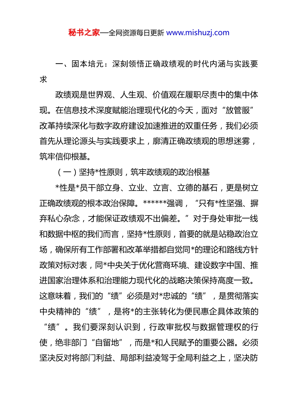 秘书之家—全网资源每日更新 www.mishuzj.com在市行政审批和政务信息管理局机关 2026 年全体干部政绩观教育大会上的*课讲稿同志们:今天,我们召开全局干部政绩观教育大会,旨在统一思想、深化认识、校准方向。当前,我市数字化转型迈入深水区,改革攻坚触及核心,政务服务优化面临更高要求,数据治理肩负更重责任。我们的工作直接关联市场主体活力、群众切身利益与政府运行效能,干部政绩观端正与否,关乎改革成败、民心向背与发展质量。******深刻指出,“树立和践行正确政绩观,起决定性作用的是*性。”*性坚强、信仰坚定,才能从思想深处解决好“为谁创造业绩、创造什么样的业绩、怎样创造业绩”的根本问题。我们必须清醒认识到,在行政审批制度改革与政务信息管理领域,任何偏离正确方向的“作为”,都可能异化为数字形式主义、信息壁垒或权力寻租,损害发展环境与政府公信力。因此,本次*课聚焦“树立和践行正确政绩观”核心主题,结合二十届中央纪委五次全会关于“深化整治形式主义、官僚主义”的部署要求,联系我局实际,进行深入阐述,引导全体干部自觉做正确政绩观的坚定信仰者、忠实践行者和有力维护者,以实干实绩服务高质量发展大局。秘书之家—全网资源每日更新 www.mishuzj.com一、固本培元:深刻领悟正确政绩观的时代内涵与实践要求政绩观是世界观、人生观、价值观在履职尽责中的集中体现。在信息技术深度赋能治理现代化的今天,面对“放管服”改革持续深化与数字政府建设加速推进的双重任务,我们必须首先从理论源头与实践要求上,廓清正确政绩观的思想迷雾,筑牢信仰根基。(一)坚持*性原则,筑牢政绩观的政治根基*性是*员干部立身、立业、立言、立德的基石,更是树立正确政绩观的根本政治保障。******强调,“只有*性坚强、摒弃私心杂念,才能保证政绩观不出偏差。”对于身处审批一线和数据中枢的我们而言,坚持*性原则,首要的就是站稳政治立场,确保所有工作部署和改革举措都自觉同*的理论和路线方针政策对标对表,同*中央关于优化营商环境、建设数字中国、推进国家治理体系和治理能力现代化的战略决策保持高度一致。这意味着,我们的“绩”必须是对*忠诚的“绩”,是贯彻落实中央精神的“绩”,是将*的主张转化为便民惠企具体政策的“绩”。我们要深刻认识到,行政审批权与数据管理权的行使,绝非部门“自留地”,而是*和人民赋予的重要公器。必须坚决反对将部门利益、局部利益凌驾于全局利益之上,坚决防秘书之家—全网资源每日更新 www.mishuzj.com止以技术复杂性掩盖政治判断力缺失,确保每一项审批创新、每一次数据共享、每一个系统建设,都服务于巩固*的执政基础、增进人民福祉这个最大政治。要在复杂的改革场景和利益调整中,始终保持政治上的清醒与坚定,使创造的所有政绩都经得起政治检验。(二)恪守人民立场,把准政绩观的出发点和落脚点政绩为谁而树,是政绩观的核心问题。******反复告诫,“共产*人必须牢记,为民造福是最大政绩。”行政审批和政务信息管理工作的本质是服务,服务对象是千千万万的企业和群众。因此,评判我们工作优劣、政绩大小的唯一标准,就是人民群众的满意度、获得感。这意味着,必须彻底扭转“唯上不唯下”、“重管理轻服务”、“看数据不看体验”等错误倾向。要始终将企业和群众的“急难愁盼”作为工作的“风向标”和“指挥棒”,把资源向提升办事便利度、破解“数字鸿沟”、保障数据安全与隐私等民生关切聚焦。例如,推进“一网通办”不是追求简单的线上迁移率,而是要真正解决跨部门、跨层级业务协同的堵点,让数据多跑路、群众少跑腿成为现实体验。优化审批流程不能停留在环节压缩的数字游戏,而要深入评估是否真正降低了制度性交易成本、激发了市场活力。要建立健全以用户评价、社会反馈为导向的绩效评估机秘书之家—全网资源每日更新 www.mishuzj.com制,让服务对象成为我们政绩最权威的“阅卷人”,确保我们的每一项努力都直抵民心、惠及民生。(三)遵循发展规律,夯实政绩观的科学基础创造经得起历史和实践检验的政绩,必须尊重客观规律,坚持实事求是。******指出,“干事创业一定要树立正确政绩观,做到...