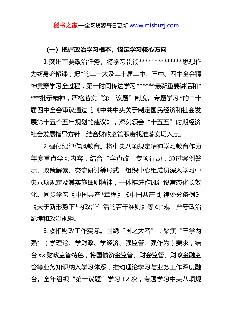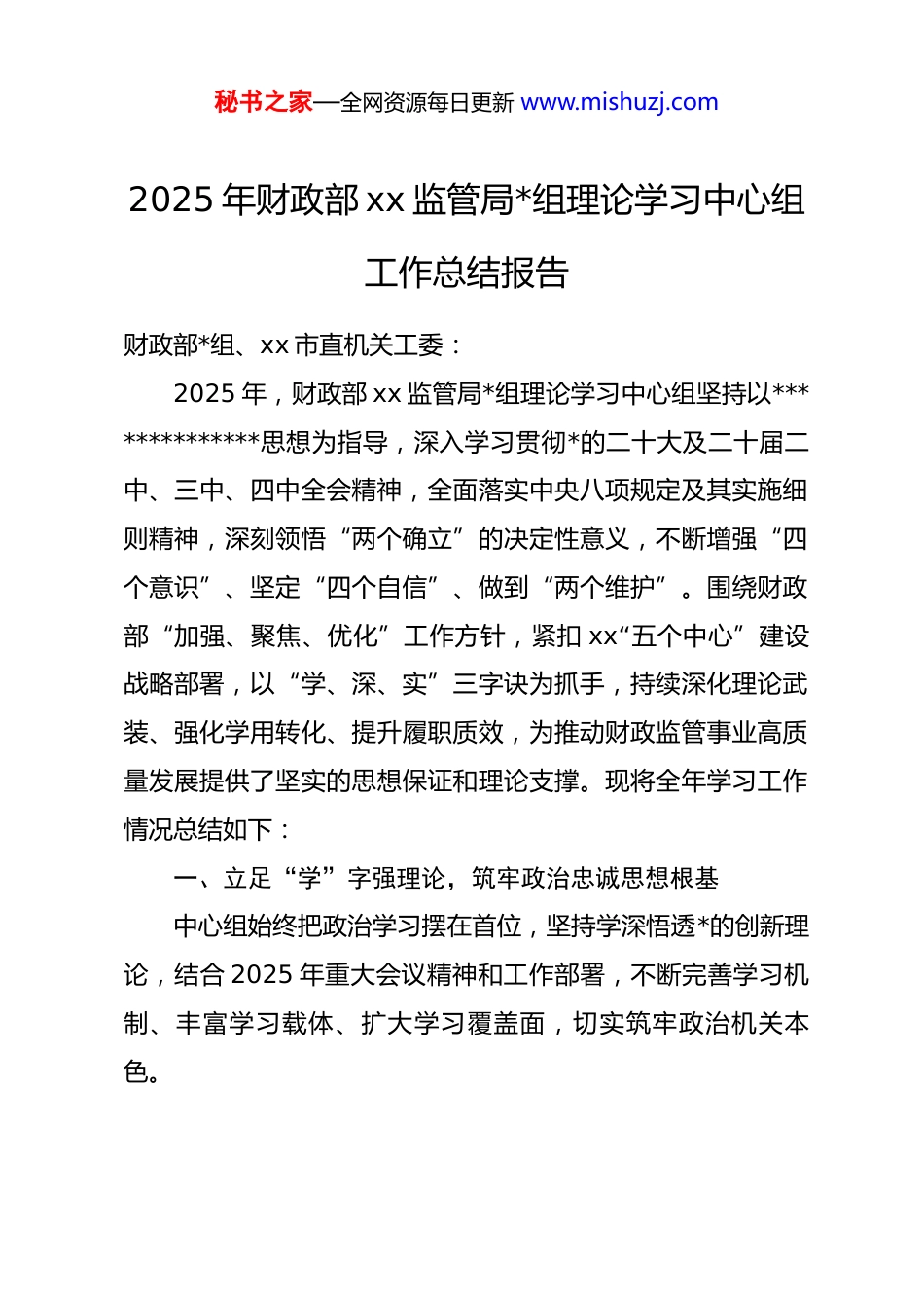 秘书之家—全网资源每日更新 www.mishuzj.com2025 年财政部 xx 监管局*组理论学习中心组工作总结报告财政部*组、xx 市直机关工委:2025 年,财政部 xx 监管局*组理论学习中心组坚持以**************思想为指导,深入学习贯彻*的二十大及二十届二中、三中、四中全会精神,全面落实中央八项规定及其实施细则精神,深刻领悟“两个确立”的决定性意义,不断增强“四个意识”、坚定“四个自信”、做到“两个维护”。围绕财政部“加强、聚焦、优化”工作方针,紧扣 xx“五个中心”建设战略部署,以“学、深、实”三字诀为抓手,持续深化理论武装、强化学用转化、提升履职质效,为推动财政监管事业高质量发展提供了坚实的思想保证和理论支撑。现将全年学习工作情况总结如下:一、立足“学”字强理论,筑牢政治忠诚思想根基中心组始终把政治学习摆在首位,坚持学深悟透*的创新理论,结合 2025 年重大会议精神和工作部署,不断完善学习机制、丰富学习载体、扩大学习覆盖面,切实筑牢政治机关本色。秘书之家—全网资源每日更新 www.mishuzj.com(一)把握政治学习根本,锚定学习核心方向1.突出首要政治任务。将学习贯彻**************思想作为终身必修课,把*的二十大及二十届二中、三中、四中全会精神贯穿学习全过程,第一时间传达学习******最新重要讲话和****批示精神,严格落实“第一议题”制度。专题学习*的二十届四中全会审议通过的《中共中央关于制定国民经济和社会发展第十五个五年规划的建议》,深刻领会“十五五”时期经济社会发展指导方针,结合财政监管职责找准落实切入点。2.强化纪律作风教育。将中央八项规定精神学习教育作为年度重点学习内容,结合“学查改”专项行动,通过案例警示、政策解读、交流研讨等形式,组织中心组成员深入学习中央八项规定及其实施细则精神,一体推进作风建设常态化长效化。同步学习《中国共产*章程》《中国共产 dj 律处分条例》《关于新形势下*内政治生活的若干准则》等 dj*规,严守政治纪律和政治规矩。3.紧扣财政工作实际。围绕“国之大者”,聚焦“三学两强”(学理论、学财政、学经济、强监管、强作为)要求,结合 xx 财政监管特色,将国债资金监管、财会监督、财政金融监管等业务知识纳入学习体系,推动理论学习与业务工作深度融合。全年组织“第一议题”学习 12 次,专题学习中央八项规秘书之家—全网资源每日更新 www.mishuzj.com定精神 3 次,*的二十届三中、四中全会精神专题研讨各 2 次,实现政治学习与业务学习同频共振。(二)突出示范引领作用,营造浓厚学习氛围1.压实第一责任人责任。局*组书记切实履行中心组学习第一责任人职责,带头讲*课 3 次,围绕“学习贯彻*的二十届四中全会精神推动财政监管提质增效”“强化作风建设严守纪律底线”等主题作专题发言,撰写《在推进中国式现代化中彰显财政监管担当》《深化作风建设提升监管效能》等理论文章 4篇,带动中心组成员形成“带头学、深入研、扎实干”的良好风气。2.发挥“关键少数”表率作用。中心组成员结合分管领域,带头开展领学导学,在读书班、研讨会上逐个领读原著原文,分享学习体会。纪检组长带头学习中央纪委、驻部纪检监察组部署要求,围绕“警示教育”主题带头汇报“三个必须”执行情况,推动纪律教育向全局延伸。全年举办中心组读书班4 期,中心组成员累计作重点发言 36 人次,交流学习心得 28篇。3.构建层级联动学习机制。以中心组学习为引领,建立“中心组—*支部—青年干部”三级读书班机制,吸纳*支部书记、青年干部代表参加中心组学习 16 人次。创新搭建“青年秘书之家—全网资源每日更新 www.mishuzj.com论坛”、财政监管案例分享平台,用好“结对帮带”制度,推动理论学习覆盖全局干部职工,形成上下联动、全员参与的学习格局。(三)科学抓实学习管理,提升学习规范化水平1.完善学习制度体系。严格落实《关于进一步提高*委(*组)理论学习中心组学习质量的意见》,制定 2025 年中心组学习计划,明确学习主题、学习内容、学习形式和时间安排,坚持“年初有计划、季度有研讨、年终有总结,会前有议程、会中有发言、会后有纪...