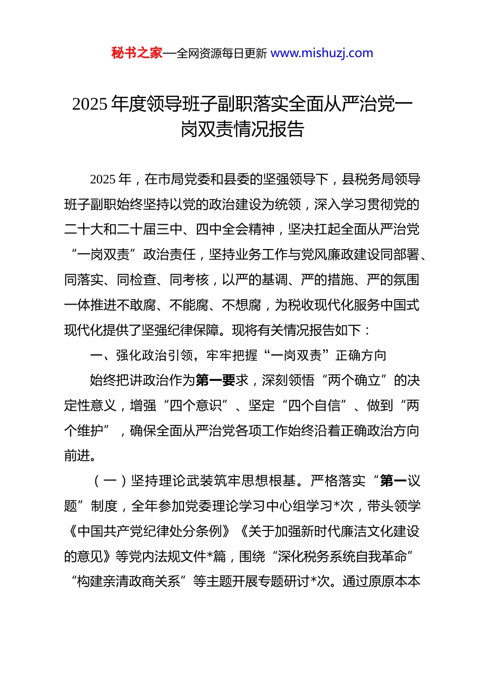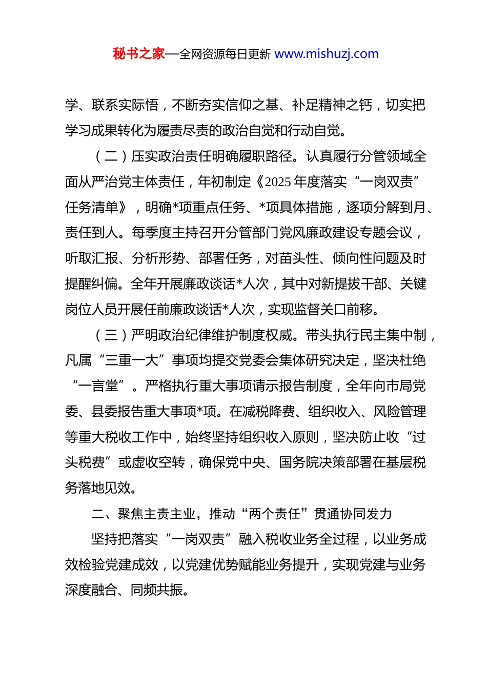 秘书之家—全网资源每日更新 www.mishuzj.com2025 年度领导班子副职落实全面从严治党一岗双责情况报告 2025 年,在市局党委和县委的坚强领导下,县税务局领导班子副职始终坚持以党的政治建设为统领,深入学习贯彻党的二十大和二十届三中、四中全会精神,坚决扛起全面从严治党“一岗双责”政治责任,坚持业务工作与党风廉政建设同部署、同落实、同检查、同考核,以严的基调、严的措施、严的氛围一体推进不敢腐、不能腐、不想腐,为税收现代化服务中国式现代化提供了坚强纪律保障。现将有关情况报告如下:一、强化政治引领,牢牢把握“一岗双责”正确方向始终把讲政治作为第一要求,深刻领悟“两个确立”的决定性意义,增强“四个意识”、坚定“四个自信”、做到“两个维护”,确保全面从严治党各项工作始终沿着正确政治方向前进。(一)坚持理论武装筑牢思想根基。严格落实“第一议题”制度,全年参加党委理论学习中心组学习*次,带头领学《中国共产党纪律处分条例》《关于加强新时代廉洁文化建设的意见》等党内法规文件*篇,围绕“深化税务系统自我革命”“构建亲清政商关系”等主题开展专题研讨*次。通过原原本本秘书之家—全网资源每日更新 www.mishuzj.com学、联系实际悟,不断夯实信仰之基、补足精神之钙,切实把学习成果转化为履责尽责的政治自觉和行动自觉。(二)压实政治责任明确履职路径。认真履行分管领域全面从严治党主体责任,年初制定《2025 年度落实“一岗双责”任务清单》,明确*项重点任务、*项具体措施,逐项分解到月、责任到人。每季度主持召开分管部门党风廉政建设专题会议,听取汇报、分析形势、部署任务,对苗头性、倾向性问题及时提醒纠偏。全年开展廉政谈话*人次,其中对新提拔干部、关键岗位人员开展任前廉政谈话*人次,实现监督关口前移。(三)严明政治纪律维护制度权威。带头执行民主集中制,凡属“三重一大”事项均提交党委会集体研究决定,坚决杜绝“一言堂”。严格执行重大事项请示报告制度,全年向市局党委、县委报告重大事项*项。在减税降费、组织收入、风险管理等重大税收工作中,始终坚持组织收入原则,坚决防止收“过头税费”或虚收空转,确保党中央、国务院决策部署在基层税务落地见效。二、聚焦主责主业,推动“两个责任”贯通协同发力坚持把落实“一岗双责”融入税收业务全过程,以业务成效检验党建成效,以党建优势赋能业务提升,实现党建与业务深度融合、同频共振。秘书之家—全网资源每日更新 www.mishuzj.com(一)在组织收入中严守纪律红线。面对经济下行压力加大、减税降费政策叠加等复杂形势,坚决贯彻组织收入原则,科学研判收入形势,依法依规组织税费收入*亿元,完成年度计划的*%。在收入调度中,严禁下达不切实际的任务指标,严禁采取“寅吃卯粮”“预征缓缴”等违规手段,确保收入质量真实可靠。同步加强对收入异常波动地区的督导检查,约谈相关分局负责人*人次,有效防范执法风险和廉政风险。(二)在优化服务中践行初心使命。聚焦纳税人缴费人“急难愁盼”,牵头推进“便民办税春风行动”,推动*项高频业务实现“掌上办”“跨域办”,全县平均办税时长压缩至*分钟。在落实大规模增值税留抵退税政策中,建立“快审快退+风险防控”双轮驱动机制,全年办理留抵退税*亿元,惠及企业*户。同时,严查内外勾结骗取退税等违法行为,移交纪检部门问题线索*条,切实守护国家税款安全。(三)在风险管理中扎紧制度笼子。针对发票管理、出口退税、土地增值税清算等高风险领域,牵头修订《税收执法风险防控指引》,细化*类*项风险点防控措施。运用税收大数据开展疑点筛查,全年推送风险任务*批次,核查补税*万元。在土地增值税清算专项工作中,实行“双随机、一公开”选案机制,邀请第三方机构参与评估,全程留痕、阳光操作,有效防秘书之家—全网资源每日更新 www.mishuzj.com范自由裁量权滥用。三、突出严管厚爱,锻造忠诚干净担当税务铁军坚持严管就是厚爱,把队伍建设作为落实“一岗双责”的基础工程,既抓业务能力提升,更抓纪律作风养成,着力打造让党放心、人民满意的税务铁军。(一)抓实日常教育筑牢廉洁防线。结合党纪学...