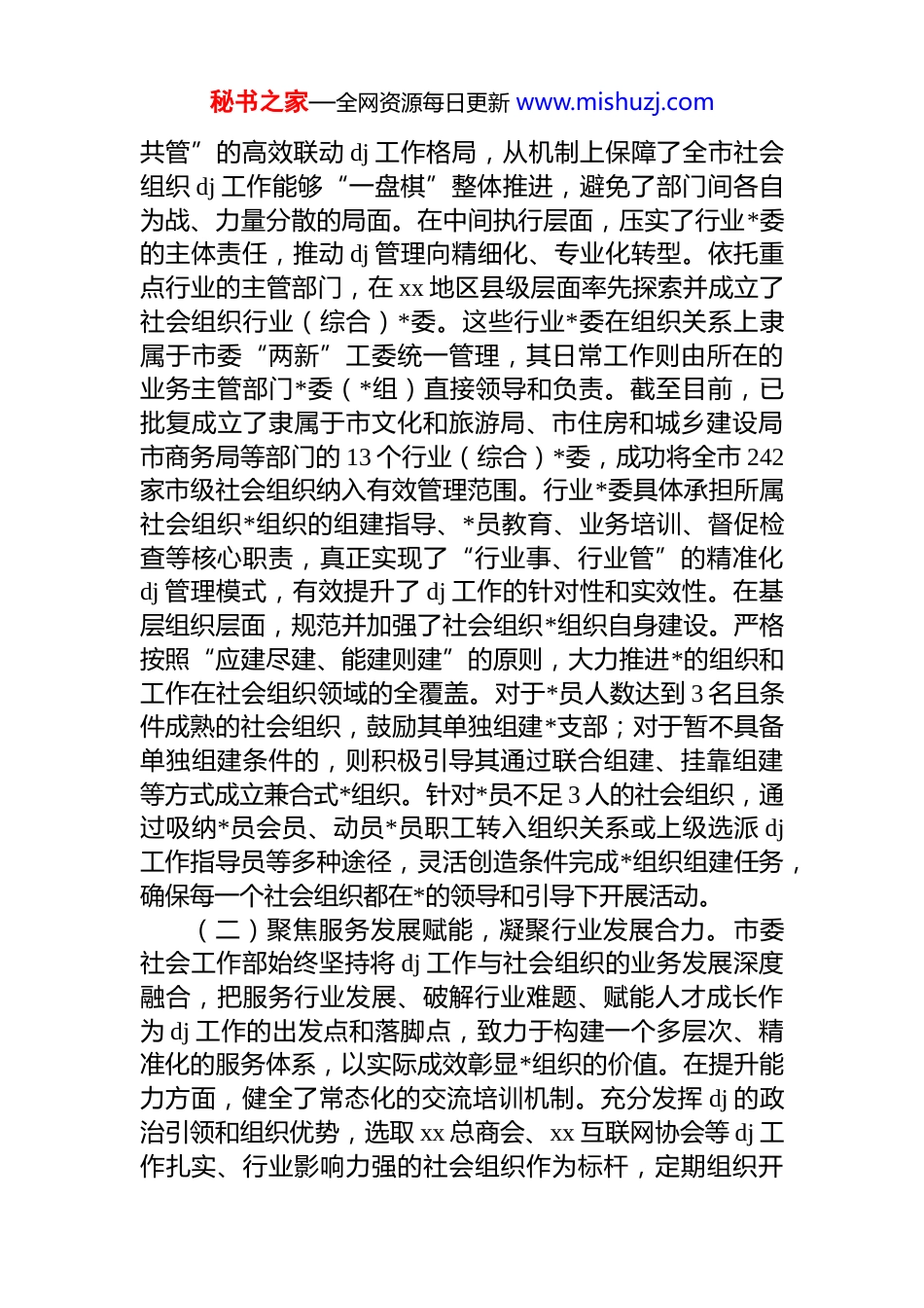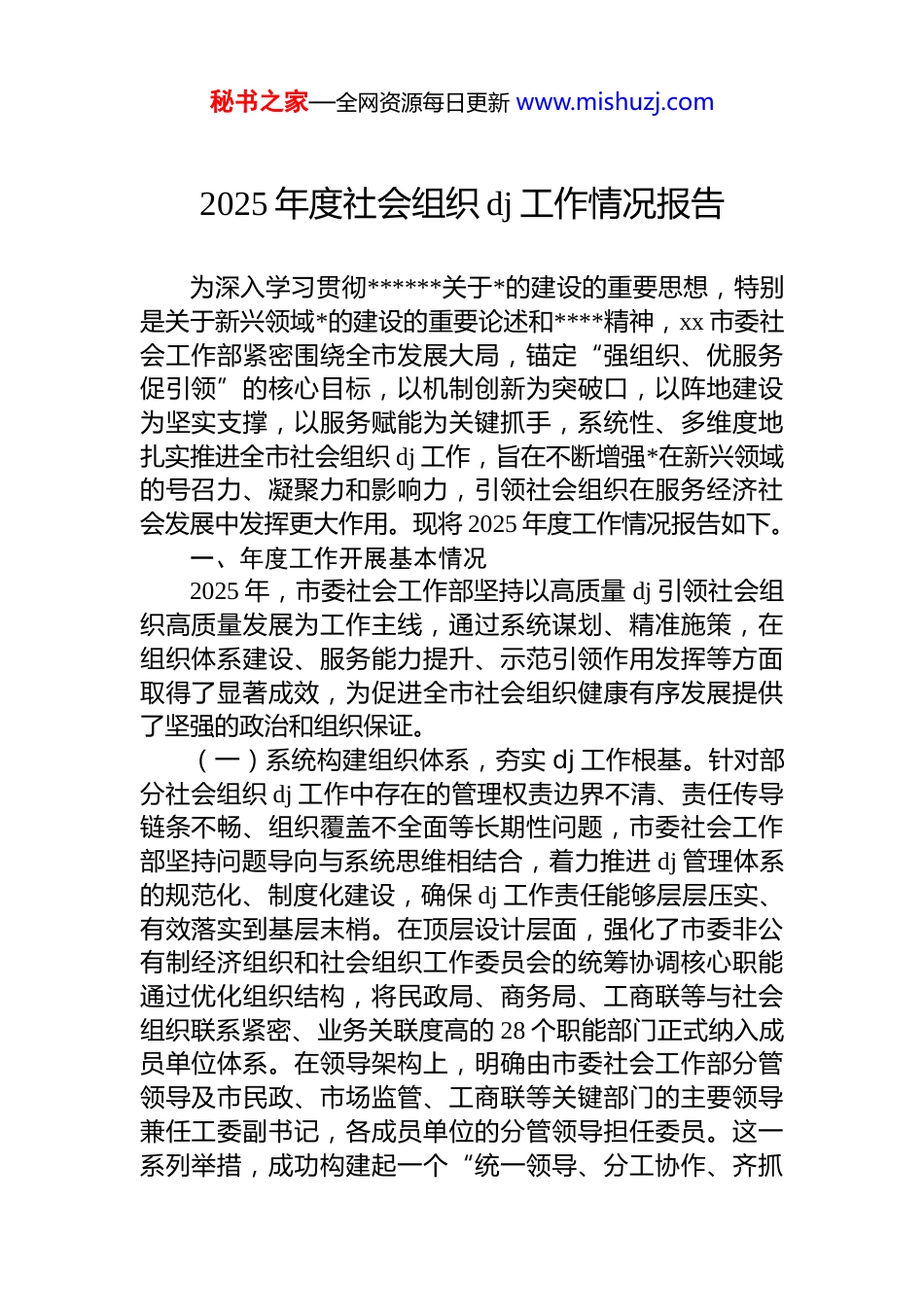 秘书之家—全网资源每日更新 www.mishuzj.com2025 年度社会组织 dj 工作情况报告为深入学习贯彻******关于*的建设的重要思想,特别是关于新兴领域*的建设的重要论述和****精神,xx 市委社会工作部紧密围绕全市发展大局,锚定“强组织、优服务促引领”的核心目标,以机制创新为突破口,以阵地建设为坚实支撑,以服务赋能为关键抓手,系统性、多维度地扎实推进全市社会组织 dj 工作,旨在不断增强*在新兴领域的号召力、凝聚力和影响力,引领社会组织在服务经济社会发展中发挥更大作用。现将 2025 年度工作情况报告如下。一、年度工作开展基本情况2025 年,市委社会工作部坚持以高质量 dj 引领社会组织高质量发展为工作主线,通过系统谋划、精准施策,在组织体系建设、服务能力提升、示范引领作用发挥等方面取得了显著成效,为促进全市社会组织健康有序发展提供了坚强的政治和组织保证。(一)系统构建组织体系,夯实 dj 工作根基。针对部分社会组织 dj 工作中存在的管理权责边界不清、责任传导链条不畅、组织覆盖不全面等长期性问题,市委社会工作部坚持问题导向与系统思维相结合,着力推进 dj 管理体系的规范化、制度化建设,确保 dj 工作责任能够层层压实、有效落实到基层末梢。在顶层设计层面,强化了市委非公有制经济组织和社会组织工作委员会的统筹协调核心职能通过优化组织结构,将民政局、商务局、工商联等与社会组织联系紧密、业务关联度高的 28 个职能部门正式纳入成员单位体系。在领导架构上,明确由市委社会工作部分管领导及市民政、市场监管、工商联等关键部门的主要领导兼任工委副书记,各成员单位的分管领导担任委员。这一系列举措,成功构建起一个“统一领导、分工协作、齐抓秘书之家—全网资源每日更新 www.mishuzj.com共管”的高效联动 dj 工作格局,从机制上保障了全市社会组织 dj 工作能够“一盘棋”整体推进,避免了部门间各自为战、力量分散的局面。在中间执行层面,压实了行业*委的主体责任,推动 dj 管理向精细化、专业化转型。依托重点行业的主管部门,在 xx 地区县级层面率先探索并成立了社会组织行业(综合)*委。这些行业*委在组织关系上隶属于市委“两新”工委统一管理,其日常工作则由所在的业务主管部门*委(*组)直接领导和负责。截至目前,已批复成立了隶属于市文化和旅游局、市住房和城乡建设局市商务局等部门的 13 个行业(综合)*委,成功将全市 242家市级社会组织纳入有效管理范围。行业*委具体承担所属社会组织*组织的组建指导、*员教育、业务培训、督促检查等核心职责,真正实现了“行业事、行业管”的精准化dj 管理模式,有效提升了 dj 工作的针对性和实效性。在基层组织层面,规范并加强了社会组织*组织自身建设。严格按照“应建尽建、能建则建”的原则,大力推进*的组织和工作在社会组织领域的全覆盖。对于*员人数达到 3 名且条件成熟的社会组织,鼓励其单独组建*支部;对于暂不具备单独组建条件的,则积极引导其通过联合组建、挂靠组建等方式成立兼合式*组织。针对*员不足 3 人的社会组织,通过吸纳*员会员、动员*员职工转入组织关系或上级选派 dj工作指导员等多种途径,灵活创造条件完成*组织组建任务,确保每一个社会组织都在*的领导和引导下开展活动。(二)聚焦服务发展赋能,凝聚行业发展合力。市委社会工作部始终坚持将 dj 工作与社会组织的业务发展深度融合,把服务行业发展、破解行业难题、赋能人才成长作为 dj 工作的出发点和落脚点,致力于构建一个多层次、精准化的服务体系,以实际成效彰显*组织的价值。在提升能力方面,健全了常态化的交流培训机制。充分发挥 dj 的政治引领和组织优势,选取 xx 总商会、xx 互联网协会等 dj 工作扎实、行业影响力强的社会组织作为标杆,定期组织开秘书之家—全网资源每日更新 www.mishuzj.com展跨行业、跨领域的经验交流活动,促进各社会组织之间进行资源整合与优势互补。同时,为提升社会组织*务工作者的专业能力和实务水平,同步举办了多期新兴领域 dj 工作专题培训班。培训内容涵盖理论学习、政策解读、实务操作等,形式上结合了...