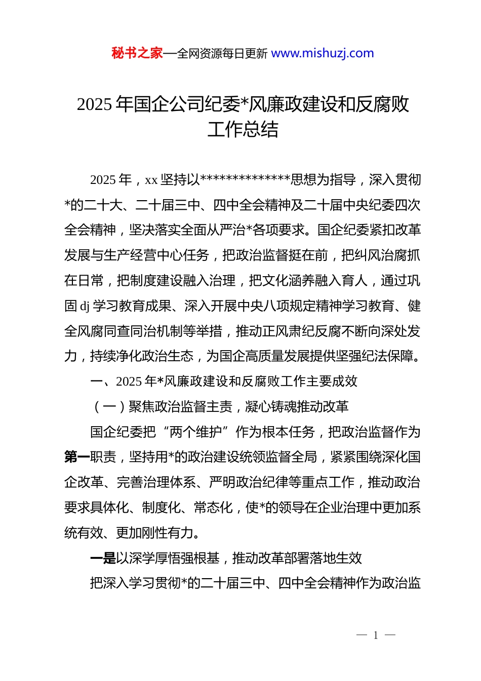 秘书之家—全网资源每日更新 www.mishuzj.com2025 年国企公司纪委*风廉政建设和反腐败工作总结2025 年,xx 坚持以**************思想为指导,深入贯彻*的二十大、二十届三中、四中全会精神及二十届中央纪委四次全会精神,坚决落实全面从严治*各项要求。国企纪委紧扣改革发展与生产经营中心任务,把政治监督挺在前,把纠风治腐抓在日常,把制度建设融入治理,把文化涵养融入育人,通过巩固 dj 学习教育成果、深入开展中央八项规定精神学习教育、健全风腐同查同治机制等举措,推动正风肃纪反腐不断向深处发力,持续净化政治生态,为国企高质量发展提供坚强纪法保障。一、2025 年*风廉政建设和反腐败工作主要成效(一)聚焦政治监督主责,凝心铸魂推动改革国企纪委把“两个维护”作为根本任务,把政治监督作为第一职责,坚持用*的政治建设统领监督全局,紧紧围绕深化国企改革、完善治理体系、严明政治纪律等重点工作,推动政治要求具体化、制度化、常态化,使*的领导在企业治理中更加系统有效、更加刚性有力。一是以深学厚悟强根基,推动改革部署落地生效把深入学习贯彻*的二十届三中、四中全会精神作为政治监— 1 —秘书之家—全网资源每日更新 www.mishuzj.com督的关键内容,推动企业*委把政治要求融入重大决策、治理结构和改革措施之中。*委理论学习中心组全年举办封闭式专题研讨班 x 期,邀请省级专家授课、案例剖析、互动问答,真正做到“学在关键处、悟在根本上”。中心组成员累计撰写心得体会超 x 万字,并结合主业实际制定《贯彻落实二十届四中全会精神重点任务方案》,设置 xx 项重点任务、明确责任单位与完成时限,形成“任务清单化、推进项目化、督查闭环化”的执行体系,推动改革部署从文件精神转化为具体治理举措、管控规则与制度安排。二是以纠风治弊固作风,推动八项规定精神常态长效将深入贯彻中央八项规定精神学习教育纳入年度政治任务制订并实施“学习—查摆—整治—巩固”四段式闭环推进机制,从思想根源、制度执行、行为表现三个层面整治“四风”突出问题。学习教育自 3 月至 7 月持续推进,累计组织全覆盖学习教育 xxx 余人次,观看警示片 xx 场次,并同步形成整改台账,清理“文山会海”“过度调研”等顽疾,完成整改 xx 项。通过“日常监督+专项整治+节点提醒”联动措施,把纠治“四风”由“节假日式整治”转变为“全周期严管”,推动作风建设由集中治理走向长效常治。三是以纪法学习促严管,推动纪律教育走深走实— 2 —秘书之家—全网资源每日更新 www.mishuzj.com持续巩固 dj 学习教育成果,坚持用《条例》校准行为、用制度规范用权、用案例警示干部。全年举办纪律专题培训 x 期,覆盖中层及重点岗位人员 xxx 人次,组织开展“纪律在我心中”竞赛评选“纪律标兵”xx 人,形成“以先进促自律”的内部激励机制。对新提拔、新入职、新转正“三新”群体开展全链条纪律教育,xx 人次赴廉政教育基地接受沉浸式学习,推动“从入职第一天起讲规矩、从岗位第一步开始守底线”。通过“制度教育+案例教育+警示教育”组合拳,使纪律要求真正内化为从业惯性,转化为治理效能。(二)健全风腐同查同治,一体推进正风反腐国企纪委坚持惩治与治理并重、查处与预防同步,聚焦国企运行链条长、资金密集、资源集中等特点,把风腐同查、系统治理、制度堵漏贯通起来,以精准监督治理“关键少数”、以严厉执纪震慑“关键领域”,推动从“查个案”向“治系统”、从“抓当下”向“管长远”深度转变,实现正风肃纪与反腐惩恶协同发力。一是以专项监督破顽疾,严惩风腐交织突出问题聚焦工程建设、物资采购、金融投资等高风险领域,组建由纪检、审计、法律、财务等部门组成的 x 支专项监督力量,共 xx 名业务骨干联合开展“清风护航”专项监督。监督持续三— 3 —秘书之家—全网资源每日更新 www.mishuzj.com个月,检查项目 xx 个、审阅合同 xxx 份、调阅财务凭证近万张,精准发现围标串标、虚增工程量、违规转分包、利益输送等风腐交织问题线索 x 起。对违纪行为快查快结,依规依纪处分 x人、组织处理 x 人,x 人被移送司法机...