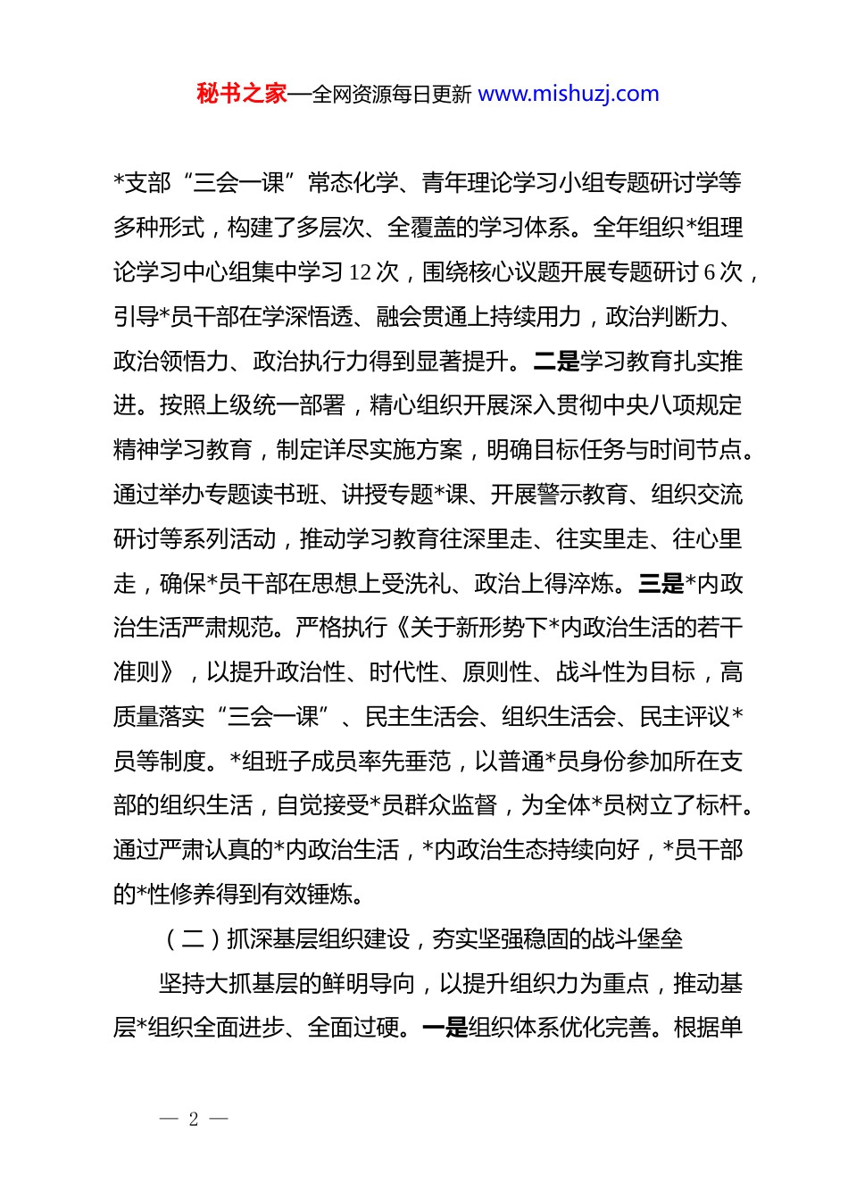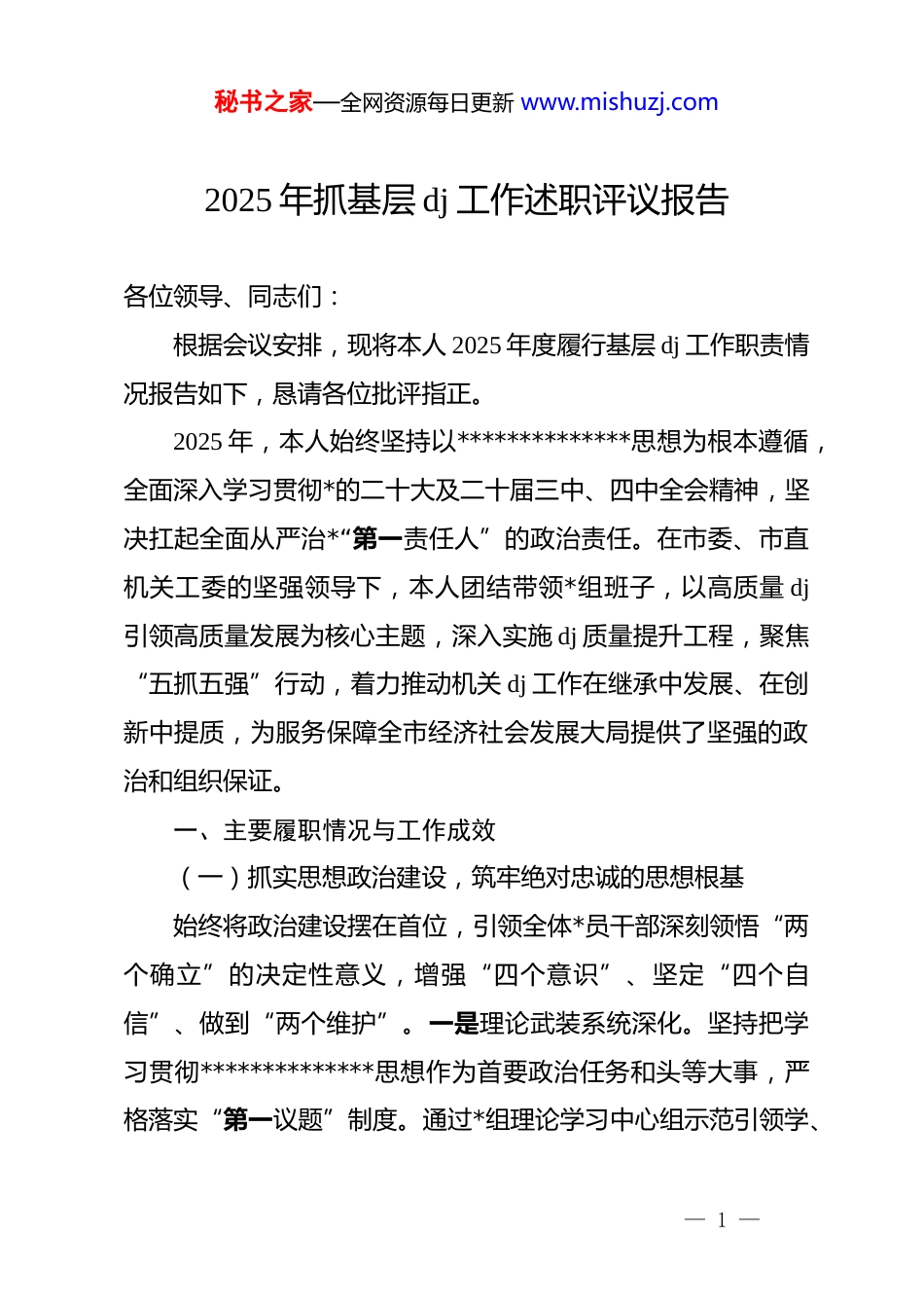秘书之家—全网资源每日更新 www.mishuzj.com2025 年抓基层 dj 工作述职评议报告各位领导、同志们:根据会议安排,现将本人 2025 年度履行基层 dj 工作职责情况报告如下,恳请各位批评指正。2025 年,本人始终坚持以**************思想为根本遵循,全面深入学习贯彻*的二十大及二十届三中、四中全会精神,坚决扛起全面从严治*“第一责任人”的政治责任。在市委、市直机关工委的坚强领导下,本人团结带领*组班子,以高质量 dj引领高质量发展为核心主题,深入实施 dj 质量提升工程,聚焦“五抓五强”行动,着力推动机关 dj 工作在继承中发展、在创新中提质,为服务保障全市经济社会发展大局提供了坚强的政治和组织保证。一、主要履职情况与工作成效(一)抓实思想政治建设,筑牢绝对忠诚的思想根基始终将政治建设摆在首位,引领全体*员干部深刻领悟“两个确立”的决定性意义,增强“四个意识”、坚定“四个自信”、做到“两个维护”。一是理论武装系统深化。坚持把学习贯彻**************思想作为首要政治任务和头等大事,严格落实“第一议题”制度。通过*组理论学习中心组示范引领学、— 1 —秘书之家—全网资源每日更新 www.mishuzj.com*支部“三会一课”常态化学、青年理论学习小组专题研讨学等多种形式,构建了多层次、全覆盖的学习体系。全年组织*组理论学习中心组集中学习 12 次,围绕核心议题开展专题研讨 6 次,引导*员干部在学深悟透、融会贯通上持续用力,政治判断力、政治领悟力、政治执行力得到显著提升。二是学习教育扎实推进。按照上级统一部署,精心组织开展深入贯彻中央八项规定精神学习教育,制定详尽实施方案,明确目标任务与时间节点。通过举办专题读书班、讲授专题*课、开展警示教育、组织交流研讨等系列活动,推动学习教育往深里走、往实里走、往心里走,确保*员干部在思想上受洗礼、政治上得淬炼。三是*内政治生活严肃规范。严格执行《关于新形势下*内政治生活的若干准则》,以提升政治性、时代性、原则性、战斗性为目标,高质量落实“三会一课”、民主生活会、组织生活会、民主评议*员等制度。*组班子成员率先垂范,以普通*员身份参加所在支部的组织生活,自觉接受*员群众监督,为全体*员树立了标杆。通过严肃认真的*内政治生活,*内政治生态持续向好,*员干部的*性修养得到有效锤炼。(二)抓深基层组织建设,夯实坚强稳固的战斗堡垒坚持大抓基层的鲜明导向,以提升组织力为重点,推动基层*组织全面进步、全面过硬。一是组织体系优化完善。根据单— 2 —秘书之家—全网资源每日更新 www.mishuzj.com位内部机构调整和人员变动情况,及时对基层*组织设置进行动态优化,确保*的组织和*的工作无死角、全覆盖。加强对不同类型*支部的分类指导和精准施策,制定差异化工作目标与考核标准,推动各支部在标准化规范化建设基础上,打造各具特色的 dj 品牌。二是支部建设提质增效。深入开展“五好*支部”创建活动,以*支部标准化规范化建设为抓手,全面提升支部建设质量。定期举办*支部书记和*务干部专题培训班,着力提升其履职能力和专业素养。在工作中,探索并推广了“*员积分制”管理模式,该模式以*支部为单位组织实施积分由基础分、履职分和负面清单扣分构成将*员的日常表现和先锋模范作用进行量化考核,并将积分结果作为民主评议、评先树优、绩效考核的重要依据有效激发了*员队伍的内生动力。三是*员队伍管理精细严格。始终把政治标准放在首位,严格执行*员发展程序,优化*员队伍结构,全年共发展*员 13 名,为*组织注入了新鲜血液。加强对入*积极分子的全过程培养考察,确保发展*员质量。强化*员日常教育管理,完善*员关怀帮扶机制,通过政治上关怀、工作上支持、生活上关心,增强了*员的归属感、荣誉感和责任感。(三)抓牢干部队伍建设,锻造堪当重任的骨干力量坚持*管干部原则,着力建设一支政治过硬、本领高强、作— 3 —秘书之家—全网资源每日更新 www.mishuzj.com风优良的高素质专业化干部队伍。一是干部教育培训精准有效。紧密围绕中心工作和干部履职需求,制定并实施年度干部教育培训计划。通过“请进来”与“走出去”...