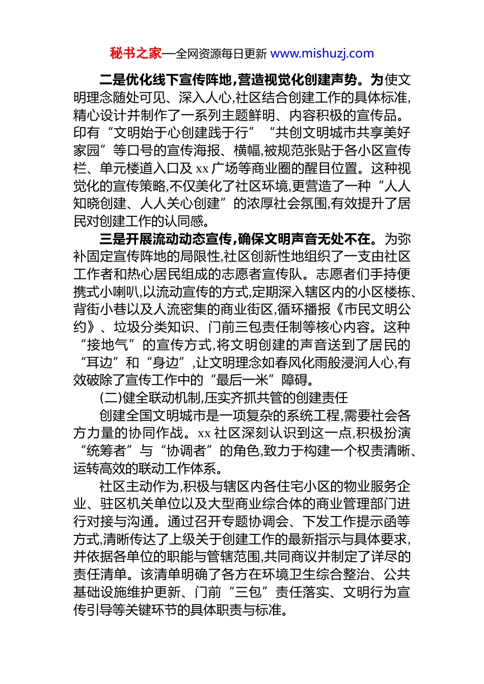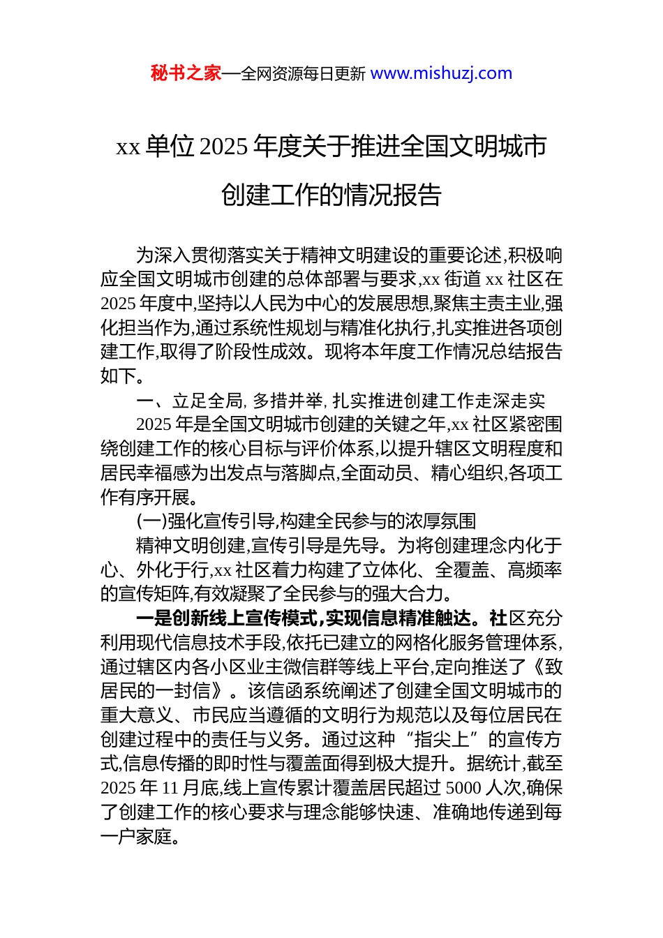 秘书之家—全网资源每日更新 www.mishuzj.comxx 单位 2025 年度关于推进全国文明城市创建工作的情况报告为深入贯彻落实关于精神文明建设的重要论述,积极响应全国文明城市创建的总体部署与要求,xx 街道 xx 社区在2025 年度中,坚持以人民为中心的发展思想,聚焦主责主业,强化担当作为,通过系统性规划与精准化执行,扎实推进各项创建工作,取得了阶段性成效。现将本年度工作情况总结报告如下。一、立足全局,多措并举,扎实推进创建工作走深走实2025 年是全国文明城市创建的关键之年,xx 社区紧密围绕创建工作的核心目标与评价体系,以提升辖区文明程度和居民幸福感为出发点与落脚点,全面动员、精心组织,各项工作有序开展。(一)强化宣传引导,构建全民参与的浓厚氛围精神文明创建,宣传引导是先导。为将创建理念内化于心、外化于行,xx 社区着力构建了立体化、全覆盖、高频率的宣传矩阵,有效凝聚了全民参与的强大合力。一是创新线上宣传模式,实现信息精准触达。社区充分利用现代信息技术手段,依托已建立的网格化服务管理体系,通过辖区内各小区业主微信群等线上平台,定向推送了《致居民的一封信》。该信函系统阐述了创建全国文明城市的重大意义、市民应当遵循的文明行为规范以及每位居民在创建过程中的责任与义务。通过这种“指尖上”的宣传方式,信息传播的即时性与覆盖面得到极大提升。据统计,截至2025 年 11 月底,线上宣传累计覆盖居民超过 5000 人次,确保了创建工作的核心要求与理念能够快速、准确地传递到每一户家庭。秘书之家—全网资源每日更新 www.mishuzj.com二是优化线下宣传阵地,营造视觉化创建声势。为使文明理念随处可见、深入人心,社区结合创建工作的具体标准,精心设计并制作了一系列主题鲜明、内容积极的宣传品。印有“文明始于心创建践于行”“共创文明城市共享美好家园”等口号的宣传海报、横幅,被规范张贴于各小区宣传栏、单元楼道入口及 xx 广场等商业圈的醒目位置。这种视觉化的宣传策略,不仅美化了社区环境,更营造了一种“人人知晓创建、人人关心创建”的浓厚社会氛围,有效提升了居民对创建工作的认同感。三是开展流动动态宣传,确保文明声音无处不在。为弥补固定宣传阵地的局限性,社区创新性地组织了一支由社区工作者和热心居民组成的志愿者宣传队。志愿者们手持便携式小喇叭,以流动宣传的方式,定期深入辖区内的小区楼栋、背街小巷以及人流密集的商业街区,循环播报《市民文明公约》、垃圾分类知识、门前三包责任制等核心内容。这种“接地气”的宣传方式,将文明创建的声音送到了居民的“耳边”和“身边”,让文明理念如春风化雨般浸润人心,有效破除了宣传工作中的“最后一米”障碍。(二)健全联动机制,压实齐抓共管的创建责任创建全国文明城市是一项复杂的系统工程,需要社会各方力量的协同作战。xx 社区深刻认识到这一点,积极扮演“统筹者”与“协调者”的角色,致力于构建一个权责清晰、运转高效的联动工作体系。社区主动作为,积极与辖区内各住宅小区的物业服务企业、驻区机关单位以及大型商业综合体的商业管理部门进行对接与沟通。通过召开专题协调会、下发工作提示函等方式,清晰传达了上级关于创建工作的最新指示与具体要求,并依据各单位的职能与管辖范围,共同商议并制定了详尽的责任清单。该清单明确了各方在环境卫生综合整治、公共基础设施维护更新、门前“三包”责任落实、文明行为宣传引导等关键环节的具体职责与标准。秘书之家—全网资源每日更新 www.mishuzj.com在此基础上,一个“社区统筹、多方联动、各司其职、协同推进”的长效工作机制逐步建立并完善。社区作为中枢,负责整体规划、任务分解与督导检查;物业公司负责小区内部的环境保洁与秩序维护;驻区单位负责管理好自身院落及周边环境;商业管理部门则负责维护商圈的经营秩序与文明形象。这一机制的建立,有效避免了过去工作中可能出现的职责不清、推诿扯皮等现象,形成了“一块地、一个标准、一体管理”的良好局面,确保了创建工作的各项任务能够层层压实、落实到人。(三)聚焦重点难点,提升辖区环境的整体面貌以创建工作为契机,xx 社区坚持问题导向,集中力量解决了一批长期困扰居民的环境“顽疾...