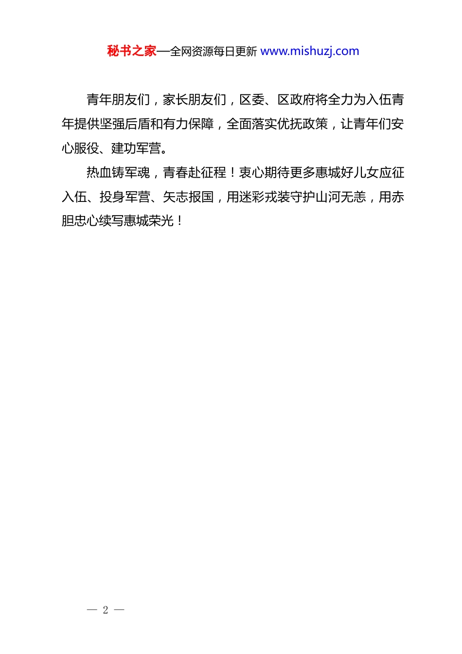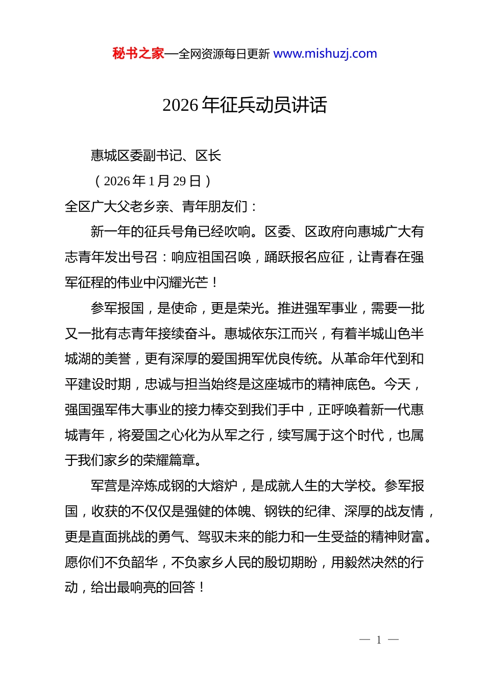 秘书之家—全网资源每日更新 www.mishuzj.com2026 年征兵动员讲话惠城区委副书记、区长(2026 年 1 月 29 日)全区广大父老乡亲、青年朋友们:新一年的征兵号角已经吹响。区委、区政府向惠城广大有志青年发出号召:响应祖国召唤,踊跃报名应征,让青春在强军征程的伟业中闪耀光芒!参军报国,是使命,更是荣光。推进强军事业,需要一批又一批有志青年接续奋斗。惠城依东江而兴,有着半城山色半城湖的美誉,更有深厚的爱国拥军优良传统。从革命年代到和平建设时期,忠诚与担当始终是这座城市的精神底色。今天,强国强军伟大事业的接力棒交到我们手中,正呼唤着新一代惠城青年,将爱国之心化为从军之行,续写属于这个时代,也属于我们家乡的荣耀篇章。军营是淬炼成钢的大熔炉,是成就人生的大学校。参军报国,收获的不仅仅是强健的体魄、钢铁的纪律、深厚的战友情,更是直面挑战的勇气、驾驭未来的能力和一生受益的精神财富。愿你们不负韶华,不负家乡人民的殷切期盼,用毅然决然的行动,给出最响亮的回答!— 1 —秘书之家—全网资源每日更新 www.mishuzj.com青年朋友们,家长朋友们,区委、区政府将全力为入伍青年提供坚强后盾和有力保障,全面落实优抚政策,让青年们安心服役、建功军营。热血铸军魂,青春赴征程!衷心期待更多惠城好儿女应征入伍、投身军营、矢志报国,用迷彩戎装守护山河无恙,用赤胆忠心续写惠城荣光!— 2 —