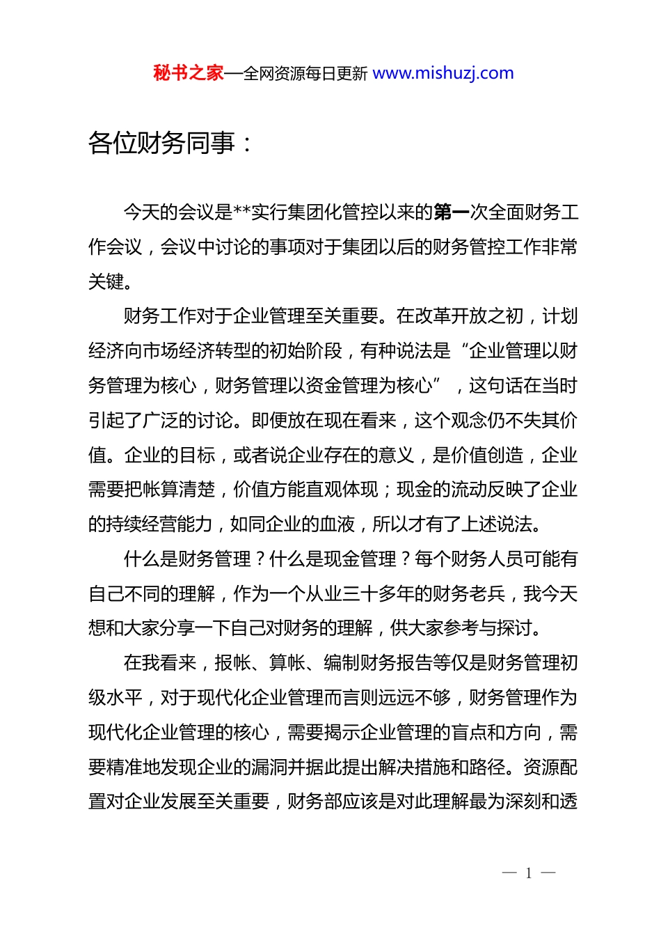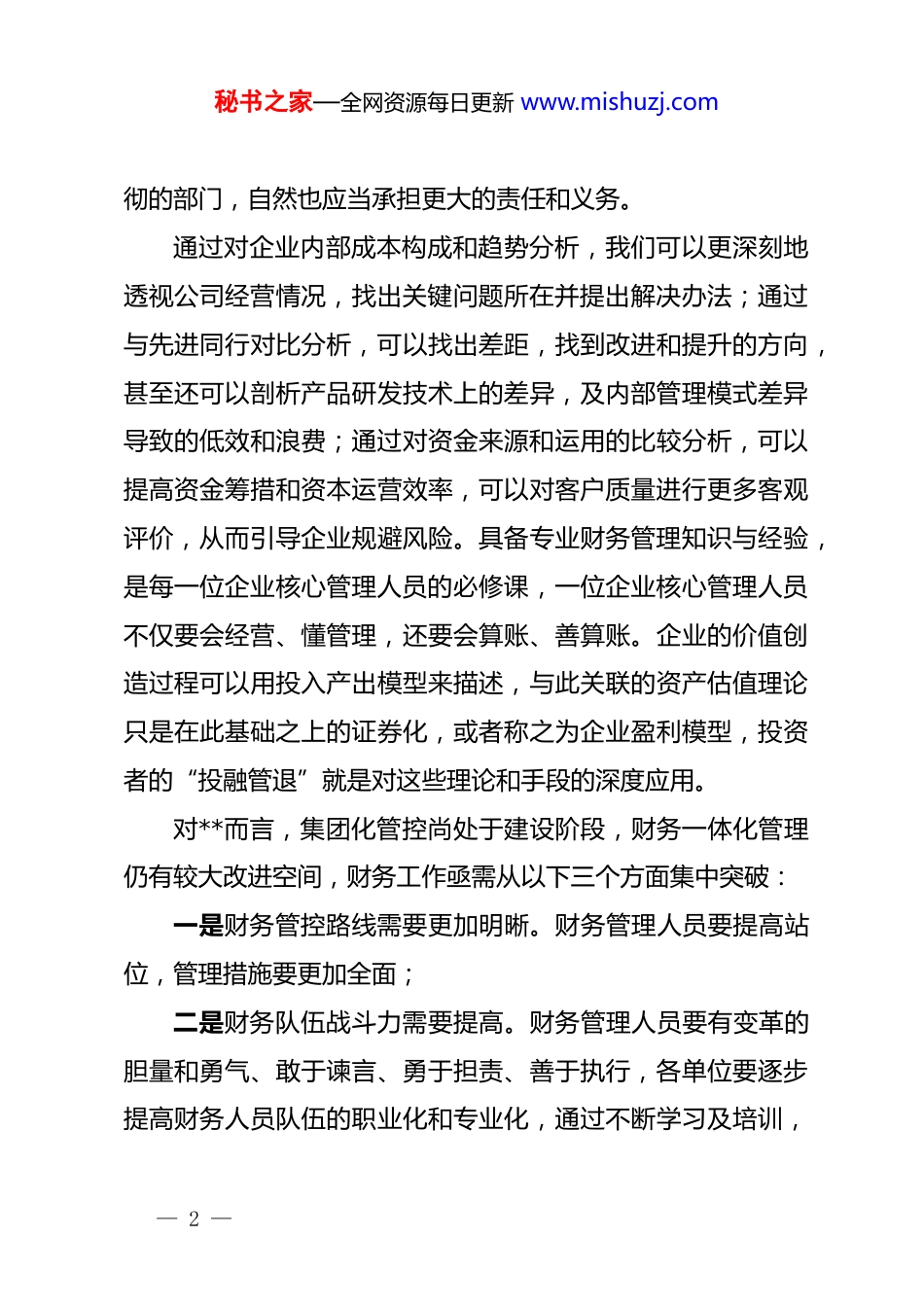 秘书之家—全网资源每日更新 www.mishuzj.com各位财务同事:今天的会议是**实行集团化管控以来的第一次全面财务工作会议,会议中讨论的事项对于集团以后的财务管控工作非常关键。财务工作对于企业管理至关重要。在改革开放之初,计划经济向市场经济转型的初始阶段,有种说法是“企业管理以财务管理为核心,财务管理以资金管理为核心”,这句话在当时引起了广泛的讨论。即便放在现在看来,这个观念仍不失其价值。企业的目标,或者说企业存在的意义,是价值创造,企业需要把帐算清楚,价值方能直观体现;现金的流动反映了企业的持续经营能力,如同企业的血液,所以才有了上述说法。什么是财务管理?什么是现金管理?每个财务人员可能有自己不同的理解,作为一个从业三十多年的财务老兵,我今天想和大家分享一下自己对财务的理解,供大家参考与探讨。在我看来,报帐、算帐、编制财务报告等仅是财务管理初级水平,对于现代化企业管理而言则远远不够,财务管理作为现代化企业管理的核心,需要揭示企业管理的盲点和方向,需要精准地发现企业的漏洞并据此提出解决措施和路径。资源配置对企业发展至关重要,财务部应该是对此理解最为深刻和透— 1 —秘书之家—全网资源每日更新 www.mishuzj.com彻的部门,自然也应当承担更大的责任和义务。通过对企业内部成本构成和趋势分析,我们可以更深刻地透视公司经营情况,找出关键问题所在并提出解决办法;通过与先进同行对比分析,可以找出差距,找到改进和提升的方向,甚至还可以剖析产品研发技术上的差异,及内部管理模式差异导致的低效和浪费;通过对资金来源和运用的比较分析,可以提高资金筹措和资本运营效率,可以对客户质量进行更多客观评价,从而引导企业规避风险。具备专业财务管理知识与经验,是每一位企业核心管理人员的必修课,一位企业核心管理人员不仅要会经营、懂管理,还要会算账、善算账。企业的价值创造过程可以用投入产出模型来描述,与此关联的资产估值理论只是在此基础之上的证券化,或者称之为企业盈利模型,投资者的“投融管退”就是对这些理论和手段的深度应用。对**而言,集团化管控尚处于建设阶段,财务一体化管理仍有较大改进空间,财务工作亟需从以下三个方面集中突破:一是财务管控路线需要更加明晰。财务管理人员要提高站位,管理措施要更加全面;二是财务队伍战斗力需要提高。财务管理人员要有变革的胆量和勇气、敢于谏言、勇于担责、善于执行,各单位要逐步提高财务人员队伍的职业化和专业化,通过不断学习及培训,— 2 —秘书之家—全网资源每日更新 www.mishuzj.com更新和丰富财务管理方法与理论;三是改善体制机制,提升财务管理效率。财务管理人员通过改善体制机制和技术手段,从低水平的重复工作中脱离出来,把更多的时间和精力放在加强对业务的主动管理和对业务部门的服务上。华为总裁任正非曾对财务人员提出四个要求:一是融入业务,提升服务;二是渴望进步、渴望成长;三是积累项目管理经验;四是称职的 CFO 应随时可以接任 CEO。这四点归根到底一句话就是财务管理人员要懂业务。我经常提的一句话就是“寓管理于服务之中”,作为财务管理人员尤其是高级管理人员,要了解业务是如何发生、如何运作的,费用是如何发生和反映业务的,业务运行如何更高效?怎样降低成本?如何避免浪费?还存在哪些业务障碍……只有深入了解业务之后,才能更好服务于业务,有效地为企业配置好资源。举个简单的例子,利用金融机构的授信将我们从国投金城采购铜账期延长,从而缓解公司资金压力并降低财务成本,就是财务与业务融合的好例子。再比如说通过提高给特定客户供货量,来提高客户预付货款。这些都表明财务与业务的融合能极大地为企业创造价值、提升效率并优化商业模式。目前公司发展依然面临着诸多困难和压力,铜箔生产是重资产行业,在企业发展阶段对资金的需— 3 —秘书之家—全网资源每日更新 www.mishuzj.com求和对财务精细化管理的要求都很高,各位在座的财务人员,都付出过很大努力,我代表集团对大家的辛勤工作表示衷心感谢。面对未来,大家要继续努力,团结协作,以高质量的财务管理和服务助力企业...