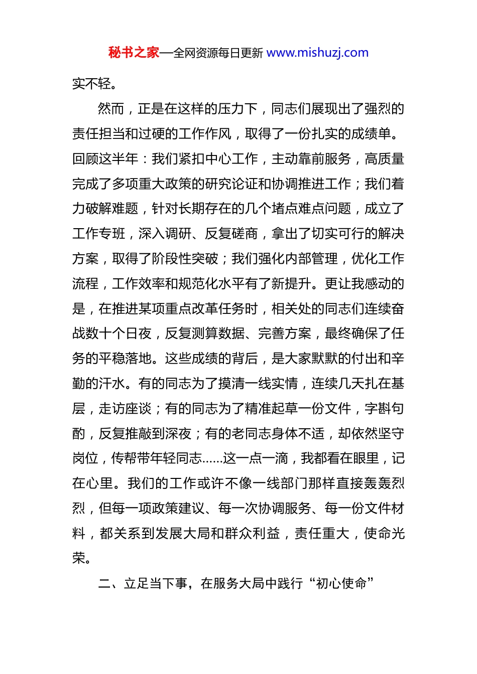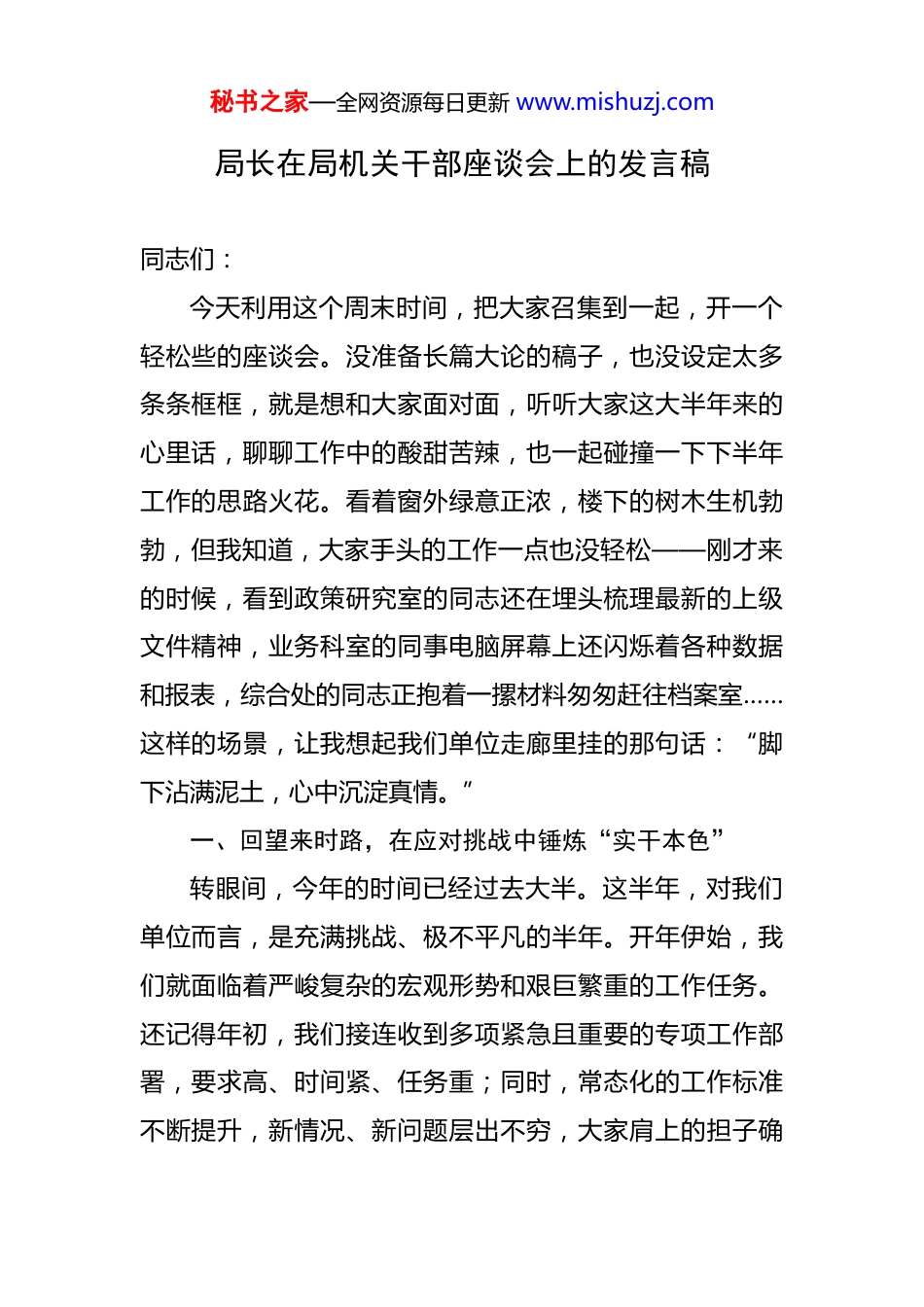 秘书之家—全网资源每日更新 www.mishuzj.com局长在局机关干部座谈会上的发言稿 同志们:今天利用这个周末时间,把大家召集到一起,开一个轻松些的座谈会。没准备长篇大论的稿子,也没设定太多条条框框,就是想和大家面对面,听听大家这大半年来的心里话,聊聊工作中的酸甜苦辣,也一起碰撞一下下半年工作的思路火花。看着窗外绿意正浓,楼下的树木生机勃勃,但我知道,大家手头的工作一点也没轻松——刚才来的时候,看到政策研究室的同志还在埋头梳理最新的上级文件精神,业务科室的同事电脑屏幕上还闪烁着各种数据和报表,综合处的同志正抱着一摞材料匆匆赶往档案室……这样的场景,让我想起我们单位走廊里挂的那句话:“脚下沾满泥土,心中沉淀真情。”一、回望来时路,在应对挑战中锤炼“实干本色”转眼间,今年的时间已经过去大半。这半年,对我们单位而言,是充满挑战、极不平凡的半年。开年伊始,我们就面临着严峻复杂的宏观形势和艰巨繁重的工作任务。还记得年初,我们接连收到多项紧急且重要的专项工作部署,要求高、时间紧、任务重;同时,常态化的工作标准不断提升,新情况、新问题层出不穷,大家肩上的担子确秘书之家—全网资源每日更新 www.mishuzj.com实不轻。然而,正是在这样的压力下,同志们展现出了强烈的责任担当和过硬的工作作风,取得了一份扎实的成绩单。回顾这半年:我们紧扣中心工作,主动靠前服务,高质量完成了多项重大政策的研究论证和协调推进工作;我们着力破解难题,针对长期存在的几个堵点难点问题,成立了工作专班,深入调研、反复磋商,拿出了切实可行的解决方案,取得了阶段性突破;我们强化内部管理,优化工作流程,工作效率和规范化水平有了新提升。更让我感动的是,在推进某项重点改革任务时,相关处的同志们连续奋战数十个日夜,反复测算数据、完善方案,最终确保了任务的平稳落地。这些成绩的背后,是大家默默的付出和辛勤的汗水。有的同志为了摸清一线实情,连续几天扎在基层,走访座谈;有的同志为了精准起草一份文件,字斟句酌,反复推敲到深夜;有的老同志身体不适,却依然坚守岗位,传帮带年轻同志……这一点一滴,我都看在眼里,记在心里。我们的工作或许不像一线部门那样直接轰轰烈烈,但每一项政策建议、每一次协调服务、每一份文件材料,都关系到发展大局和群众利益,责任重大,使命光荣。二、立足当下事,在服务大局中践行“初心使命”秘书之家—全网资源每日更新 www.mishuzj.com前段时间,我带队到几个服务对象单位去调研,听取他们对我们的意见建议。有一位基层的同志对我说:“现在你们出台的政策指引更清晰了,对接也更顺畅了,但我们最担心的还是政策能不能真正落地见效,遇到具体问题能不能得到及时响应。”我当时回答:“请放心,我们就是为大家服务的,一定会跟踪到底。”回来后,我一直在思考,“放心”这两个字,承载着多么重的期待。我们的工作,根基在于服务发展、服务基层、服务群众。这半年,我们在这方面做了不少努力:比如,在优化营商环境方面,我们牵头梳理并简化了多项办事流程,推动了相关信息的共享互通,让数据多跑路、群众少跑腿;在回应社会关切方面,我们建立了更加高效的舆情研判和回应机制,针对公众关注的热点问题,主动发声、解疑释惑;在提升服务质量方面,我们推行了首问负责制和限时办结制,努力让每一个来办事的单位和群众都能感受到效率和温度。这些努力,让我更加深刻地认识到,我们的工作不是简单的程序性操作,而是承载着各方的期盼和信任。我们笔下流出的文字,我们协调推动的事项,最终都要经得起实践的检验和群众的评判。这就要求我们必须始终怀着敬畏之心,把服务对象的每一件“小事”当作自己的“大事”来办,用我们的专业和敬业,换取大家的安心秘书之家—全网资源每日更新 www.mishuzj.com和放心。三、看向未来时,在提升能力中锻造“过硬队伍”当前,形势发展变化很快,新的知识、新的理念、新的技术不断涌现,对我们的能力素质提出了更高要求。不少同志反映,现在工作标准越来越高,知识更新速度越来越快,时常感到“本领恐慌”。这既是压力,也是我们提升自我、实现转型发...