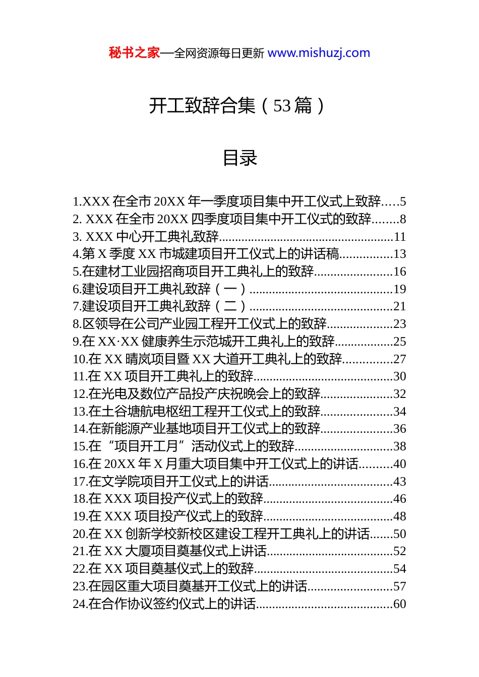 秘书之家—全网资源每日更新 www.mishuzj.com开工致辞合集(53 篇)目录1.XXX 在全市 20XX 年一季度项目集中开工仪式上致辞.....52. XXX 在全市 20XX 四季度项目集中开工仪式的致辞........83. XXX 中心开工典礼致辞......................................................114.第 X 季度 XX 市城建项目开工仪式上的讲话稿................135.在建材工业园招商项目开工典礼上的致辞........................166.建设项目开工典礼致辞(一)............................................197.建设项目开工典礼致辞(二)............................................218.区领导在公司产业园工程开工仪式上的致辞....................239.在 XX·XX 健康养生示范城开工典礼上的致辞..................2510.在 XX 晴岚项目暨 XX 大道开工典礼上的致辞...............2711.在 XX 项目开工典礼上的致辞...........................................3012.在光电及数位产品投产庆祝晚会上的致辞......................3213.在土谷塘航电枢纽工程开工仪式上的致辞......................3414.在新能源产业基地项目开工仪式上的致辞......................3615.在“项目开工月”活动仪式上的致辞..............................3816.在 20XX 年 X 月重大项目集中开工仪式上的讲话..........4017.在文学院项目开工仪式上的讲话......................................4318.在 XXX 项目投产仪式上的致辞........................................4619.在 XXX 项目投产仪式上的致辞........................................4820.在 XX 创新学校新校区建设工程开工典礼上的讲话.......5021.在 XX 大厦项目奠基仪式上讲话.......................................5222.在 XX 项目奠基仪式上的致辞...........................................5423.在园区重大项目奠基开工仪式上的讲话..........................5724.在合作协议签约仪式上的讲话..........................................60秘书之家—全网资源每日更新 www.mishuzj.com25.在项目开工仪式上的致辞..................................................6226.在搬迁工程项目开工仪式上的讲话..................................6427.在综合回收项目开工仪式上的致辞..................................6728.在训练中心开工建设动员大会上的致辞..........................7029.在东方日升光伏旅游项目开工仪式上的讲话..................7230.在建材工业园招商项目开工典礼上的致辞......................7431.在金边三环线公路项目开工仪式上的讲话......................7732.在开工奠基仪式上的致辞..................................................8033.在开工奠基仪式上的致辞..................................................8234.在扩建工程项目开工仪式的致辞......................................8435.在药厂开工仪式上的讲话..................................................8636.在项目开工仪式上的讲话..................................................8937.在南粮仓项目开工仪式上的致辞......................................9238.在动员会议上的讲话..........................................................9439.在全区第 X 季度项目集中开工仪式上的致辞................10540.在全区四季度第 X 次项目集中开工仪式上的致辞........10741.在全区四季度第 X 次项目集中开工仪式上的致辞........10942.在全市“重大项目开工月”仪式上的致辞.....................11143.在全市第 X 次重点项目集中开工仪式上的讲话............11444.在集中开工动员大会上的讲话........................................11645.在全市重大项目集中开工动员大会上的讲话................12546.在全市重大项目集中开工仪式上的致辞........................12847.在全市重点项目集中开工式上的讲话............................13048.在全市重点项目建设推进会议...
