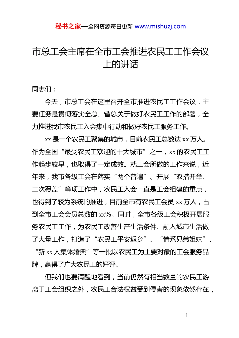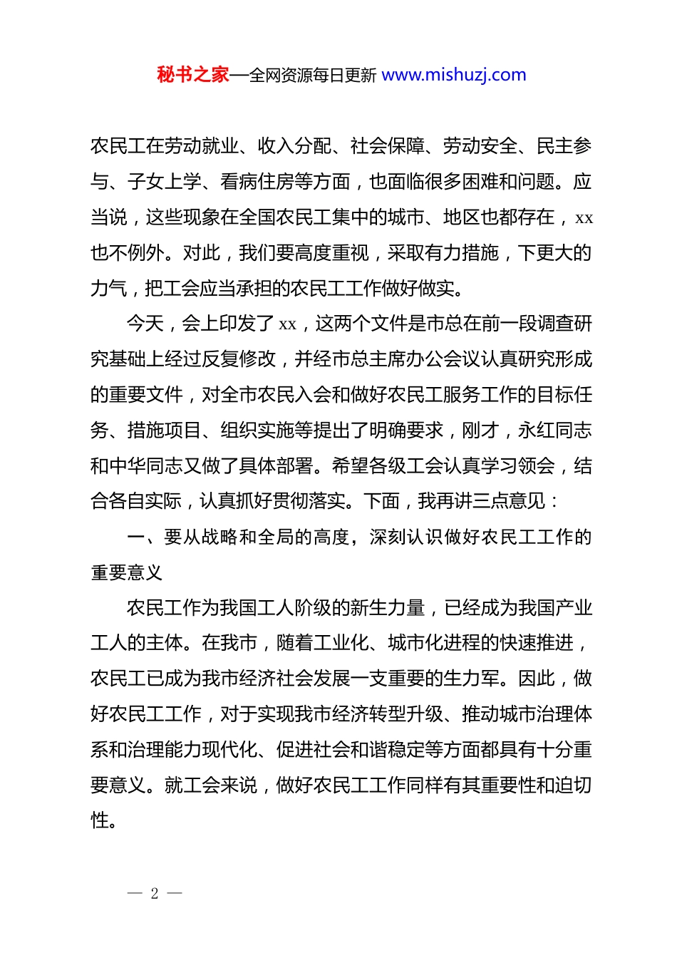 秘书之家—全网资源每日更新 www.mishuzj.com市总工会主席在全市工会推进农民工工作会议上的讲话同志们:今天,市总工会在这里召开全市推进农民工工作会议,主要任务是贯彻落实全总、省总关于做好农民工工作的部署,全力推进我市农民工入会集中行动和做好农民工服务工作。xx 是一个农民工聚集的城市,目前农民工总数达 xx 万人。作为全国“最受农民工欢迎的十大城市”之一,xx 的农民工工作起步较早,也取得了一定成效。就工会所做的工作来说,近年来,我市各级工会在落实“两个普遍”、开展“双措并举、二次覆盖”等项工作中,农民工入会一直是工会组建的重点,也得到了较为系统的推进,目前全市有农民工会员 xx 万人,占到全市工会会员总数的 xx%。同时,全市各级工会积极开展服务农民工工作,为农民工改善生产生活条件、融入城市生活做了大量工作,打造了“农民工平安返乡”、“情系兄弟姐妹”、“新 xx 人集体婚典”等一批以农民工为主要对象的工会服务品牌,赢得了广大农民工的好评。但我们也要清醒地看到,当前仍然有相当数量的农民工游离于工会组织之外,农民工合法权益受到侵害的现象依然存在,— 1 —秘书之家—全网资源每日更新 www.mishuzj.com农民工在劳动就业、收入分配、社会保障、劳动安全、民主参与、子女上学、看病住房等方面,也面临很多困难和问题。应当说,这些现象在全国农民工集中的城市、地区也都存在,xx也不例外。对此,我们要高度重视,采取有力措施,下更大的力气,把工会应当承担的农民工工作做好做实。今天,会上印发了 xx,这两个文件是市总在前一段调查研究基础上经过反复修改,并经市总主席办公会议认真研究形成的重要文件,对全市农民入会和做好农民工服务工作的目标任务、措施项目、组织实施等提出了明确要求,刚才,永红同志和中华同志又做了具体部署。希望各级工会认真学习领会,结合各自实际,认真抓好贯彻落实。下面,我再讲三点意见:一、要从战略和全局的高度,深刻认识做好农民工工作的重要意义农民工作为我国工人阶级的新生力量,已经成为我国产业工人的主体。在我市,随着工业化、城市化进程的快速推进,农民工已成为我市经济社会发展一支重要的生力军。因此,做好农民工工作,对于实现我市经济转型升级、推动城市治理体系和治理能力现代化、促进社会和谐稳定等方面都具有十分重要意义。就工会来说,做好农民工工作同样有其重要性和迫切性。— 2 —秘书之家—全网资源每日更新 www.mishuzj.com第一,做好农民工工作,是工会履行政治职责,保持和增强政治性、先进性、群众性的根本要求。据统计,截至 2019 年底,全国农民工总数达 xx 亿人。只有把这一规模庞大的劳动群体吸纳到工会中来,才能发展壮大工人阶级队伍,在更广泛的基础上增强*的阶级基础,扩大*的群众基础。工会是*领导下的工人阶级群众组织,最大限度地把农民工组织起来,坚定不移跟*走,是各级工会组织义不容辞的神圣使命。*中央高度重视农民工工作,并对工会做好农民工工作提出要求,******多次强调指出,要提高农民工的阶级觉悟,使他们在工业化、城镇化过程中成为工人阶级坚定可靠的新生力量,成为我*执政的社会基础,工会要加大力度做好农民工工作。做好农民工工作,是*交给工会的一项重要任务,体现了*对工会工作的高度重视和信任。各级工会一定要从战略和全局的高度充分认识做好农民工工作的重要性紧迫性,认真履行“组织起来,切实维权”职责,扎实做好组织、引导、服务农民工和维护农民工合法权益工作,把广大农民工团结在*的周围,夯实*执政的阶级基础和群众基础。第二,做好农民工工作,是新形势下工会组织夯实基础、增强凝聚力的迫切需要。农民工入会和服务工作历来是工会工作的重点和难点,也是工会基层组织建设中的薄弱环节。正是— 3 —秘书之家—全网资源每日更新 www.mishuzj.com基于这种现状,全总决定以加强基层工会建设“落实年”为契机,在全国各级工会开展“农民工入会集中行动”和服务农民工工作,最大限度地把农民工组织到工会中来,不断提高农民工组织化程度,更好地维护农民工的合法权益。近一段时间以来,全总、省总就...