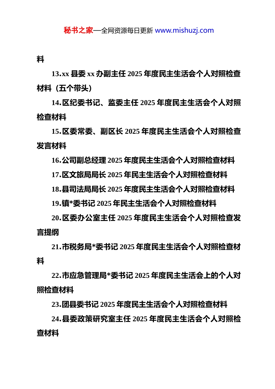 秘书之家—全网资源每日更新 www.mishuzj.com(32 篇)2025 年度民主生活会个人对照检查发言材料汇编1.县长 2025 年度民主生活会个人对照检查发言材料2.区委书记 2025 年度民主生活会个人对照检查发言材料3.区长 2025 年度民主生活会个人对照检查发言材料4.2025 年度民主生活会个人对照检查剖析发言材料5.*委委员 2025 年度民主生活会个人对照检查发言材料6.国企董事长 2025 年度民主生活会个人对照检查发言材料7.区委常委、区委宣传部长 2025 年度民主生活会个人对照检查发言材料8.市人大常委会副主任 2025 年度民主生活会个人对照检查发言材料9.县委常委、副县长在 2025 年度民主生活会上个人对照检查材料(五个带头)10.县委常委、组织部部长年度民主生活会“五个带头”个人对照检查材料11.县委副书记、县长 2025 年度民主生活会个人对照检查材料12.医院*委书记 2025 年度民主生活会个人对照检查发言材秘书之家—全网资源每日更新 www.mishuzj.com料13.xx 县委 xx 办副主任 2025 年度民主生活会个人对照检查材料(五个带头)14.区纪委书记、监委主任 2025 年度民主生活会个人对照检查材料15.区委常委、副区长 2025 年度民主生活会个人对照检查发言材料16.公司副总经理 2025 年度民主生活会个人对照检查材料17.区文旅局局长 2025 年民主生活会个人对照检查材料18.县司法局局长 2025 年度民主生活会个人对照检查材料19.镇*委书记 2025 年民主生活会个人对照检查材料20.区委办公室主任 2025 年度民主生活会个人对照检查发言提纲21.市税务局*委书记 2025 年度民主生活会个人对照检查材料22.市应急管理局*委书记 2025 年度民主生活会上的个人对照检查材料23.团县委书记 2025 年度民主生活会个人对照检查材料24.县委政策研究室主任 2025 年度民主生活会个人对照检查材料秘书之家—全网资源每日更新 www.mishuzj.com25.协会秘书长 2025 年度民主生活会的个人对照检查材料26.*委书记 2025 年民主生活会个人对照检查材料(五个带头)27.*支部书记 2025 年度民主生活会个人对照检查材料(五个带头)28.街道办事处主任 2025 年度民主生活会个人对照检查材料29.区红十字会*组书记 2025 年度民主生活会个人对照检查材料30.市水文水资源局*委书记 2025 年度民主生活会个人对照检查材料31.县机关事务局副主任 2025 年度民主生活会个人对照检查材料32.银行 2025 年度民主生活会个人对照检查材料(五个带头)县长 2025 年度民主生活会个人对照检查发言材料根据市委、市政府关于开好 2025 年度民主生活会的部署要求,本人紧扣会议主题,严格对照“五个带头”标准,通过理论学习、谈心谈话、征求意见、自我检视等方式,全面查摆自身存在的问题与不足,深刻剖析根源症结,明确整改方向和举秘书之家—全网资源每日更新 www.mishuzj.com措。现将对照检查情况报告如下:一、存在的主要问题(一)带头强化政治忠诚,提高政治能力方面。一是政治判断力不够精准。面对县域经济发展与生态保护的双重任务,有时未能从政治高度透彻研判二者辩证关系,在推进部分工业项目落地时,初期更多关注投资规模和税收贡献,对项目的生态环保风险、长远社会效益的政治考量不够深入,存在“重当前、轻长远”的倾向。二是政治领悟力不够透彻。对*中央关于高质量发展、共同富裕等重大战略部署的学习,存在“浅尝辄止、学用脱节”现象,在落实“县域经济高质量发展”要求时,简单将其等同于 gdp 增速,对“创新驱动、产业升级、民生改善”的核心要义领悟不深,导致部分政策举措与上级精神契合度不够。三是政治执行力不够扎实。贯彻落实上级决策部署时,存在“上热中温下冷”的传导衰减问题,如在推进乡村振兴示范带建设中,虽然牵头制定了实施方案,但对乡镇的督导检查不够常态化,导致部分节点任务推进滞后,示范效应未能及时凸显。(二)带头固本培元,增强*性方面。一是理想信念不足。受日常政务繁杂影响,对*的创新理论学习缺乏系统性和深入性,多是围绕会议主题、工作需求开展“碎片化”学习,静下心来秘书之家—全网资源每日更新 www.mi...