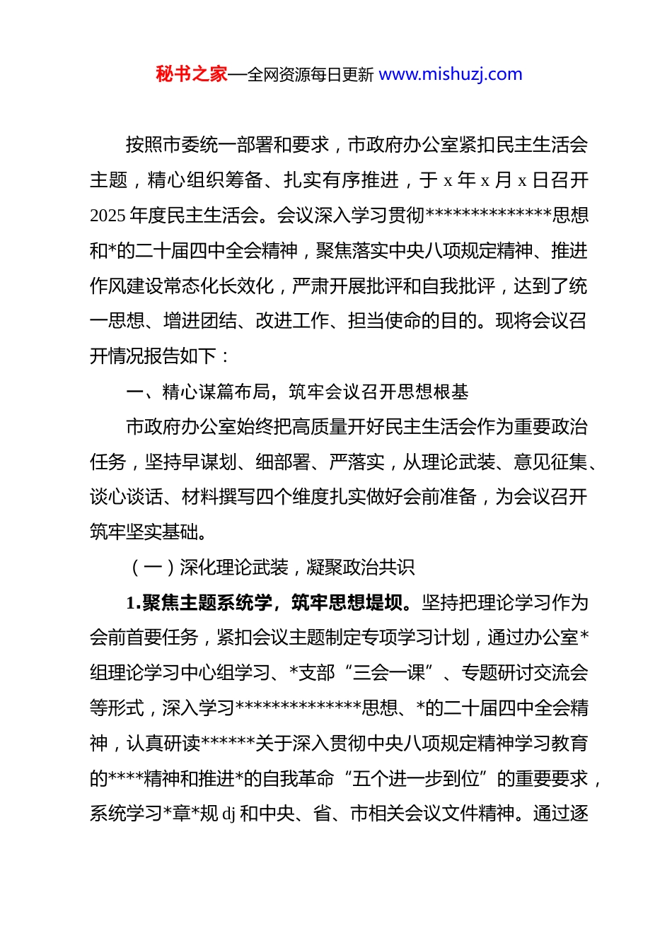 秘书之家—全网资源每日更新 www.mishuzj.com(12 篇)2025 年度民主生活会召开情况报告汇编1.市政府办公室 2025 年度民主生活会召开情况报告2.市财政局 2025 年度民主生活会召开情况报告3.关于市司法局*组 2025 年度民主生活会召开情况的报告4.某市水利局 2025 年度民主生活会召开情况报告5.市民政局 2025 年度民主生活会召开情况报告6.市民政局*组关于 2025 年度民主生活会召开情况的报告7.市人民代表大会常务委员会*组关于 2025 年度民主生活会召开情况的报告8.市人民政府*组关于 2025 年度民主生活会召开情况的报告9.市中级人民法院*组关于 2025 年度民主生活会召开情况的报告10.关于市局领导班子 2025 年度民主生活会召开情况的报告11.关于市水利局*组 2025 年度民主生活会召开情况的报告12.市工业和信息化局 2025 年度民主生活会召开情况报告市政府办公室 2025 年度民主生活会召开情况报告秘书之家—全网资源每日更新 www.mishuzj.com按照市委统一部署和要求,市政府办公室紧扣民主生活会主题,精心组织筹备、扎实有序推进,于 x 年 x 月 x 日召开2025 年度民主生活会。会议深入学习贯彻**************思想和*的二十届四中全会精神,聚焦落实中央八项规定精神、推进作风建设常态化长效化,严肃开展批评和自我批评,达到了统一思想、增进团结、改进工作、担当使命的目的。现将会议召开情况报告如下:一、精心谋篇布局,筑牢会议召开思想根基市政府办公室始终把高质量开好民主生活会作为重要政治任务,坚持早谋划、细部署、严落实,从理论武装、意见征集、谈心谈话、材料撰写四个维度扎实做好会前准备,为会议召开筑牢坚实基础。(一)深化理论武装,凝聚政治共识1.聚焦主题系统学,筑牢思想堤坝。坚持把理论学习作为会前首要任务,紧扣会议主题制定专项学习计划,通过办公室*组理论学习中心组学习、*支部“三会一课”、专题研讨交流会等形式,深入学习**************思想、*的二十届四中全会精神,认真研读******关于深入贯彻中央八项规定精神学习教育的****精神和推进*的自我革命“五个进一步到位”的重要要求,系统学习*章*规 dj 和中央、省、市相关会议文件精神。通过逐秘书之家—全网资源每日更新 www.mishuzj.com字逐句学、联系实际学、带着问题学,切实把思想和行动统一到*中央决策部署和市委工作要求上来,不断提高政治判断力、政治领悟力、政治执行力,为开好民主生活会奠定坚实思想基础。2.结合职能精准学,提升履职能力。立足市政府办公室“三服务”核心职能,把理论学习与办公室工作实际紧密结合,重点围绕公文处理、会务保障、督查落实、统筹协调等关键岗位,开展靶向学习和业务研讨。通过学习先进地区办公室工作经验、梳理年度工作短板弱项、分析作风建设突出问题,推动理论学习与业务工作深度融合,切实把学习成果转化为破解工作难题、提升服务质效的实际能力,确保会议检视问题、整改落实更具针对性和实效性。3.创新形式深入学,强化学习实效。打破传统学习模式,采取“集中学习+个人自学”“专题辅导+案例剖析”相结合的方式,邀请市委*校专家开展专题授课,组织观看作风建设警示教育片,通报系统内违纪违法典型案例,引导办公室领导班子成员知敬畏、存戒惧、守底线。建立学习台账,实行销号管理,定期开展学习交流和成果检验,坚决杜绝形式主义、官僚主义,确保理论学习入脑入心、走深走实,切实以理论清醒保证政治坚定。秘书之家—全网资源每日更新 www.mishuzj.com(二)广泛征求意见,汇聚群众智慧1.拓宽渠道全面征,确保意见广泛。坚持开门纳谏,采取书面征求、座谈访谈、实地走访等多种形式,面向市直各部门、各县(市、区)政府办公室、办公室全体干部职工及服务对象,广泛征求对办公室领导班子及成员在思想作风、工作作风、廉洁自律、履职担当等方面的意见建议。通过设置意见箱、公布联系电话和邮箱,畅通意见征集渠道,确保不同层面、不同群体的声音都能充分表达、有效反映。2.梳理分析精准筛,突出问题导向。对征集到的意见建议进行分类梳理、汇总分析,逐条甄别筛选、去粗取精,剔除模糊表述、聚焦具体...