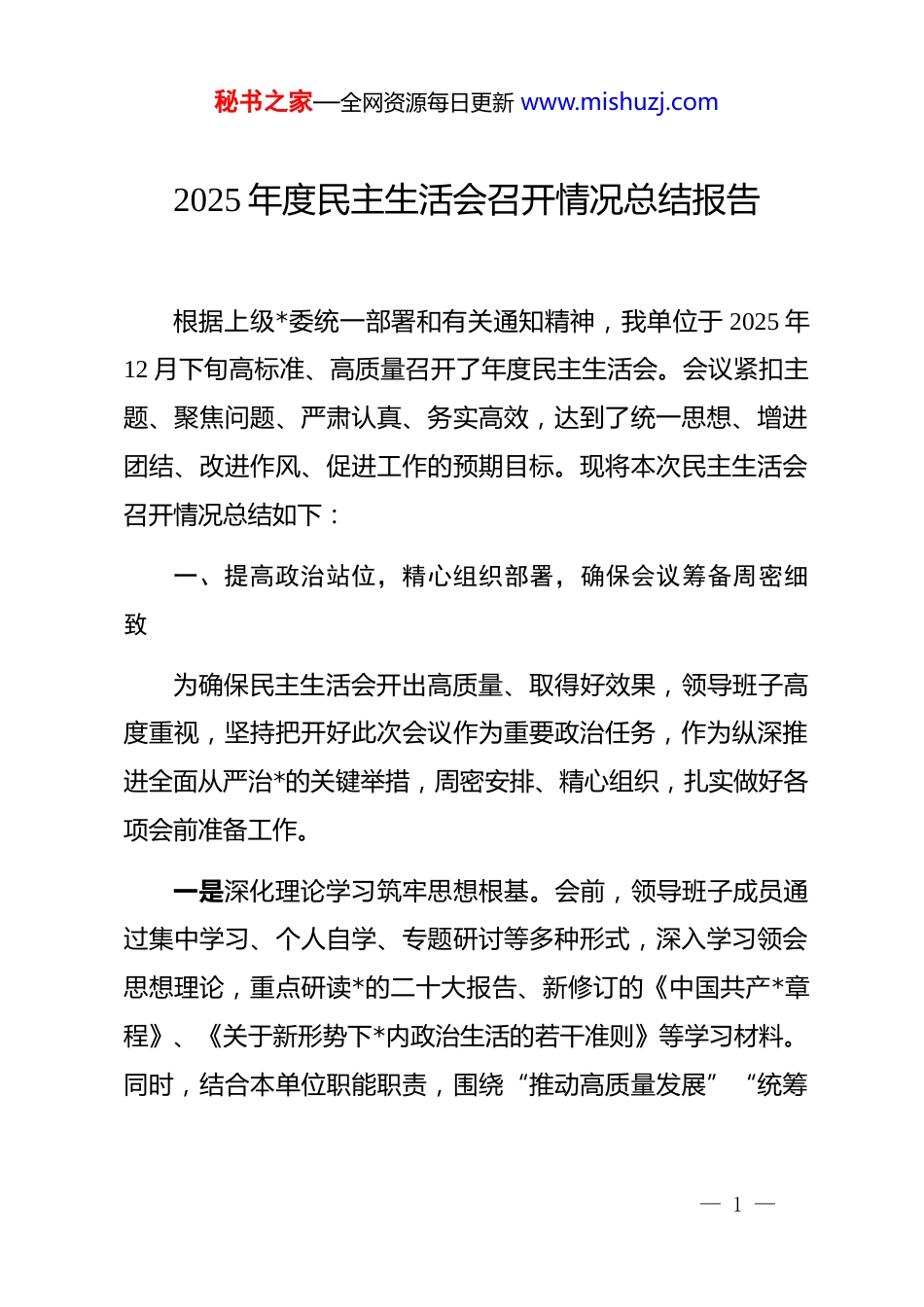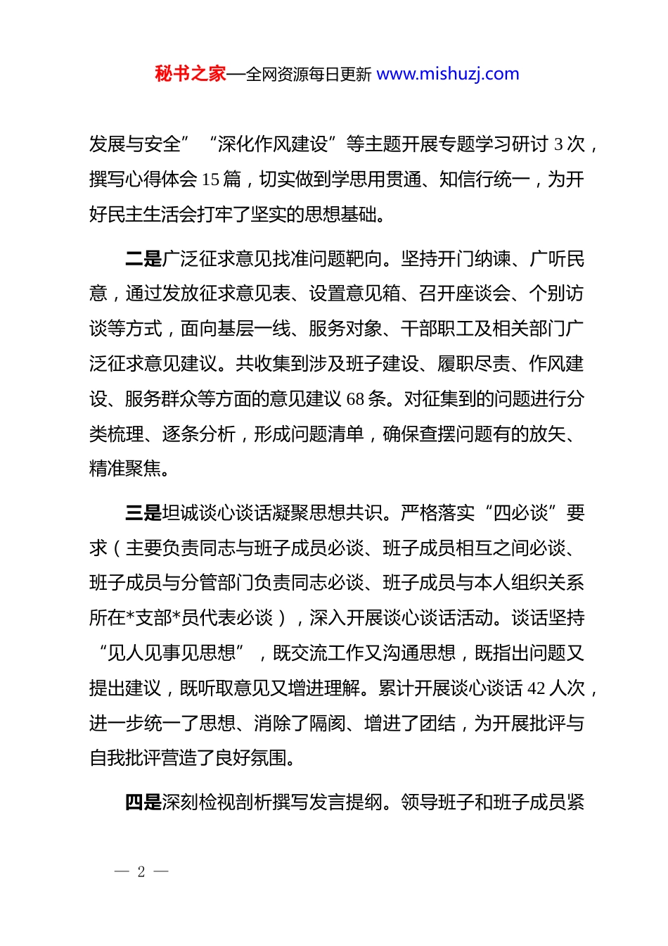 秘书之家—全网资源每日更新 www.mishuzj.com2025 年度民主生活会召开情况总结报告根据上级*委统一部署和有关通知精神,我单位于 2025 年12 月下旬高标准、高质量召开了年度民主生活会。会议紧扣主题、聚焦问题、严肃认真、务实高效,达到了统一思想、增进团结、改进作风、促进工作的预期目标。现将本次民主生活会召开情况总结如下:一、提高政治站位,精心组织部署,确保会议筹备周密细致为确保民主生活会开出高质量、取得好效果,领导班子高度重视,坚持把开好此次会议作为重要政治任务,作为纵深推进全面从严治*的关键举措,周密安排、精心组织,扎实做好各项会前准备工作。一是深化理论学习筑牢思想根基。会前,领导班子成员通过集中学习、个人自学、专题研讨等多种形式,深入学习领会思想理论,重点研读*的二十大报告、新修订的《中国共产*章程》、《关于新形势下*内政治生活的若干准则》等学习材料。同时,结合本单位职能职责,围绕“推动高质量发展”“统筹— 1 —秘书之家—全网资源每日更新 www.mishuzj.com发展与安全”“深化作风建设”等主题开展专题学习研讨 3 次,撰写心得体会 15 篇,切实做到学思用贯通、知信行统一,为开好民主生活会打牢了坚实的思想基础。二是广泛征求意见找准问题靶向。坚持开门纳谏、广听民意,通过发放征求意见表、设置意见箱、召开座谈会、个别访谈等方式,面向基层一线、服务对象、干部职工及相关部门广泛征求意见建议。共收集到涉及班子建设、履职尽责、作风建设、服务群众等方面的意见建议 68 条。对征集到的问题进行分类梳理、逐条分析,形成问题清单,确保查摆问题有的放矢、精准聚焦。三是坦诚谈心谈话凝聚思想共识。严格落实“四必谈”要求(主要负责同志与班子成员必谈、班子成员相互之间必谈、班子成员与分管部门负责同志必谈、班子成员与本人组织关系所在*支部*员代表必谈),深入开展谈心谈话活动。谈话坚持“见人见事见思想”,既交流工作又沟通思想,既指出问题又提出建议,既听取意见又增进理解。累计开展谈心谈话 42 人次,进一步统一了思想、消除了隔阂、增进了团结,为开展批评与自我批评营造了良好氛围。四是深刻检视剖析撰写发言提纲。领导班子和班子成员紧— 2 —秘书之家—全网资源每日更新 www.mishuzj.com扣会议主题,对照*章*规、对照初心使命、对照群众期盼、对照先进典型,重点从思想政治、精神状态、工作作风、廉洁自律等方面深入查摆问题。在此基础上,认真撰写对照检查材料和个人发言提纲,做到问题查得准、原因剖得深、措施定得实。主要负责同志对班子成员发言提纲逐一审核把关,确保内容真实、剖析深刻、整改具体。二、会议规范严谨,严肃开展批评,确保会议氛围严实有序2025 年 12 月 25 日,我单位召开 2025 年度民主生活会,全体班子成员参加会议,上级*委督导组同志到会指导。会议坚持“团结—批评—团结”方针,程序规范、氛围严肃、辣味十足,取得了良好效果。一是查摆问题精准深刻。班子成员坚持把自己摆进去、把职责摆进去、把工作摆进去,主动认领问题,深入查摆在贯彻落实*中央决策部署、推动高质量发展、服务群众“最后一公里”、防范化解重大风险等方面的短板弱项。查摆问题不遮掩、不回避,既有工作层面的具体表现,也有思想根源的深层反思,体现了高度的政治自觉和责任担当。— 3 —秘书之家—全网资源每日更新 www.mishuzj.com二是相互批评坦诚相见。批评环节坚持实事求是、出于公心,开门见山、直奔主题,既有“红脸出汗”的辣味,又有“加油鼓劲”的温度。班子成员相互提出批评意见共计 56 条,均聚焦具体事例、点到要害处,避免了“老好人”“走过场”现象。大家普遍反映,这次批评“戳到了痛处、点到了穴位”,真正起到了提醒警醒、促进提升的作用。三是原因剖析触及灵魂。在深入查摆问题的基础上,班子成员从理想信念、*性修养、宗旨意识、纪律观念等方面深挖思想根源,既分析客观原因,更注重主观因素,特别是对政绩观偏差、斗争精神不足、联系群众不紧等问题进行了深刻反思。剖析过程既有理性思考,也有情感触动,体现了刀刃向内的勇气和自我革命的精...