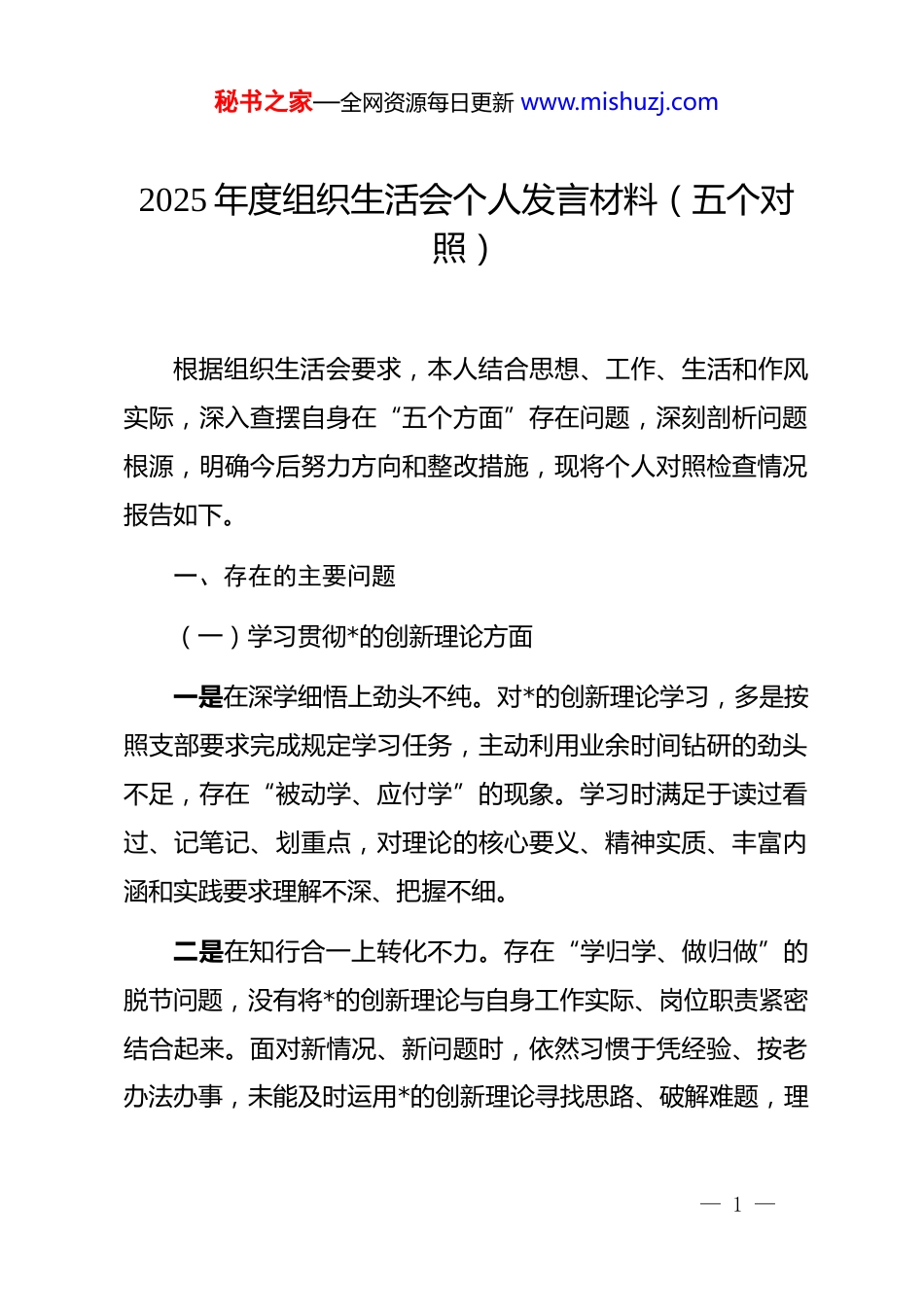 秘书之家—全网资源每日更新 www.mishuzj.com2025 年度组织生活会个人发言材料(五个对照)根据组织生活会要求,本人结合思想、工作、生活和作风实际,深入查摆自身在“五个方面”存在问题,深刻剖析问题根源,明确今后努力方向和整改措施,现将个人对照检查情况报告如下。一、存在的主要问题(一)学习贯彻*的创新理论方面一是在深学细悟上劲头不纯。对*的创新理论学习,多是按照支部要求完成规定学习任务,主动利用业余时间钻研的劲头不足,存在“被动学、应付学”的现象。学习时满足于读过看过、记笔记、划重点,对理论的核心要义、精神实质、丰富内涵和实践要求理解不深、把握不细。二是在知行合一上转化不力。存在“学归学、做归做”的脱节问题,没有将*的创新理论与自身工作实际、岗位职责紧密结合起来。面对新情况、新问题时,依然习惯于凭经验、按老办法办事,未能及时运用*的创新理论寻找思路、破解难题,理— 1 —秘书之家—全网资源每日更新 www.mishuzj.com论学习的实际成效未能充分体现。三是在融会贯通上研究不透。学习*的创新理论时,缺乏系统性和整体性思维,没有将不同领域、不同方面的理论知识融会贯通,未能深刻把握各理论之间的内在联系和逻辑脉络。难以将所学理论知识转化为科学的思维方法和工作举措,学习的深度和广度有待进一步拓展。(二)加强*性锤炼方面一是在政治判断力上磨砺不深。政治敏锐性和政治鉴别力有待提升,对一些社会上的错误言论、模糊认识,缺乏及时发现、坚决抵制的意识和能力。在贯彻落实上级*组织的决策部署时,有时过于关注具体工作安排,对决策部署的政治意义、战略考量理解不够深刻,未能始终以高度的政治自觉对标对表。二是在政治执行力上落实不硬。存在“重部署、轻落实”的倾向,对上级*组织安排的各项工作任务,有时缺乏一抓到底、务求实效的韧劲。在工作落实过程中,遇到困难和阻力时,有时会产生畏难情绪,主动担当、积极作为的劲头不足,政治执行力有待进一步增强。三是在理想信念力上扎根不牢。面对复杂的社会环境、繁— 2 —秘书之家—全网资源每日更新 www.mishuzj.com重的工作任务时,有时会出现思想松懈、信念动摇的情况,对自身肩负的责任使命认识不够深刻,缺乏为理想信念奋斗终身的坚定决心和自觉行动。(三)联系服务群众方面一是在深入基层上脚步不勤。存在“机关思维”,习惯于坐在办公室开展工作,主动深入基层、深入群众的次数不多、力度不够,对群众的所思所想、所急所盼了解不全面、不深入。深入基层调研时,往往是走马观花、流于形式,难以掌握第一手资料,对基层实际情况把握不准。二是在排忧解难上力度不够。面对群众反映的困难和问题,有时存在“重回应、轻解决”的现象,虽然能够耐心倾听群众诉求,但在协调解决、跟踪问效上力度不足,一些群众的合理诉求未能及时得到有效解决。三是在宣传凝聚上方法不活。向群众宣传*的路线方针政策、*的创新理论时,方法单一、形式呆板,多是照本宣科,缺乏通俗易懂、生动鲜活的宣传方式,难以让群众真正理解和接受。(四)发挥先锋模范作用方面一是在工作标准上自我要求不严。在工作中,有时满足于— 3 —秘书之家—全网资源每日更新 www.mishuzj.com完成基本任务,缺乏精益求精、争创一流的意识,对工作的质量和效率要求不高,存在“过得去、差不多”的思想。自我约束、自我监督的力度不足,面对工作中的疏漏和不足,未能及时反思整改,工作作风不够严谨细致。二是在攻坚克难上担当意愿不强。面对工作中的难点堵点问题,有时会产生畏难情绪,缺乏“逢山开路、遇水架桥”的担当精神,不愿主动承担重担,不敢直面困难挑战,缺乏攻坚克难、迎难而上的勇气和决心。三是在弘扬正气上斗争精神不足。在工作和生活中,面对一些不良风气、违规违纪行为,有时存在“多一事不如少一事”的思想,缺乏坚决斗争、主动抵制的意识和勇气,不愿得罪人、不敢讲真话。对身边同志的错误言行,未能及时提醒、批评纠正,缺乏相互监督、共同进步的意识。(五)改作风树新风方面一是在力戒形式主义上不够彻底。在工作中,有时存在重痕迹、轻实效的现象,过于注重会议记录、报表填...