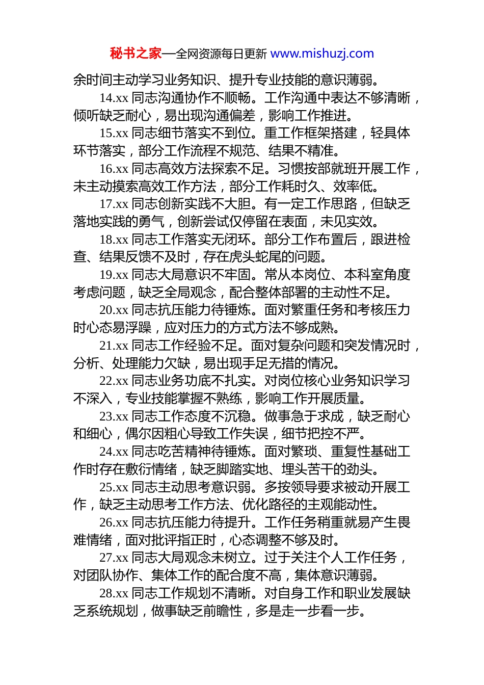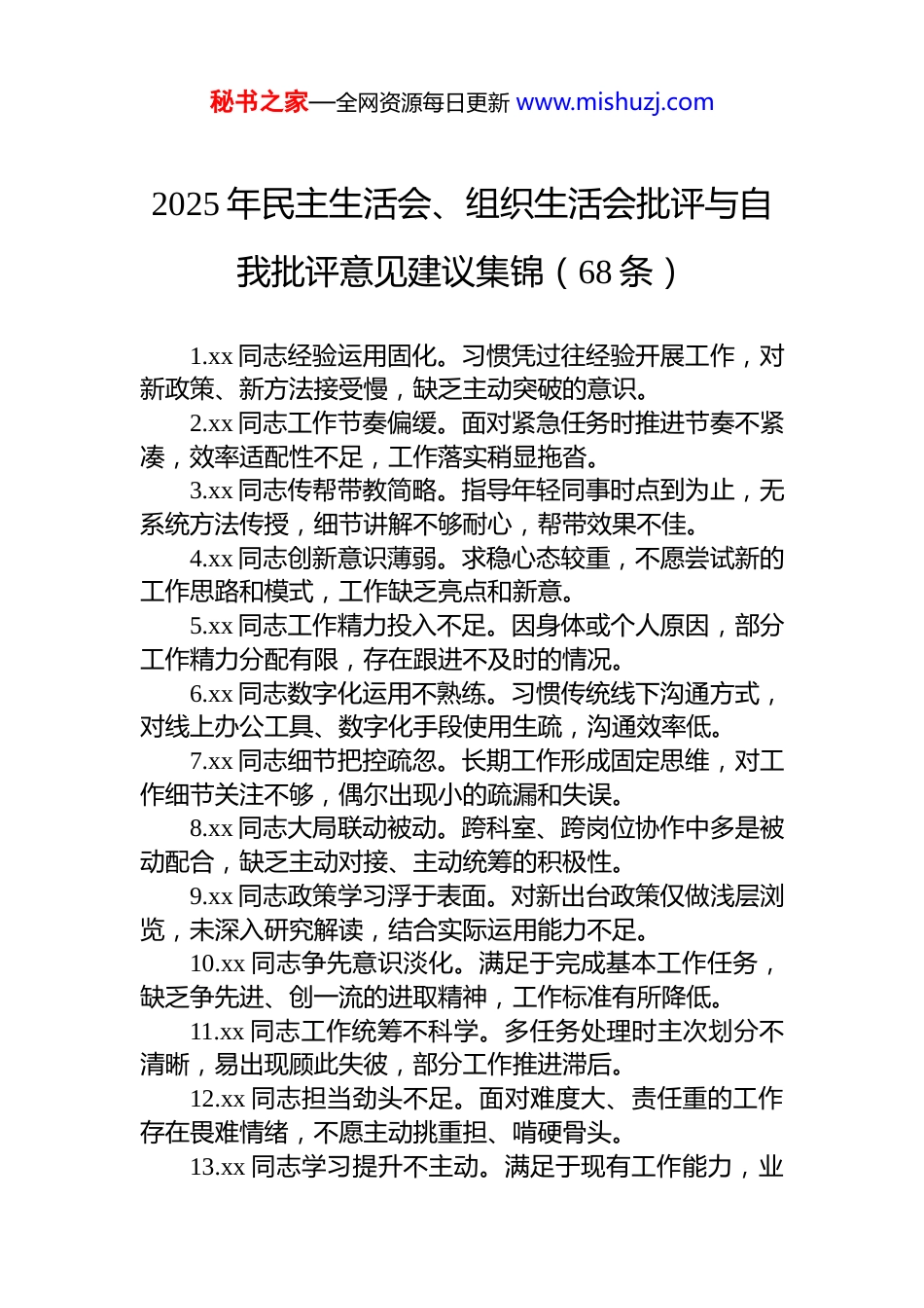秘书之家—全网资源每日更新 www.mishuzj.com2025 年民主生活会、组织生活会批评与自我批评意见建议集锦(68 条)1.xx 同志经验运用固化。习惯凭过往经验开展工作,对新政策、新方法接受慢,缺乏主动突破的意识。2.xx 同志工作节奏偏缓。面对紧急任务时推进节奏不紧凑,效率适配性不足,工作落实稍显拖沓。3.xx 同志传帮带教简略。指导年轻同事时点到为止,无系统方法传授,细节讲解不够耐心,帮带效果不佳。4.xx 同志创新意识薄弱。求稳心态较重,不愿尝试新的工作思路和模式,工作缺乏亮点和新意。5.xx 同志工作精力投入不足。因身体或个人原因,部分工作精力分配有限,存在跟进不及时的情况。6.xx 同志数字化运用不熟练。习惯传统线下沟通方式,对线上办公工具、数字化手段使用生疏,沟通效率低。7.xx 同志细节把控疏忽。长期工作形成固定思维,对工作细节关注不够,偶尔出现小的疏漏和失误。8.xx 同志大局联动被动。跨科室、跨岗位协作中多是被动配合,缺乏主动对接、主动统筹的积极性。9.xx 同志政策学习浮于表面。对新出台政策仅做浅层浏览,未深入研究解读,结合实际运用能力不足。10.xx 同志争先意识淡化。满足于完成基本工作任务,缺乏争先进、创一流的进取精神,工作标准有所降低。11.xx 同志工作统筹不科学。多任务处理时主次划分不清晰,易出现顾此失彼,部分工作推进滞后。12.xx 同志担当劲头不足。面对难度大、责任重的工作存在畏难情绪,不愿主动挑重担、啃硬骨头。13.xx 同志学习提升不主动。满足于现有工作能力,业秘书之家—全网资源每日更新 www.mishuzj.com余时间主动学习业务知识、提升专业技能的意识薄弱。14.xx 同志沟通协作不顺畅。工作沟通中表达不够清晰,倾听缺乏耐心,易出现沟通偏差,影响工作推进。15.xx 同志细节落实不到位。重工作框架搭建,轻具体环节落实,部分工作流程不规范、结果不精准。16.xx 同志高效方法探索不足。习惯按部就班开展工作,未主动摸索高效工作方法,部分工作耗时久、效率低。17.xx 同志创新实践不大胆。有一定工作思路,但缺乏落地实践的勇气,创新尝试仅停留在表面,未见实效。18.xx 同志工作落实无闭环。部分工作布置后,跟进检查、结果反馈不及时,存在虎头蛇尾的问题。19.xx 同志大局意识不牢固。常从本岗位、本科室角度考虑问题,缺乏全局观念,配合整体部署的主动性不足。20.xx 同志抗压能力待锤炼。面对繁重任务和考核压力时心态易浮躁,应对压力的方式方法不够成熟。21.xx 同志工作经验不足。面对复杂问题和突发情况时,分析、处理能力欠缺,易出现手足无措的情况。22.xx 同志业务功底不扎实。对岗位核心业务知识学习不深入,专业技能掌握不熟练,影响工作开展质量。23.xx 同志工作态度不沉稳。做事急于求成,缺乏耐心和细心,偶尔因粗心导致工作失误,细节把控不严。24.xx 同志吃苦精神待锤炼。面对繁琐、重复性基础工作时存在敷衍情绪,缺乏脚踏实地、埋头苦干的劲头。25.xx 同志主动思考意识弱。多按领导要求被动开展工作,缺乏主动思考工作方法、优化路径的主观能动性。26.xx 同志抗压能力待提升。工作任务稍重就易产生畏难情绪,面对批评指正时,心态调整不够及时。27.xx 同志大局观念未树立。过于关注个人工作任务,对团队协作、集体工作的配合度不高,集体意识薄弱。28.xx 同志工作规划不清晰。对自身工作和职业发展缺乏系统规划,做事缺乏前瞻性,多是走一步看一步。秘书之家—全网资源每日更新 www.mishuzj.com29.xx 同志文字功底待打磨。撰写公文材料时语言表达不规范,逻辑梳理不清晰,文字驾驭能力不足。30.xx 同志规矩意识待强化。对单位规章制度、工作流程掌握不熟练,偶尔出现操作不规范的情况,纪律性不足。31.xx 同志工作部署偏宏观。制定工作规划时宏观要求多,具体实施细则和操作指导不明确,基层执行难度大。32.xx 同志基层调研不深入。深入一线调研的频次不足,对实际工作中存在的问题掌握不全面、不精准。33.xx 同志决策推进效率低。部分工作决策时研讨环节偏长,定调落地较慢,影响整体工作推进节奏。34.xx 同志团队建设重视不足。对干部职工思想动...