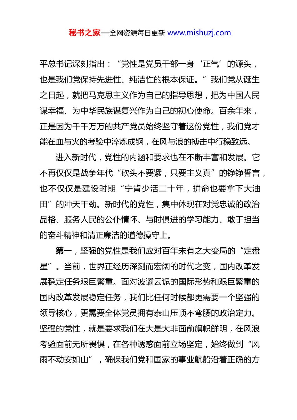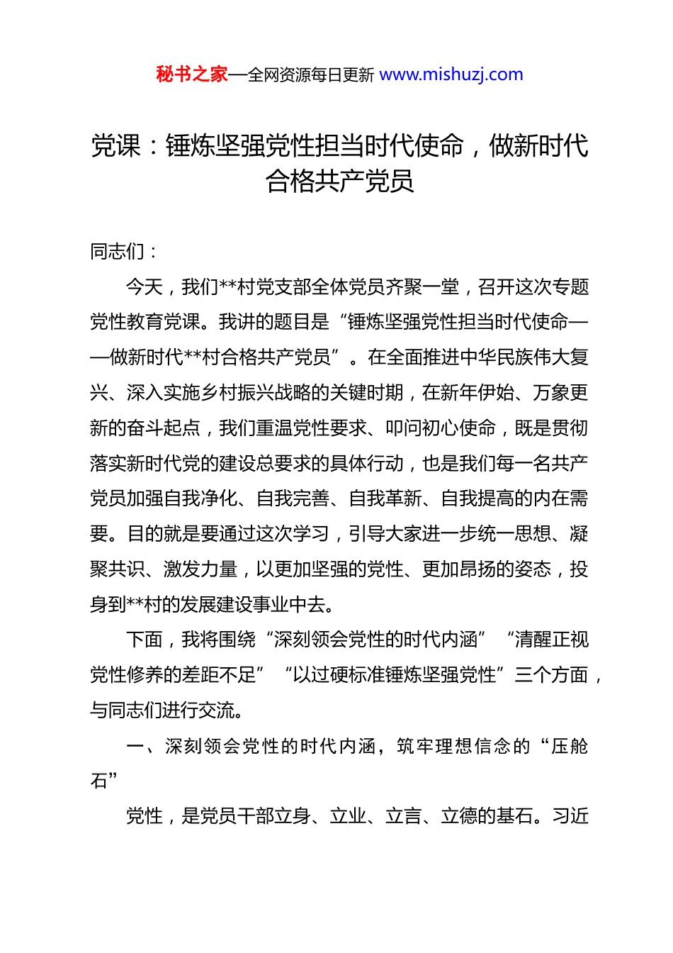 秘书之家—全网资源每日更新 www.mishuzj.com党课:锤炼坚强党性担当时代使命,做新时代合格共产党员 同志们:今天,我们**村党支部全体党员齐聚一堂,召开这次专题党性教育党课。我讲的题目是“锤炼坚强党性担当时代使命——做新时代**村合格共产党员”。在全面推进中华民族伟大复兴、深入实施乡村振兴战略的关键时期,在新年伊始、万象更新的奋斗起点,我们重温党性要求、叩问初心使命,既是贯彻落实新时代党的建设总要求的具体行动,也是我们每一名共产党员加强自我净化、自我完善、自我革新、自我提高的内在需要。目的就是要通过这次学习,引导大家进一步统一思想、凝聚共识、激发力量,以更加坚强的党性、更加昂扬的姿态,投身到**村的发展建设事业中去。下面,我将围绕“深刻领会党性的时代内涵”“清醒正视党性修养的差距不足”“以过硬标准锤炼坚强党性”三个方面,与同志们进行交流。一、深刻领会党性的时代内涵,筑牢理想信念的“压舱石”党性,是党员干部立身、立业、立言、立德的基石。习近秘书之家—全网资源每日更新 www.mishuzj.com平总书记深刻指出:“党性是党员干部一身‘正气’的源头,也是我们党保持先进性、纯洁性的根本保证。”我们党从诞生之日起,就把马克思主义作为自己的指导思想,把为中国人民谋幸福、为中华民族谋复兴作为自己的初心使命。百余年来,正是因为千千万万的共产党员始终坚守着这份党性,我们党才能在血与火的考验中淬炼成钢,在风与浪的搏击中行稳致远。进入新时代,党性的内涵和要求也在不断丰富和发展。它不再仅仅是战争年代“砍头不要紧,只要主义真”的铮铮誓言,也不仅仅是建设时期“宁肯少活二十年,拼命也要拿下大油田”的冲天干劲。新时代的党性,集中体现在对党忠诚的政治品格、服务人民的公仆情怀、与时俱进的学习能力、敢于担当的奋斗精神和清正廉洁的道德操守上。第一,坚强的党性是我们应对百年未有之大变局的“定盘星”。当前,世界正经历深刻而宏阔的时代之变,国内改革发展稳定任务艰巨繁重。面对波谲云诡的国际形势和艰巨繁重的国内改革发展稳定任务,我们比任何时候都更需要一个坚强的领导核心,更需要全体党员拥有泰山压顶不弯腰的政治定力。坚强的党性,就是要求我们在大是大非面前旗帜鲜明,在风浪考验面前无所畏惧,在各种诱惑面前立场坚定,始终做到“风雨不动安如山”,确保我们党和国家的事业航船沿着正确的方秘书之家—全网资源每日更新 www.mishuzj.com向破浪前行。第二,坚强的党性是我们推进乡村全面振兴的“发动机”。**村的发展正处在一个爬坡过坎、转型升级的关键阶段。无论是我们的**特色产业园项目建设,还是美丽乡村人居环境的综合整治,亦或是村民收入的持续稳定增长,每一项工作的推进,每一个目标的实现,都离不开一个坚强有力的党支部,离不开一支党性坚强的党员队伍。党性强,则战斗力强、凝聚力强、号召力强。只有我们每一名党员都把党性修养作为终身课题,把先锋模范作用体现在具体行动上,才能真正把党组织的政治优势、组织优势转化为推动**村发展的强大动能。据统计,2025 年我们村集体经济收入首次突破了 200 万元大关,同比增长 15%,这背后凝结的正是我们全体党员干部带领群众苦干实干的心血和汗水。但要实现到 2028 年村集体经济翻一番的目标,我们面临的挑战更大,更需要我们发挥党性的引领作用。第三,坚强的党性是我们每一名党员安身立命的“护身符”。共产党员的身份,不是一劳永逸的政治标签,而是一生一世的党性锤炼。坚强的党性,能够帮助我们树立正确的世界观、人生观、价值观,在纷繁复杂的社会现象中辨明方向,在形形色色的思想潮流中保持清醒,在工作和生活中守住底线、不越红线。它如同人体的免疫系统,能够有效抵御各种腐朽思秘书之家—全网资源每日更新 www.mishuzj.com想的侵蚀,让我们在任何时候、任何情况下,都能做到心中有党、心中有民、心中有责、心中有戒,永葆共产党人的政治本色。二、坚持问题导向,正视差距不足,吹响自我革命的“集结号”肯定成绩的同时,我们更要本着对党负责、对事业负责、对自己负责的态度,以刀刃向内的勇气,深入检视我们在党...