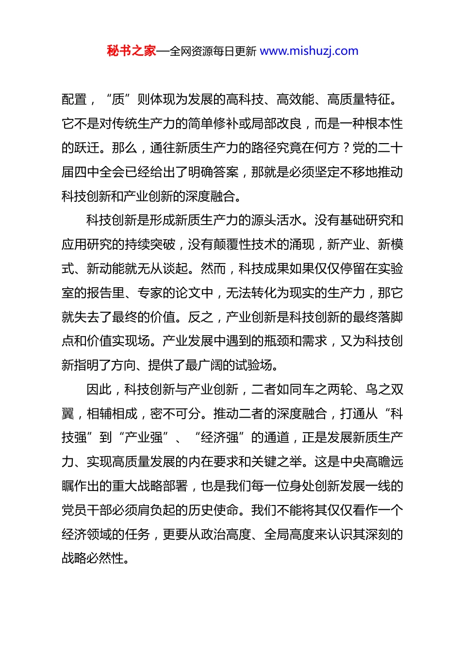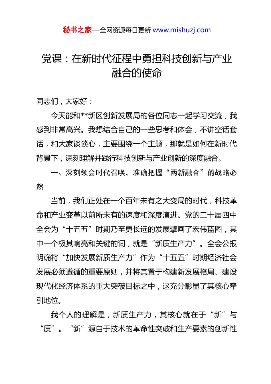 秘书之家—全网资源每日更新 www.mishuzj.com党课:在新时代征程中勇担科技创新与产业融合的使命 同志们,大家好:今天能和**新区创新发展局的各位同志一起学习交流,我感到非常高兴。我想结合自己的一些思考和体会,不讲空话套话,和大家谈谈心,主要围绕一个主题,那就是如何在新时代背景下,深刻理解并践行科技创新与产业创新的深度融合。一、深刻领会时代召唤,准确把握“两新融合”的战略必然当前,我们正处在一个百年未有之大变局的时代,科技革命和产业变革以前所未有的速度和深度演进。党的二十届四中全会为“十五五”时期乃至更长远的发展擘画了宏伟蓝图,其中一个极其响亮和关键的词,就是“新质生产力”。全会公报明确将“加快发展新质生产力”作为“十五五”时期经济社会发展必须遵循的重要原则,并将其置于构建新发展格局、建设现代化经济体系的重大突破目标之中,这充分彰显了其核心牵引地位。我个人的理解是,新质生产力,其核心就在于“新”与“质”。“新”源自于技术的革命性突破和生产要素的创新性秘书之家—全网资源每日更新 www.mishuzj.com配置,“质”则体现为发展的高科技、高效能、高质量特征。它不是对传统生产力的简单修补或局部改良,而是一种根本性的跃迁。那么,通往新质生产力的路径究竟在何方?党的二十届四中全会已经给出了明确答案,那就是必须坚定不移地推动科技创新和产业创新的深度融合。科技创新是形成新质生产力的源头活水。没有基础研究和应用研究的持续突破,没有颠覆性技术的涌现,新产业、新模式、新动能就无从谈起。然而,科技成果如果仅仅停留在实验室的报告里、专家的论文中,无法转化为现实的生产力,那它就失去了最终的价值。反之,产业创新是科技创新的最终落脚点和价值实现场。产业发展中遇到的瓶颈和需求,又为科技创新指明了方向、提供了最广阔的试验场。因此,科技创新与产业创新,二者如同车之两轮、鸟之双翼,相辅相成,密不可分。推动二者的深度融合,打通从“科技强”到“产业强”、“经济强”的通道,正是发展新质生产力、实现高质量发展的内在要求和关键之举。这是中央高瞻远瞩作出的重大战略部署,也是我们每一位身处创新发展一线的党员干部必须肩负起的历史使命。我们不能将其仅仅看作一个经济领域的任务,更要从政治高度、全局高度来认识其深刻的战略必然性。秘书之家—全网资源每日更新 www.mishuzj.com二、回顾过往实践反思,体悟“两新融合”的现实之困与破局之钥回顾我从事科技管理工作的这些年,对“两新融合”这个课题,感触尤为深刻。坦率地讲,在很长一段时间里,我们都面临着科技创新和产业发展“两张皮”的困境。我刚参加工作的时候,常常听到这样的情况:一边是高校和科研院所的科研人员,为了评职称、发论文,埋首于实验室,其研究成果与市场需求、产业应用严重脱节;另一边是我们的企业,尤其是传统企业,在生产一线遇到了技术难题,急需技术升级,却苦于找不到合适的技术、找不到能解决实际问题的专家。科研成果“束之高阁”,企业需求“嗷嗷待哺”,中间仿佛隔着一道无形的墙。这堵墙,是体制机制的障碍,是信息不对称的壁垒,更是思想观念的隔阂。这些年,情况发生了巨大的变化。我亲眼见证了**省和**新区在破解这一难题上付出的巨大努力。最核心的变化,就是创新主体的回归和创新生态的重塑。企业,特别是科技型企业,逐渐真正成为了技术创新的主体、研发投入的主体和成果转化的主体。它们不再是被动等待“输血”,而是主动“造血”,从市场端提出最真实的需求,驱动着创新的方向。同时,我们看到越来越多的新型研发机构、产业技术研究秘书之家—全网资源每日更新 www.mishuzj.com院在**新区这片热土上拔地而生。**新区的创新平台从成立之初的寥寥 3 家,发展到如今的 24 家,其中国家级平台实现了历史性突破。这些平台不再是传统意义上的“象牙塔”,它们一头连着科研,一头接着产业,扮演着“翻译官”和“催化剂”的角色,有效地促进了知识流、技术流、资本流和人才流的交汇融合。高新技术企业数量从 55 家增长到 342 家,省级以上研发平台从 20 家增长到 56 家,这些数字背后...