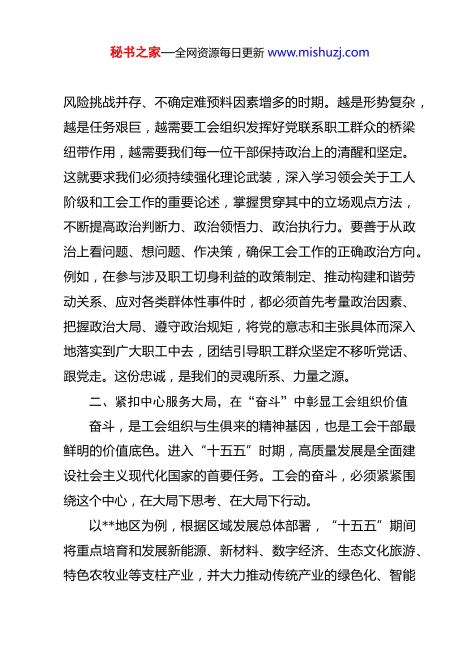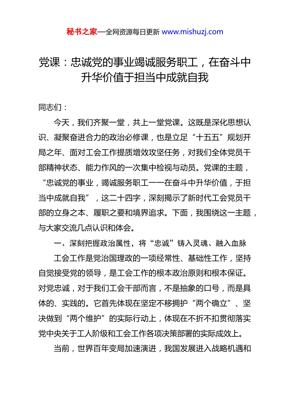 秘书之家—全网资源每日更新 www.mishuzj.com党课:忠诚党的事业竭诚服务职工,在奋斗中升华价值于担当中成就自我 同志们:今天,我们齐聚一堂,共上一堂党课。这既是深化思想认识、凝聚奋进合力的政治必修课,也是立足“十五五”规划开局之年、面对工会工作提质增效攻坚任务,对我们全体党员干部精神状态、能力作风的一次集中检视与动员。党课的主题,“忠诚党的事业,竭诚服务职工一一在奋斗中升华价值,于担当中成就自我”,这二十四字,深刻揭示了新时代工会党员干部的立身之本、履职之要和境界追求。下面,我围绕这一主题,与大家交流几点认识和体会。一、深刻把握政治属性,将“忠诚”铸入灵魂、融入血脉工会工作是党治国理政的一项经常性、基础性工作,坚持自觉接受党的领导,是工会工作的根本政治原则和根本保证。对党忠诚,对于我们工会干部而言,不是抽象的口号,而是具体的、实践的。它首先体现在坚定不移拥护“两个确立”、坚决做到“两个维护”的实际行动上,体现在不折不扣贯彻落实党中央关于工人阶级和工会工作各项决策部署的实际成效上。当前,世界百年变局加速演进,我国发展进入战略机遇和秘书之家—全网资源每日更新 www.mishuzj.com风险挑战并存、不确定难预料因素增多的时期。越是形势复杂,越是任务艰巨,越需要工会组织发挥好党联系职工群众的桥梁纽带作用,越需要我们每一位干部保持政治上的清醒和坚定。这就要求我们必须持续强化理论武装,深入学习领会关于工人阶级和工会工作的重要论述,掌握贯穿其中的立场观点方法,不断提高政治判断力、政治领悟力、政治执行力。要善于从政治上看问题、想问题、作决策,确保工会工作的正确政治方向。例如,在参与涉及职工切身利益的政策制定、推动构建和谐劳动关系、应对各类群体性事件时,都必须首先考量政治因素、把握政治大局、遵守政治规矩,将党的意志和主张具体而深入地落实到广大职工中去,团结引导职工群众坚定不移听党话、跟党走。这份忠诚,是我们的灵魂所系、力量之源。二、紧扣中心服务大局,在“奋斗”中彰显工会组织价值奋斗,是工会组织与生俱来的精神基因,也是工会干部最鲜明的价值底色。进入“十五五”时期,高质量发展是全面建设社会主义现代化国家的首要任务。工会的奋斗,必须紧紧围绕这个中心,在大局下思考、在大局下行动。以**地区为例,根据区域发展总体部署,“十五五”期间将重点培育和发展新能源、新材料、数字经济、生态文化旅游、特色农牧业等支柱产业,并大力推动传统产业的绿色化、智能秘书之家—全网资源每日更新 www.mishuzj.com化改造升级。这对我们的工作提出了全新的、更高的要求。工会的奋斗,就要体现在团结动员广大职工在这些重点领域、关键环节建功立业上。我们不能有“躺平”、“摆烂”的心态,更不能当旁观者、评论家,而必须以“时时放心不下”的责任感和积极担当作为的精气神,履职尽责。具体而言,一是要搭建更具吸引力和实效性的劳动和技能竟赛平台。不能局限于传统形式,要紧密对接**地区重点产业链和创新链的需求,设计开展主题鲜明、针对性强的竞赛活动。例如,在新能源项目建设中开展“保安全、保质量、保进度”竟赛,在数字经济领域开展数据治理、软件开发等技能比武,在生态文化旅游行业开展服务品质提升竞赛。目标是到 2026 年底,争取覆盖重点产业 80%以上的核心企业,参与职工人数较2025 年增长 15%以上。二是要深化产业工人队伍建设改革。这是工会服务高质量发展的战略支点。我们要推动构建“党委领导、政府负责、工会推动、企业主体、社会参与”的工作格局,特别是在技能提升方面,要联合人社、教育部门和龙头企业,共建共享一批高水平实训基地,推广“校企双制、工学一体”的培养模式。力争在“十五五”期间,帮助*万名以上产业工人提升技能等级,培育选树**名以上具有区域影响力的“**工匠”。三是要大力弘扬劳模精神、劳动精神、工匠精神。创新秘书之家—全网资源每日更新 www.mishuzj.com宣传方式,运用短视频、融媒体、线下宣讲团等多种形式,让劳模工匠的故事走进车间班组、深入人心。要推动完善技术工人薪酬待遇与技能等级挂钩的激励机...