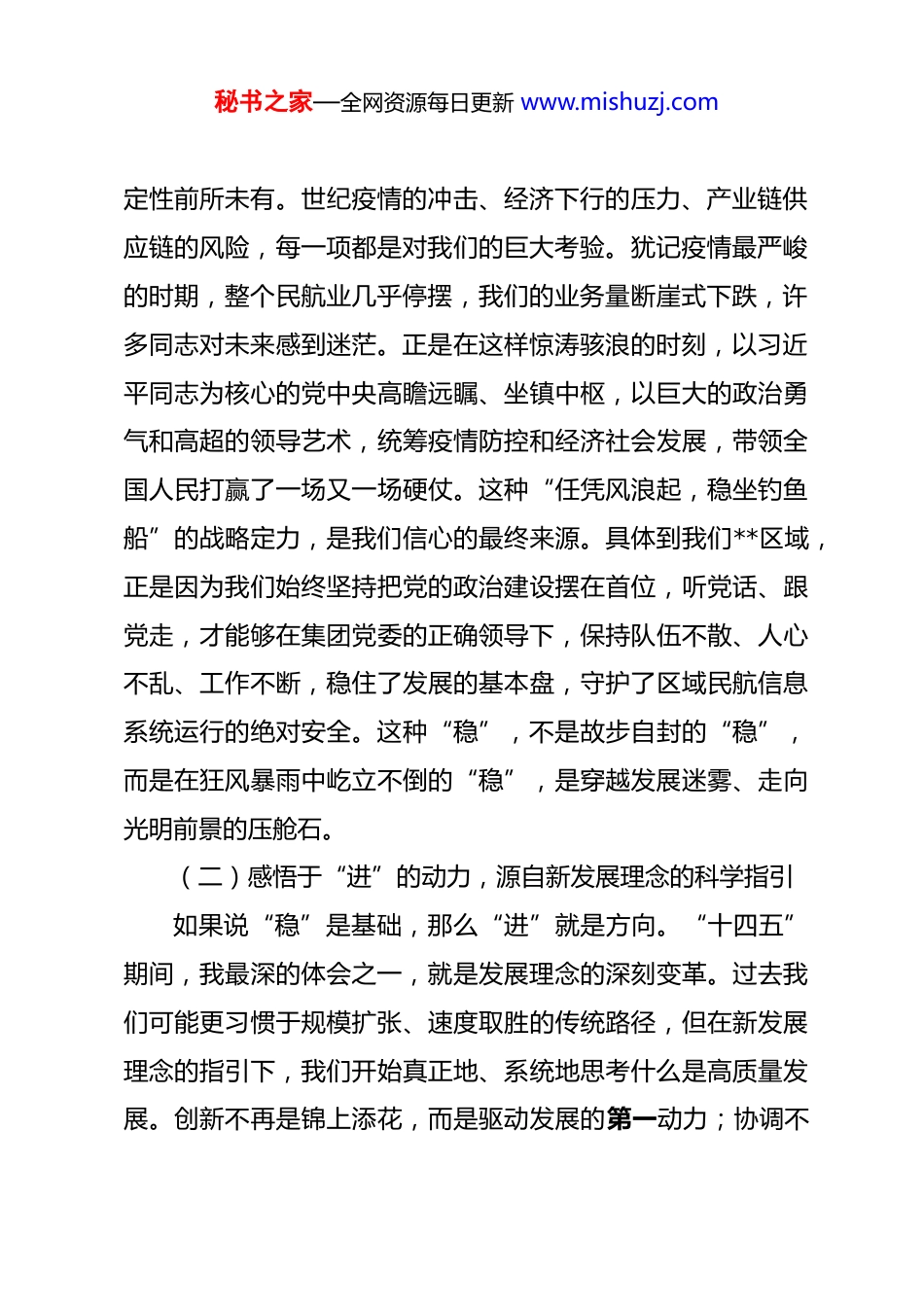秘书之家—全网资源每日更新 www.mishuzj.com党课讲稿:坚持自我革命,勇担时代使命,在高质量发展新征程中书写新篇章 同志们:大家好。今天,我们齐聚一堂,共同深入学习领会党的二十届四中全会精神。这既是一次集中的理论学习,更是一次思想的交流与碰撞。我想借此机会,不谈具体的工作成绩,而是结合“十四五”的亲身经历和对“十五五”的思考,与大家分享一些我个人不成熟的感悟和体会,希望能与同志们共勉,共同探寻我们**区域未来的发展之路。一、回望来路,在“极不平凡”的奋斗中深刻感悟思想伟力“十四五”这五年,于国家、于集团、于我们区域、于我们每个人而言,都是极不寻常、极不平凡的五年。回望这风雨兼程的 1800 多个日夜,许多场景依然历历在目。我常常在思考,是什么力量支撑我们走过那些看似不可能逾越的难关,取得这些来之不易的成就?我的答案是,思想的伟力。这种伟力,具体体现在三个深刻的感悟上。(一)感悟于“稳”的定力,源自党的坚强领导过去的五年,我们面临的内外环境复杂性、严峻性、不确秘书之家—全网资源每日更新 www.mishuzj.com定性前所未有。世纪疫情的冲击、经济下行的压力、产业链供应链的风险,每一项都是对我们的巨大考验。犹记疫情最严峻的时期,整个民航业几乎停摆,我们的业务量断崖式下跌,许多同志对未来感到迷茫。正是在这样惊涛骇浪的时刻,以习近平同志为核心的党中央高瞻远瞩、坐镇中枢,以巨大的政治勇气和高超的领导艺术,统筹疫情防控和经济社会发展,带领全国人民打赢了一场又一场硬仗。这种“任凭风浪起,稳坐钓鱼船”的战略定力,是我们信心的最终来源。具体到我们**区域,正是因为我们始终坚持把党的政治建设摆在首位,听党话、跟党走,才能够在集团党委的正确领导下,保持队伍不散、人心不乱、工作不断,稳住了发展的基本盘,守护了区域民航信息系统运行的绝对安全。这种“稳”,不是故步自封的“稳”,而是在狂风暴雨中屹立不倒的“稳”,是穿越发展迷雾、走向光明前景的压舱石。(二)感悟于“进”的动力,源自新发展理念的科学指引如果说“稳”是基础,那么“进”就是方向。“十四五”期间,我最深的体会之一,就是发展理念的深刻变革。过去我们可能更习惯于规模扩张、速度取胜的传统路径,但在新发展理念的指引下,我们开始真正地、系统地思考什么是高质量发展。创新不再是锦上添花,而是驱动发展的第一动力;协调不秘书之家—全网资源每日更新 www.mishuzj.com再是权宜之计,而是发展的内在要求;绿色不再是外部约束,而是企业生存的生命线;开放不再是简单引进来,而是更高水平的内外联动;共享不再是一句口号,而是发展的根本目的。这一转变过程,伴随着阵痛,充满了挑战。我们推动数字化转型,会遇到技术瓶颈和思维惯性的阻力;我们优化产品结构,会面临短期收益和长期发展的博弈。但正是这种“进”的追求,逼迫我们跳出舒适区,去啃最硬的骨头,去攻最险的山头。我们不再仅仅满足于做一个系统运行的保障者,而是开始努力成为区域客户数字化转型的赋能者。这种“进”,是发展动能的转换,是思维范式的跃迁,更是我们面向未来、赢得主动的必由之路。(三)感悟于“人”的伟力,源自我们每一个平凡个体的坚守与奉献宏大的时代叙事,最终是由一个个具体的人来书写的。五年来的点点滴滴,最让我感动的,始终是身边的同事们。我看到了为了保障系统升级,连续奋战几个通宵,累了就在机房角落里靠一会儿的年轻技术骨干;我看到了为了一个新项目的落地,不厌其烦与客户沟通,磨破嘴皮、跑断双腿的市场人员;我也看到了在疫情期间,克服重重困难,坚守岗位,确保机场一线业务平稳运行的驻场同事。大家没有豪言壮语,却用行动秘书之家—全网资源每日更新 www.mishuzj.com诠释了什么是责任与担当。正是这成千上万个平凡岗位上的坚守与奉献,汇聚成了推动**区域滚滚向前的磅礴力量。成就的取得,从来不是某一个人的功劳,它属于区域内的每一位奋斗者。这种根植于广大干部职工之中的主人翁精神和无私奉献精神,是我们战胜一切困难、不断从胜利走向胜利的最宝贵财富。二、认清时势,在“承前启后”的节点上准确把握历...