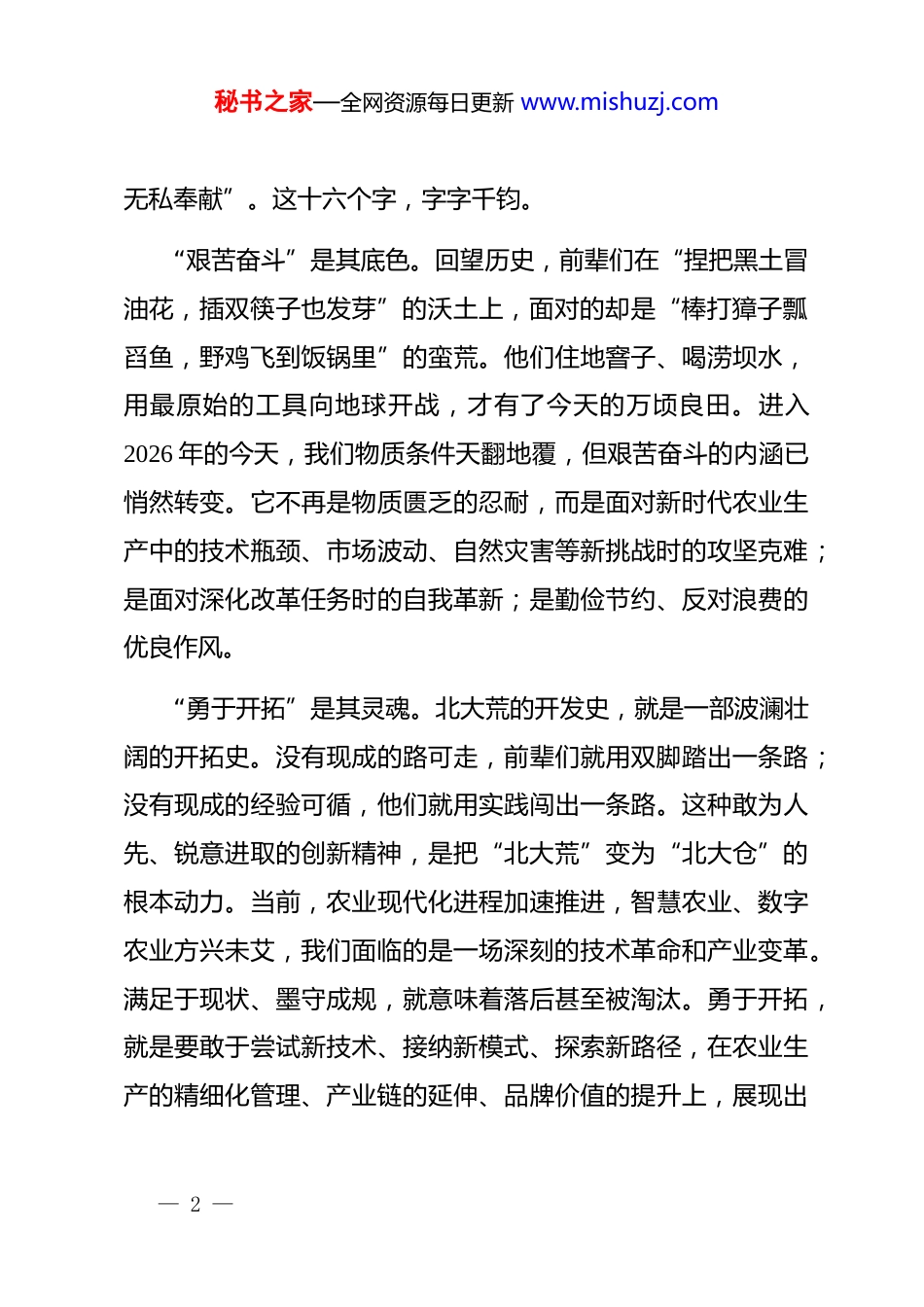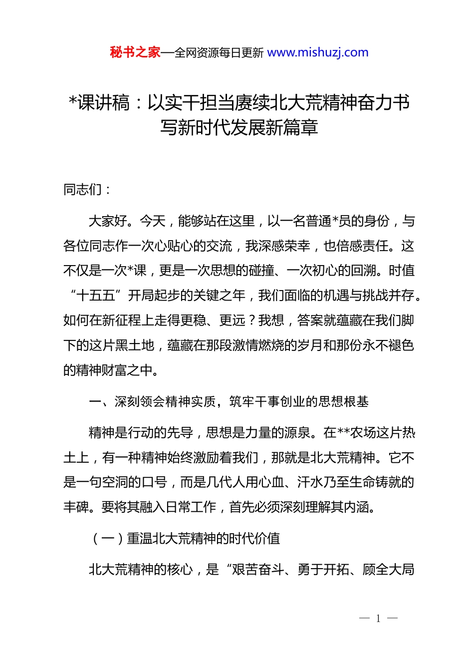秘书之家—全网资源每日更新 www.mishuzj.com*课讲稿:以实干担当赓续北大荒精神奋力书写新时代发展新篇章同志们:大家好。今天,能够站在这里,以一名普通*员的身份,与各位同志作一次心贴心的交流,我深感荣幸,也倍感责任。这不仅是一次*课,更是一次思想的碰撞、一次初心的回溯。时值“十五五”开局起步的关键之年,我们面临的机遇与挑战并存。如何在新征程上走得更稳、更远?我想,答案就蕴藏在我们脚下的这片黑土地,蕴藏在那段激情燃烧的岁月和那份永不褪色的精神财富之中。一、深刻领会精神实质,筑牢干事创业的思想根基精神是行动的先导,思想是力量的源泉。在**农场这片热土上,有一种精神始终激励着我们,那就是北大荒精神。它不是一句空洞的口号,而是几代人用心血、汗水乃至生命铸就的丰碑。要将其融入日常工作,首先必须深刻理解其内涵。(一)重温北大荒精神的时代价值北大荒精神的核心,是“艰苦奋斗、勇于开拓、顾全大局— 1 —秘书之家—全网资源每日更新 www.mishuzj.com无私奉献”。这十六个字,字字千钧。“艰苦奋斗”是其底色。回望历史,前辈们在“捏把黑土冒油花,插双筷子也发芽”的沃土上,面对的却是“棒打獐子瓢舀鱼,野鸡飞到饭锅里”的蛮荒。他们住地窨子、喝涝坝水,用最原始的工具向地球开战,才有了今天的万顷良田。进入2026 年的今天,我们物质条件天翻地覆,但艰苦奋斗的内涵已悄然转变。它不再是物质匮乏的忍耐,而是面对新时代农业生产中的技术瓶颈、市场波动、自然灾害等新挑战时的攻坚克难;是面对深化改革任务时的自我革新;是勤俭节约、反对浪费的优良作风。“勇于开拓”是其灵魂。北大荒的开发史,就是一部波澜壮阔的开拓史。没有现成的路可走,前辈们就用双脚踏出一条路;没有现成的经验可循,他们就用实践闯出一条路。这种敢为人先、锐意进取的创新精神,是把“北大荒”变为“北大仓”的根本动力。当前,农业现代化进程加速推进,智慧农业、数字农业方兴未艾,我们面临的是一场深刻的技术革命和产业变革。满足于现状、墨守成规,就意味着落后甚至被淘汰。勇于开拓,就是要敢于尝试新技术、接纳新模式、探索新路径,在农业生产的精细化管理、产业链的延伸、品牌价值的提升上,展现出— 2 —秘书之家—全网资源每日更新 www.mishuzj.com新时代的闯劲和智慧。“顾全大局”是其胸怀。北大荒的建设者来自五湖四海,他们响应国家号召,把个人理想融入国家需要,将家庭命运与祖国发展紧密相连。这种胸怀全局、着眼长远的爱国主义情怀,是北大荒人矢志不渝的准则。今天,保障国家粮食安全依然是“国之大者”。我们**管理区的每一块耕地,都关系着国家的粮仓。顾全大局,就是要站在维护国家粮食安全的高度,不折不扣地执行好各项农业生产政策,确保粮食稳产增产;就是要正确处理好经济发展与生态保护的关系,走绿色、可持续的发展之路,为子孙后代留下一片净土。“无私奉献”是其境界。在那段艰苦卓绝的岁月里,无数英雄模范不计个人得失,把最宝贵的青春和生命献给了这片土地。马永顺、梁军、赵尚志……这些闪亮的名字背后,是对*和人民事业的无限忠诚。这种不图名利、忘我工作的高尚情操,是北大荒精神的升华。在和平年代,无私奉献更多体现为一种职业操守和责任担当。它体现在日常岗位上的兢兢业业,体现在为职工群众办实事、解难题时的真情实意,体现在关键时刻能够豁得出、顶得上、靠得住的*员本色。(二)以北大荒精神引领新征程的现实紧迫性— 3 —秘书之家—全网资源每日更新 www.mishuzj.com进入新时代,我们不能躺在功劳簿上。传承和弘扬北大荒精神,具有强烈的现实紧迫性。一方面,这是推动农业现代化的必然要求。北大荒集团正致力于打造现代农业航母,而我们**管理区作为其中的一个单元,必须跟上集团发展的步伐。推进农业生产的标准化、规模化、智能化,每一项都离不开开拓创新和艰苦奋斗的精神。另一方面,这是应对风险挑战的强大武器。当前国际形势复杂多变,国内改革发展稳定任务艰巨。农业作为基础产业,其稳定发展的重要性愈发凸显。我们需要用顾全大局的意识来应对外部环境的不确定性,用无私奉献的精神来凝聚内...