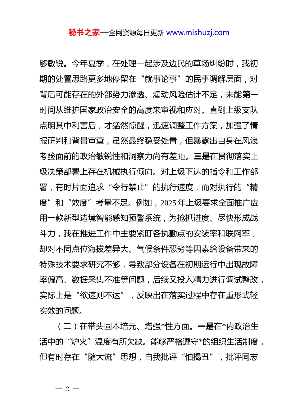 秘书之家—全网资源每日更新 www.mishuzj.com*委委员 2025 年度民主生活会个人对照检查发言材料按照本次民主生活会的要求,我紧扣会议主题,深入学习领会**************思想、*的二十届三中、四中全会精神和******重要讲话、****批示精神,并结合全区正在深入开展的纪律作风教育整顿教育,对照 5 个方面内容,深入查摆自身存在的问题,深刻剖析问题根源,明确了今后的努力方向和整改措施。现将个人对照检查情况报告如下。一、存在的主要问题(一)在带头强化政治忠诚、提高政治能力方面。一是对*的二十届四中全会精神的战略意蕴领会不够透彻。在学习全会关于十五五规划战略的重大部署时,理论联系实际的深度有所欠缺。在组织*委中心组学习时,满足于通读公报、解读文章,但在如何将中央顶层设计与我们大队地处高寒缺氧、社情复杂的边境实际相结合,如何创新性地构建符合新时代要求的边境立体防控体系方面,引导研讨不深、思考谋划不细,未能完全将学习成果转化为应对边境潜在风险挑战的“先手棋”和“制胜招”。二是在复杂敏感问题上的政治判断力仍需锤炼。面对边境地区错综复杂的内外环境,有时对一些潜在的风险辨别不— 1 —秘书之家—全网资源每日更新 www.mishuzj.com够敏锐。今年夏季,在处理一起涉及边民的草场纠纷时,我初期的处置思路更多地停留在“就事论事”的民事调解层面,对背后可能存在的外部势力渗透、煽动风险估计不足,未能第一时间从维护国家政治安全的高度来审视和应对。直到上级支队点明其中利害后,才猛然惊醒,迅速调整工作方案,加强了情报研判和背景审查,虽然最终稳妥处置,但暴露出自身在风浪考验面前的政治敏锐性和洞察力尚有差距。三是在贯彻落实上级决策部署上存在机械执行倾向。对上级下达的指令和工作部署,有时片面追求“令行禁止”的执行速度,而对执行的“精度”和“效度”考量不足。例如,2025 年上级要求全面推广应用一款新型边境智能感知预警系统,为抢抓进度、尽快形成战斗力,我在推进工作中主要紧盯各执勤点的安装率和联网率,却对不同点位海拔差异大、气候条件恶劣等因素给设备带来的特殊技术要求研究不够,导致部分设备在初期运行中出现故障率偏高、数据采集不准等问题,后续又投入精力进行调试整改,实际上是“欲速则不达”,反映出在落实过程中存在重形式轻实效的问题。(二)在带头固本培元、增强*性方面。一是在*内政治生活中的“炉火”温度有所欠缺。能够严格遵守*的组织生活制度,但有时存在“随大流”思想,自我批评“怕揭丑”,批评同志— 2 —秘书之家—全网资源每日更新 www.mishuzj.com“怕伤人”。在一次讨论某位同志违纪处分决定的支部会议上,几位同志发言后,我感到自己的观点与他们大同小异,便选择了默不作声,没有从关心爱护同志的角度出发,对其犯错的思想根源进行更深层次的剖析和警醒。这种“老好人”心态,实质上是*性原则不强的表现,削弱了*内政治生活的政治性、时代性、原则性和战斗性。二是在传承红色基因、赓续革命血脉上做得不够鲜活。作为长期在雪域高原工作的*员干部,对“老西藏精神”“两路精神”怀有深厚感情,但在实际工作中,将其转化为激励队伍、凝聚警心的具体举体措施不多。在对新入职的年轻民警进行思想引导时,更多的是通过下达命令、提出纪律要求等行政手段进行管理,而较少运用我们单位戍边历史中的英雄事迹和感人故事来触动他们的灵魂、激发他们的内生动力,导致思想政治工作的感染力和穿透力不足。三是砥砺道德品行、坚守精神高地的自觉性有待加强。在高强度、高压力的工作环境下,有时会不自觉地放松对个人“八小时之外”的严格要求。在完成一天繁重的巡逻执勤和机关事务后,回到宿舍习惯于刷手机、看短视频来放松解压,而静下心来读一本理论书籍、写一篇心得体会的时间越来越少。这种不经意的懈怠,反映出在锤炼纯正道德品质、涵养共产*人精神追求上,还缺乏“慎独”“慎微”的恒心与毅力,“总开关”拧得还不够紧。— 3 —秘书之家—全网资源每日更新 www.mishuzj.com(三)在带头敬畏人民、敬畏组织、敬畏法纪方面。一是在践行新时代*的群众路线、落实“四下基层”制度...