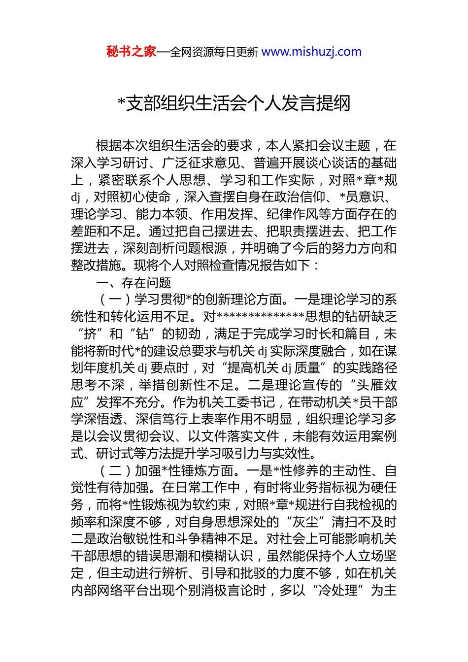 秘书之家—全网资源每日更新 www.mishuzj.com*支部组织生活会个人发言提纲根据本次组织生活会的要求,本人紧扣会议主题,在深入学习研讨、广泛征求意见、普遍开展谈心谈话的基础上,紧密联系个人思想、学习和工作实际,对照*章*规dj,对照初心使命,深入查摆自身在政治信仰、*员意识、理论学习、能力本领、作用发挥、纪律作风等方面存在的差距和不足。通过把自己摆进去、把职责摆进去、把工作摆进去,深刻剖析问题根源,并明确了今后的努力方向和整改措施。现将个人对照检查情况报告如下:一、存在问题(一)学习贯彻*的创新理论方面。一是理论学习的系统性和转化运用不足。对**************思想的钻研缺乏“挤”和“钻”的韧劲,满足于完成学习时长和篇目,未能将新时代*的建设总要求与机关 dj 实际深度融合,如在谋划年度机关 dj 要点时,对“提高机关 dj 质量”的实践路径思考不深,举措创新性不足。二是理论宣传的“头雁效应”发挥不充分。作为机关工委书记,在带动机关*员干部学深悟透、深信笃行上表率作用不明显,组织理论学习多是以会议贯彻会议、以文件落实文件,未能有效运用案例式、研讨式等方法提升学习吸引力与实效性。(二)加强*性锤炼方面。一是*性修养的主动性、自觉性有待加强。在日常工作中,有时将业务指标视为硬任务,而将*性锻炼视为软约束,对照*章*规进行自我检视的频率和深度不够,对自身思想深处的“灰尘”清扫不及时二是政治敏锐性和斗争精神不足。对社会上可能影响机关干部思想的错误思潮和模糊认识,虽然能保持个人立场坚定,但主动进行辨析、引导和批驳的力度不够,如在机关内部网络平台出现个别消极言论时,多以“冷处理”为主秘书之家—全网资源每日更新 www.mishuzj.com缺乏旗帜鲜明的正面引导。(三)铸牢中华民族共同体意识方面。一是对铸牢共同体意识的工作载体创新不足。在机关文化建设中,融入中华文化符号和中华民族形象的系统性谋划不够,相关活动形式较为传统,对年轻干部的吸引力不强,文化浸润的实效性有待提升。二是在推动国家通用语言文字使用上的示范引领作用不明显。在机关会议、公文处理等公务场合虽能坚持使用,但对营造机关内部人人愿用、乐用国家通用语言的浓厚氛围思考不多、推动不力。(四)联系服务群众方面。一是深入基层解决实际问题的韧劲不足。下基层调研有时存在“走马观花”现象,对群众和企业反映的深层次问题挖掘不够,提出的对策建议宏观要求多、可操作性强的具体措施少,如对某企业反映的“dj 与业务融合难”问题,后续跟踪协调解决不够到位。二是服务群众的机制不够优化。对“为民办实事”项目的全过程管理有欠缺,重立项轻问效,对一些项目的后期成效评估不足,未能完全形成“群众提诉求、工委协调支部落实、群众评价”的闭环。(五)发挥先锋模范作用方面。一是在攻坚克难中担当作为的锐气不足。面对机关 dj 中的一些老大难问题,如部分单位“灯下黑”现象,有时存在畏难情绪,缺乏一抓到底的狠劲和韧劲,创新突破的举措不多。二是运用信息化手段提升 dj 质效的能力有待加强。对“智慧 dj”的规律研究不深,推动现有 dj 平台功能优化、数据整合利用的力度不够,未能充分发挥信息化对机关 dj 的赋能作用。(六)改作风树新风方面。一是形式主义问题仍未根除。对基层 dj 工作的考核评价中,有时过于注重材料、台账的规范性,对工作实际效果和*员群众满意度的关注不够,无形中增加了基层负担。二是艰苦奋斗、勤俭节约的意识有所淡化。在组织机关大型会议活动时,有时过于讲究形式和规格,在落实“过紧日子”要求上不够严格细致,对秘书之家—全网资源每日更新 www.mishuzj.com机关内部的浪费现象提醒批评不够。二、问题产生的原因剖析(一)理论武装的自觉性、系统性不足。对**************思想的学习缺乏内在驱动力,未能真正把理论武装作为提升政治能力、指导工作实践的根本途径,满足于完成“规定动作”,对新时代*的治疆方略等重大理论的深层逻辑和实践要求钻研不深,导致学用脱节。(二)*性锤炼的主动性、深刻性不够。在基层事务性工作中逐渐淡化了对*性修养的持续锤炼,未能时刻以*员...