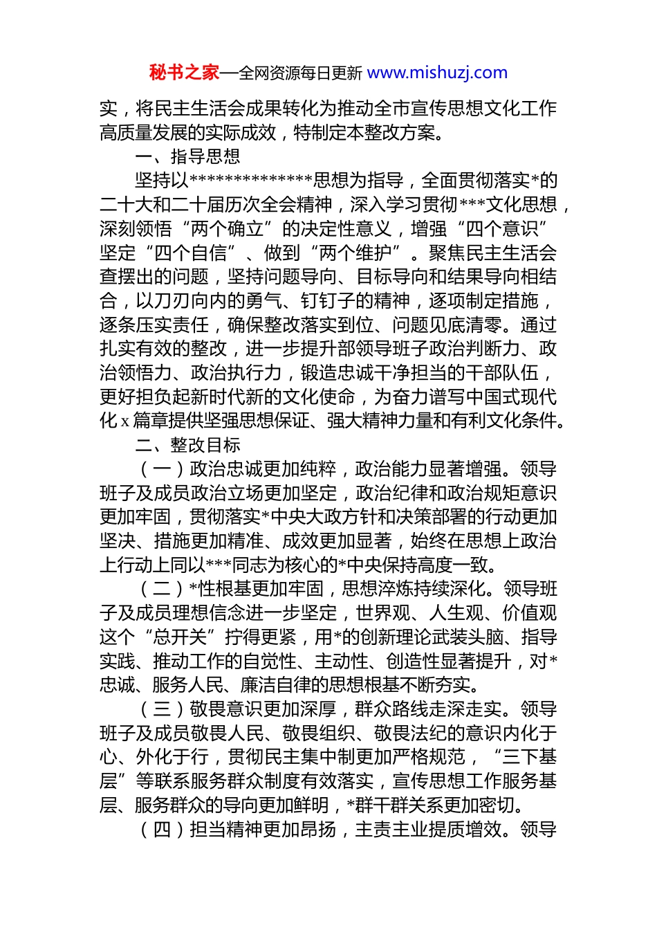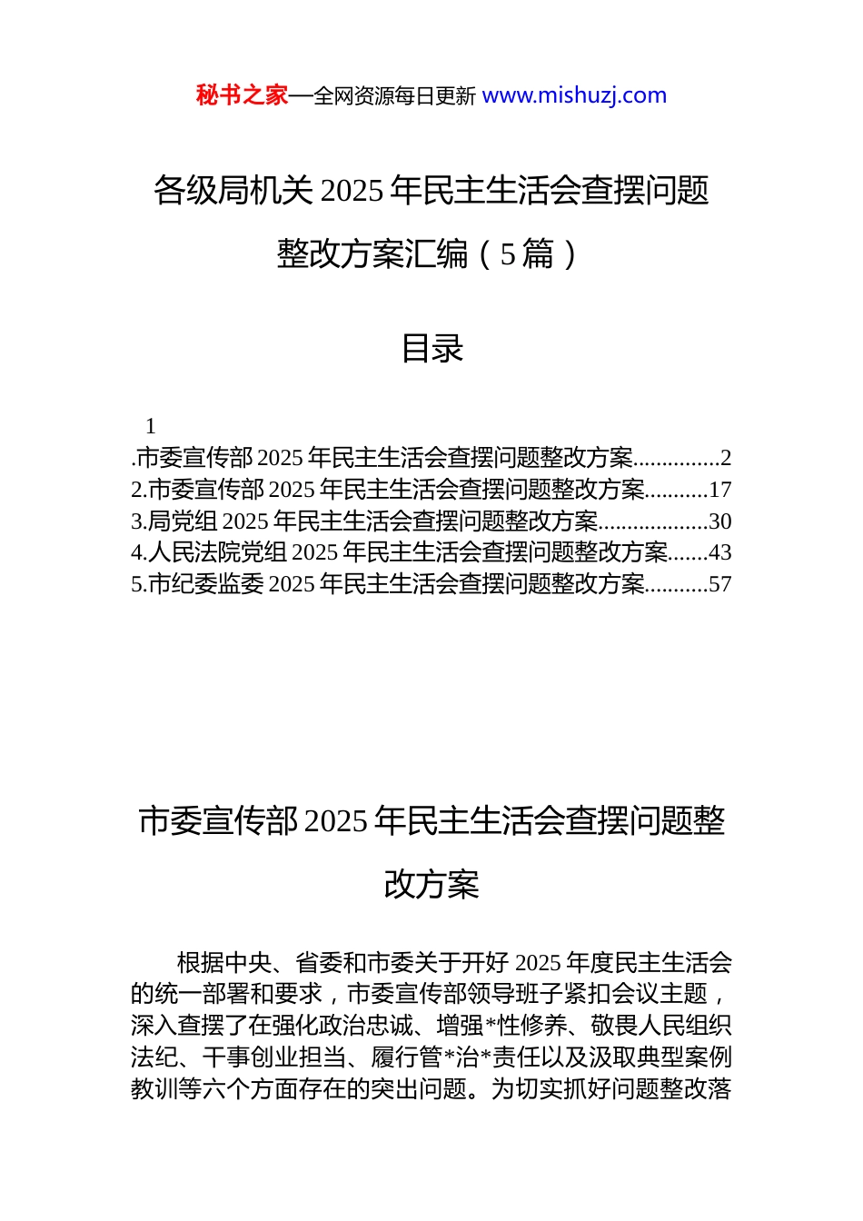 秘书之家—全网资源每日更新 www.mishuzj.com各级局机关 2025 年民主生活会查摆问题整改方案汇编(5 篇)目录1.市委宣传部 2025 年民主生活会查摆问题整改方案...............22.市委宣传部 2025 年民主生活会查摆问题整改方案...........173.局党组 2025 年民主生活会查摆问题整改方案...................304.人民法院党组 2025 年民主生活会查摆问题整改方案.......435.市纪委监委 2025 年民主生活会查摆问题整改方案...........57市委宣传部 2025 年民主生活会查摆问题整改方案根据中央、省委和市委关于开好 2025 年度民主生活会的统一部署和要求,市委宣传部领导班子紧扣会议主题,深入查摆了在强化政治忠诚、增强*性修养、敬畏人民组织法纪、干事创业担当、履行管*治*责任以及汲取典型案例教训等六个方面存在的突出问题。为切实抓好问题整改落秘书之家—全网资源每日更新 www.mishuzj.com实,将民主生活会成果转化为推动全市宣传思想文化工作高质量发展的实际成效,特制定本整改方案。一、指导思想坚持以**************思想为指导,全面贯彻落实*的二十大和二十届历次全会精神,深入学习贯彻***文化思想,深刻领悟“两个确立”的决定性意义,增强“四个意识”坚定“四个自信”、做到“两个维护”。聚焦民主生活会查摆出的问题,坚持问题导向、目标导向和结果导向相结合,以刀刃向内的勇气、钉钉子的精神,逐项制定措施,逐条压实责任,确保整改落实到位、问题见底清零。通过扎实有效的整改,进一步提升部领导班子政治判断力、政治领悟力、政治执行力,锻造忠诚干净担当的干部队伍,更好担负起新时代新的文化使命,为奋力谱写中国式现代化 x 篇章提供坚强思想保证、强大精神力量和有利文化条件。二、整改目标(一)政治忠诚更加纯粹,政治能力显著增强。领导班子及成员政治立场更加坚定,政治纪律和政治规矩意识更加牢固,贯彻落实*中央大政方针和决策部署的行动更加坚决、措施更加精准、成效更加显著,始终在思想上政治上行动上同以***同志为核心的*中央保持高度一致。(二)*性根基更加牢固,思想淬炼持续深化。领导班子及成员理想信念进一步坚定,世界观、人生观、价值观这个“总开关”拧得更紧,用*的创新理论武装头脑、指导实践、推动工作的自觉性、主动性、创造性显著提升,对*忠诚、服务人民、廉洁自律的思想根基不断夯实。(三)敬畏意识更加深厚,群众路线走深走实。领导班子及成员敬畏人民、敬畏组织、敬畏法纪的意识内化于心、外化于行,贯彻民主集中制更加严格规范,“三下基层”等联系服务群众制度有效落实,宣传思想工作服务基层、服务群众的导向更加鲜明,*群干群关系更加密切。(四)担当精神更加昂扬,主责主业提质增效。领导秘书之家—全网资源每日更新 www.mishuzj.com班子及成员树立和践行正确政绩观,干事创业、攻坚克难的精气神全面提振,把握意识形态工作领导权、管理权、话语权的能力显著增强,新闻舆论引导、精神文明建设、文化繁荣发展等各项工作实现新突破,服务中心大局的贡献度持续提升。(五)管*治*更加从严,政治生态持续净化。领导班子及成员履行全面从严治*主体责任和“一岗双责”更加自觉有力,纪律作风建设抓常抓长,形式主义、官僚主义得到有效整治,选人用人导向更加鲜明,权力运行监督制约机制更加完善,风清气正的政治生态不断巩固发展。(六)以案促改更加到位,警示防线全面筑牢。深刻汲取违反中央八项规定精神等典型案例教训,警示教育入脑入心,“三不腐”一体推进的综合效应充分显现,*员干部纪法意识、规矩意识、底线意识显著增强,拒腐防变的思想堤坝更加坚固。三、整改措施针对民主生活会查摆出的突出问题,坚持即知即改、立行立改与长期坚持相结合,制定如下整改措施:(一)聚焦政治忠诚与政治能力提升,铸牢绝对忠诚之魂针对在带头强化政治忠诚、提高政治能力方面存在的理论武装系统性深度有待加强、政治敏锐性和鉴别力需进一步提升、将*中央决策部署创造性转化为宣传实践的结合点找得不够精准等问题,提出以下整改措施:1.深化理论武装系统学研,夯实绝对忠诚思想根基。严格落实“第一议题”制度,...