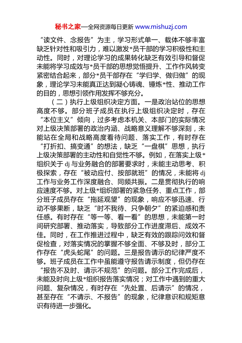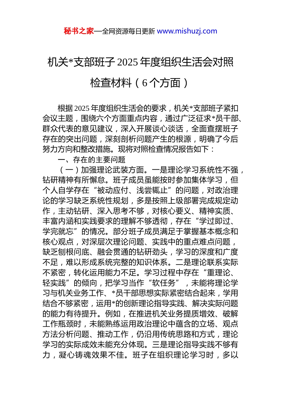 秘书之家—全网资源每日更新 www.mishuzj.com机关*支部班子 2025 年度组织生活会对照检查材料(6 个方面)根据 2025 年度组织生活会的要求,机关*支部班子紧扣会议主题,围绕六个方面重点内容,通过广泛征求*员干部、群众代表的意见建议,深入开展谈心谈话,全面查摆班子存在的突出问题,深刻剖析问题产生的根源,明确了今后努力方向和整改措施。现将对照检查情况报告如下:一、存在的主要问题(一)加强理论武装方面。一是理论学习系统性不强,钻研精神有所懈怠。班子成员虽能按时参加集体学习,但个人自学存在“被动应付、浅尝辄止”的问题,对政治理论的学习缺乏系统性规划,多是按照上级部署完成规定动作,主动钻研、深入思考不够,对核心要义、精神实质、丰富内涵和实践要求的理解不够透彻,存在“学过即过、学完就忘”的情况。部分班子成员满足于掌握基本概念和核心观点,对深层次理论问题、实践中的重点难点问题,缺乏刨根问底、融会贯通的钻研劲头,学习的深度和广度不足,难以形成系统完整的知识体系。二是理论联系实际不紧密,转化运用能力不足。学习过程中存在“重理论、轻实践”的倾向,把学习当作“软任务”,未能将理论学习与机关业务工作、*员干部思想实际紧密结合起来,学用结合不够紧密,运用*的创新理论指导实践、解决实际问题的能力有待提升。例如,在推进机关业务提质增效、破解工作瓶颈时,未能熟练运用政治理论中蕴含的立场、观点方法分析问题、推动工作,仍沿用传统思路和方式,理论学习的实际成效未能充分体现。三是理论指导实践不够有力,凝心铸魂效果不佳。班子在组织理论学习时,多以秘书之家—全网资源每日更新 www.mishuzj.com“读文件、念报告”为主,学习形式单一、载体不够丰富缺乏针对性和吸引力,难以激发*员干部的学习积极性和主动性。同时,对理论学习的成果转化缺乏有效引导和督促未能将学习成效与*员干部的思想觉悟提升、工作作风转变紧密结合起来,部分*员干部存在“学归学、做归做”的现象,理论学习未能真正达到凝心铸魂、锤炼*性、推动工作的目的,思想引领作用发挥不够充分。(二)执行上级组织决定方面。一是政治站位的思想高度不够。部分班子成员在执行上级组织决定时,存在“本位主义”倾向,过多考虑本机关、本部门的实际情况对上级决策部署的政治内涵、战略意义理解不够深刻,未能站在全局和战略高度看待问题、落实工作,有时存在“打折扣、搞变通”的想法,缺乏“一盘棋”思想,执行上级决策部署的主动性和自觉性不够。例如,在落实上级*组织关于 dj 与业务融合的部署要求时,未能主动思考、积极探索,存在“被动应付、按部就班”的情况,未能将 dj工作与业务工作深度融合、同频共振。二是贯彻执行的响应速度不够。对上级*组织部署的紧急任务、重点工作,部分班子成员存在“拖延观望”的现象,响应不够迅速、行动不够果断,缺乏“时不我待、只争朝夕”的紧迫感和责任感。有时存在“等一等、看一看”的思想,未能第一时间研究部署、推动落实,导致部分工作进度滞后、成效不佳。同时,在工作推进过程中,缺乏有效的跟踪问效和督促检查,对落实情况的掌握不够全面、不够及时,部分工作存在“虎头蛇尾”的问题。三是报告请示的纪律严度不够。班子成员在工作中虽能遵守报告请示制度,但仍存在“报告不及时、请示不规范”的问题。部分工作完成后,未能及时向上级*组织报告落实情况;对工作中遇到的重大问题、复杂情况,有时存在“先处置、后请示”的情况,甚至存在“不请示、不报告”的现象,纪律意识和规矩意识有待进一步强化。秘书之家—全网资源每日更新 www.mishuzj.com(三)严格组织生活方面。一是组织生活的规范性不彻底。虽然能够按时召开“三会一课”、组织生活会、民主评议*员等组织生活,但部分组织生活存在程序不够规范、内容不够充实的问题。例如,“三会一课”的内容有时与*员干部的思想实际和工作需求结合不够紧密,缺乏针对性和吸引力;组织生活会的准备工作不够充分,征求意见不够广泛,谈心谈话不够深入,导致会议质量不高。二是批评与自我批评的锋利性不彻底。在组织生活会和民主评议*员过程中,班子成...