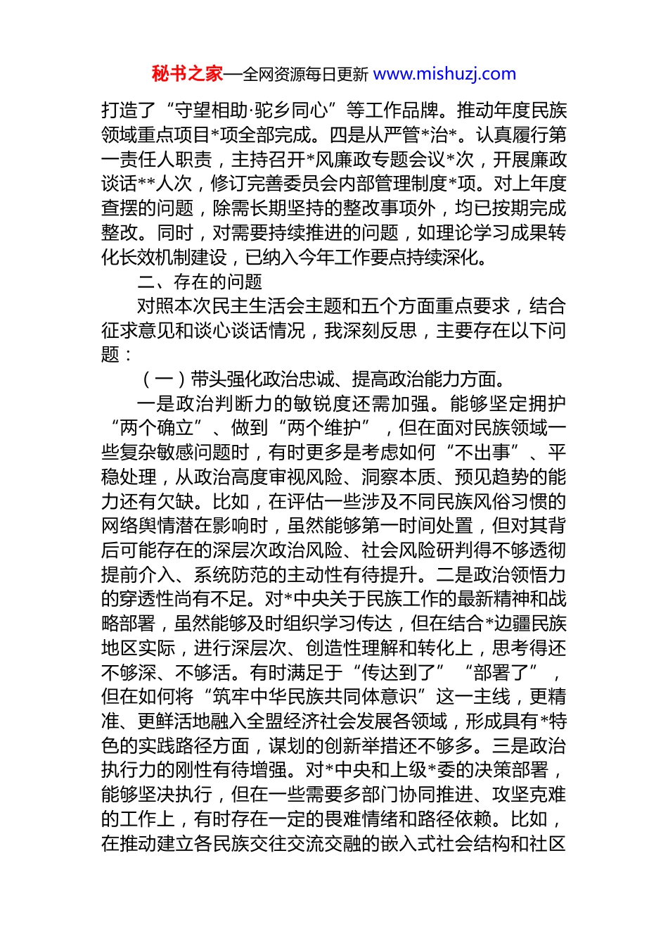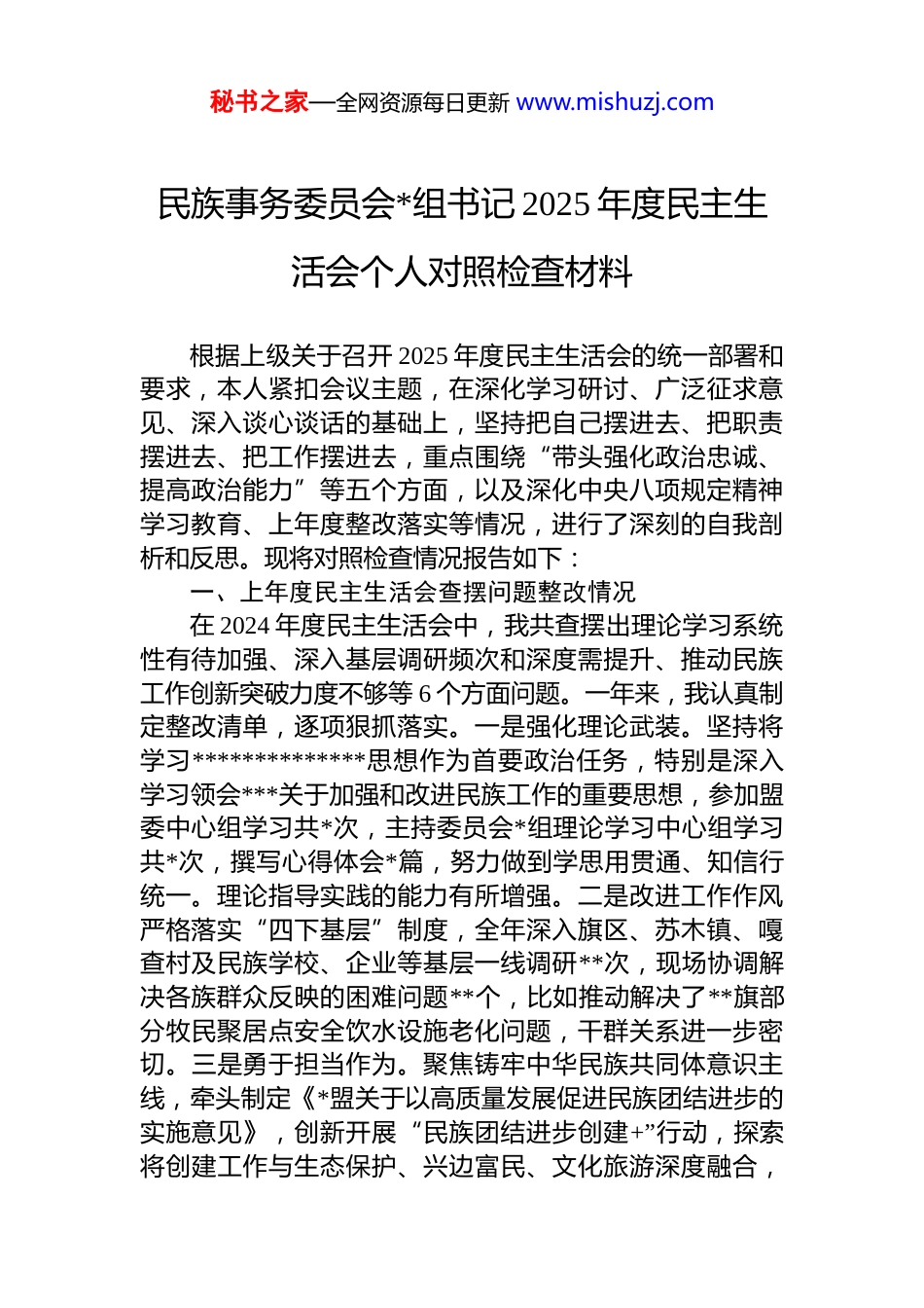 秘书之家—全网资源每日更新 www.mishuzj.com民族事务委员会*组书记 2025 年度民主生活会个人对照检查材料根据上级关于召开 2025 年度民主生活会的统一部署和要求,本人紧扣会议主题,在深化学习研讨、广泛征求意见、深入谈心谈话的基础上,坚持把自己摆进去、把职责摆进去、把工作摆进去,重点围绕“带头强化政治忠诚、提高政治能力”等五个方面,以及深化中央八项规定精神学习教育、上年度整改落实等情况,进行了深刻的自我剖析和反思。现将对照检查情况报告如下:一、上年度民主生活会查摆问题整改情况在 2024 年度民主生活会中,我共查摆出理论学习系统性有待加强、深入基层调研频次和深度需提升、推动民族工作创新突破力度不够等 6 个方面问题。一年来,我认真制定整改清单,逐项狠抓落实。一是强化理论武装。坚持将学习**************思想作为首要政治任务,特别是深入学习领会***关于加强和改进民族工作的重要思想,参加盟委中心组学习共*次,主持委员会*组理论学习中心组学习共*次,撰写心得体会*篇,努力做到学思用贯通、知信行统一。理论指导实践的能力有所增强。二是改进工作作风严格落实“四下基层”制度,全年深入旗区、苏木镇、嘎查村及民族学校、企业等基层一线调研**次,现场协调解决各族群众反映的困难问题**个,比如推动解决了**旗部分牧民聚居点安全饮水设施老化问题,干群关系进一步密切。三是勇于担当作为。聚焦铸牢中华民族共同体意识主线,牵头制定《*盟关于以高质量发展促进民族团结进步的实施意见》,创新开展“民族团结进步创建+”行动,探索将创建工作与生态保护、兴边富民、文化旅游深度融合,秘书之家—全网资源每日更新 www.mishuzj.com打造了“守望相助·驼乡同心”等工作品牌。推动年度民族领域重点项目*项全部完成。四是从严管*治*。认真履行第一责任人职责,主持召开*风廉政专题会议*次,开展廉政谈话**人次,修订完善委员会内部管理制度*项。对上年度查摆的问题,除需长期坚持的整改事项外,均已按期完成整改。同时,对需要持续推进的问题,如理论学习成果转化长效机制建设,已纳入今年工作要点持续深化。二、存在的问题对照本次民主生活会主题和五个方面重点要求,结合征求意见和谈心谈话情况,我深刻反思,主要存在以下问题:(一)带头强化政治忠诚、提高政治能力方面。一是政治判断力的敏锐度还需加强。能够坚定拥护“两个确立”、做到“两个维护”,但在面对民族领域一些复杂敏感问题时,有时更多是考虑如何“不出事”、平稳处理,从政治高度审视风险、洞察本质、预见趋势的能力还有欠缺。比如,在评估一些涉及不同民族风俗习惯的网络舆情潜在影响时,虽然能够第一时间处置,但对其背后可能存在的深层次政治风险、社会风险研判得不够透彻提前介入、系统防范的主动性有待提升。二是政治领悟力的穿透性尚有不足。对*中央关于民族工作的最新精神和战略部署,虽然能够及时组织学习传达,但在结合*边疆民族地区实际,进行深层次、创造性理解和转化上,思考得还不够深、不够活。有时满足于“传达到了”“部署了”,但在如何将“筑牢中华民族共同体意识”这一主线,更精准、更鲜活地融入全盟经济社会发展各领域,形成具有*特色的实践路径方面,谋划的创新举措还不够多。三是政治执行力的刚性有待增强。对*中央和上级*委的决策部署,能够坚决执行,但在一些需要多部门协同推进、攻坚克难的工作上,有时存在一定的畏难情绪和路径依赖。比如,在推动建立各民族交往交流交融的嵌入式社会结构和社区秘书之家—全网资源每日更新 www.mishuzj.com环境工作中,协调住建、民政、教育等部门形成政策合力方面,虽然做了努力,但推动的力度和韧劲还可以更大一些,“钉钉子”精神发扬不够充分,导致部分工作效果未能达到最佳预期。(二)带头固本培元、增强*性方面。一是理论武装的“内化”深度不够。虽然坚持参加集体学习和个人自学,但在“往深里走、往实里走、往心里走”上还存在差距。对**************思想,特别是其蕴含的立场观点方法,运用来改造主观世界、解决思想“总开关”问题的自觉性、主动性还不够强。有时存在“学习归学习、工作归工...