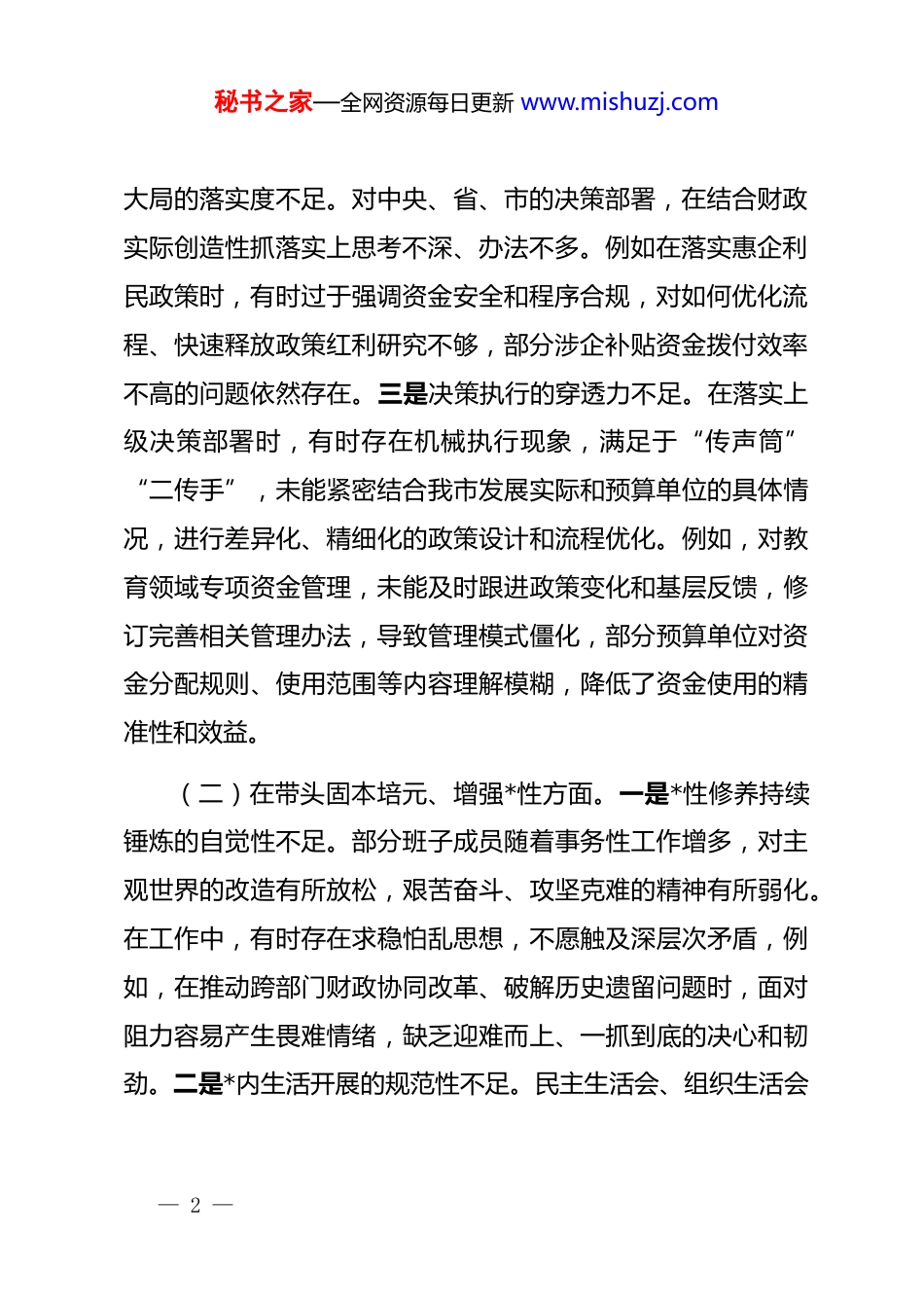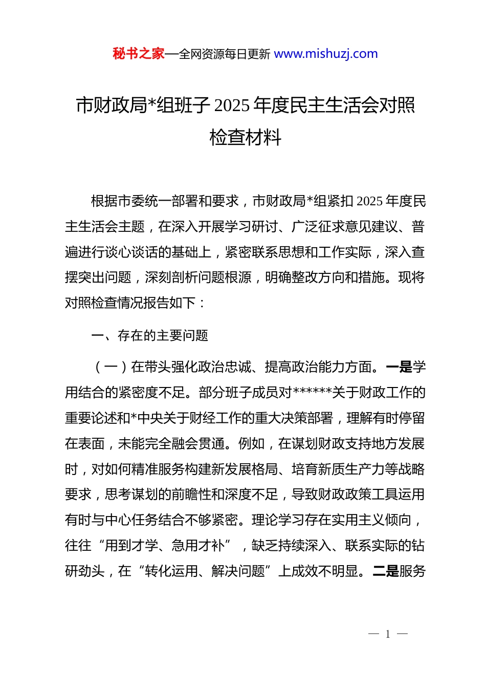 秘书之家—全网资源每日更新 www.mishuzj.com市财政局*组班子 2025 年度民主生活会对照检查材料根据市委统一部署和要求,市财政局*组紧扣 2025 年度民主生活会主题,在深入开展学习研讨、广泛征求意见建议、普遍进行谈心谈话的基础上,紧密联系思想和工作实际,深入查摆突出问题,深刻剖析问题根源,明确整改方向和措施。现将对照检查情况报告如下:一、存在的主要问题(一)在带头强化政治忠诚、提高政治能力方面。一是学用结合的紧密度不足。部分班子成员对******关于财政工作的重要论述和*中央关于财经工作的重大决策部署,理解有时停留在表面,未能完全融会贯通。例如,在谋划财政支持地方发展时,对如何精准服务构建新发展格局、培育新质生产力等战略要求,思考谋划的前瞻性和深度不足,导致财政政策工具运用有时与中心任务结合不够紧密。理论学习存在实用主义倾向,往往“用到才学、急用才补”,缺乏持续深入、联系实际的钻研劲头,在“转化运用、解决问题”上成效不明显。二是服务— 1 —秘书之家—全网资源每日更新 www.mishuzj.com大局的落实度不足。对中央、省、市的决策部署,在结合财政实际创造性抓落实上思考不深、办法不多。例如在落实惠企利民政策时,有时过于强调资金安全和程序合规,对如何优化流程、快速释放政策红利研究不够,部分涉企补贴资金拨付效率不高的问题依然存在。三是决策执行的穿透力不足。在落实上级决策部署时,有时存在机械执行现象,满足于“传声筒”“二传手”,未能紧密结合我市发展实际和预算单位的具体情况,进行差异化、精细化的政策设计和流程优化。例如,对教育领域专项资金管理,未能及时跟进政策变化和基层反馈,修订完善相关管理办法,导致管理模式僵化,部分预算单位对资金分配规则、使用范围等内容理解模糊,降低了资金使用的精准性和效益。(二)在带头固本培元、增强*性方面。一是*性修养持续锤炼的自觉性不足。部分班子成员随着事务性工作增多,对主观世界的改造有所放松,艰苦奋斗、攻坚克难的精神有所弱化。在工作中,有时存在求稳怕乱思想,不愿触及深层次矛盾,例如,在推动跨部门财政协同改革、破解历史遗留问题时,面对阻力容易产生畏难情绪,缺乏迎难而上、一抓到底的决心和韧劲。二是*内生活开展的规范性不足。民主生活会、组织生活会— 2 —秘书之家—全网资源每日更新 www.mishuzj.com的政治性、原则性、战斗性有待增强。开展批评与自我批评有时“辣味”不足,自我批评多谈工作业务,对思想根源、*性差距触及不深;相互批评“和风细雨”,怕伤和气、怕影响团结,未能真正达到红脸出汗、排毒治病的效果。落实“三会一课”等制度有时存在形式化倾向,学习内容与*员思想实际、财政中心工作结合不够紧密,组织生活的“熔炉”作用未能充分发挥。三是服务基层宗旨意识的践行性不足。在优化工作流程、减轻基层负担上考虑不周。例如,行政事业资产管理、政府采购等多股办对预算单位的监督检查存在多头部署、时间扎堆现象,导致重复检查、重复索要材料。在会议组织上统筹不够,有时未能精准界定参会范围,如仅需特定业务股室参加的视频培训也要求全体干部参加,影响了正常业务办理效率,实质上是宗旨意识不牢、作风不实的表现。(三)在带头敬畏人民、敬畏组织、敬畏法纪方面。一是为民服务的宗旨意识树得不够牢固。在履行财政职能过程中,有时未能始终将群众满意度、企业获得感放在首位,主动服务、精细服务的意识有待加强。例如,在推进“**市财政预算审批系统预算单位应用扩展建设项目”时,合同约定付款方式为年付,周期较长,未能充分考虑中小微企业资金周转的实际困难,— 3 —秘书之家—全网资源每日更新 www.mishuzj.com在优化营商环境、支持实体经济发展上用力不足。在接待群众来电来访时,有时缺乏足够耐心,对于重复咨询或政策理解有偏差的复杂问题,解释沟通不够主动、清晰。二是贯彻执行民主集中制的严格性仍有欠缺。在一些重大决策过程中,会前酝酿有时不充分,会上讨论有时不深入。个别班子成员存在“随大流”“看风向”的思想,未能本着对事业负责的态度充分发表意见、深入参与讨论。例如,在研...