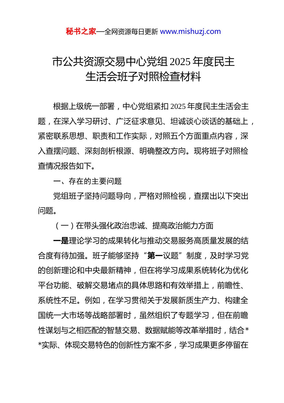 秘书之家—全网资源每日更新 www.mishuzj.com市公共资源交易中心党组 2025 年度民主生活会班子对照检查材料 根据上级统一部署,中心党组紧扣 2025 年度民主生活会主题,在深入学习研讨、广泛征求意见、坦诚谈心谈话的基础上,紧密联系思想、职责和工作实际,对照五个方面重点内容,深入查摆问题、深刻剖析根源、明确整改方向。现将班子对照检查情况报告如下。一、存在的主要问题党组班子坚持问题导向,严格对照检视,查摆出以下突出问题。(一)在带头强化政治忠诚、提高政治能力方面一是理论学习的成果转化与推动交易服务高质量发展的结合度有待加强。班子能够坚持“第一议题”制度,及时学习党的创新理论和中央最新精神,但在将学习成果系统转化为优化平台功能、破解交易堵点的具体思路和有效举措上,前瞻性、系统性不足。例如,在学习贯彻关于发展新质生产力、构建全国统一大市场等战略部署时,虽然组织了专题学习,但在前瞻性谋划与之相匹配的智慧交易、数据赋能等改革举措时,结合**实际、体现交易特色的创新性方案不多,学习成果更多停留在秘书之家—全网资源每日更新 www.mishuzj.com理解层面,向改革动能、发展势能的转化效率有待提升。二是政治能力向专业能力的穿透与引领作用发挥不够充分。班子能够自觉在思想上政治上行动上同党中央保持高度一致,但在将政治判断力、政治领悟力、政治执行力具体贯穿到复杂的评标争议处理、敏感的投诉举报核查等专业工作中时,有时存在“就事论事”的倾向。例如,在处理个别涉及地方保护或隐性壁垒质疑的项目时,从维护全国统一市场和公平竞争秩序的政治高度进行研判、定性并坚决纠偏的意识和行动力尚需加强,政治能力在化解复杂业务矛盾中的“定盘星”作用有待进一步凸显。三是在应对风险挑战中保持战略定力、增强斗争本领有提升空间。面对公共资源交易领域技术迭代加速、腐败手段隐形变异等新情况,班子能够保持工作定力,但主动识变、科学应变、积极求变的意识和能力需进一步强化。例如,在推进全流程电子化过程中,面对部分传统代理机构或评审专家的适应性阻力,以及可能随之而来的系统安全、数据安全新风险,提前进行系统性风险评估、制定完备应对预案的主动性不足,攻坚克难的锐气和韧性有待进一步磨砺。(二)在带头固本培元、增强党性方面一是党性修养的日常锤炼与业务工作的深度融合尚有差距。秘书之家—全网资源每日更新 www.mishuzj.com班子成员能够参加组织生活、完成学习任务,但有时将党性锻炼视为“软任务”,与繁忙的交易服务、平台建设等“硬指标”结合不够紧密。例如,在推进“铜心向党·阳光交易”党建品牌拓展时,虽然形式上有创新,但如何将坚定的理想信念、纯洁的党性品格具体化为对每一个交易环节的零差错要求、对每一位市场主体的极致服务追求,缺乏更深入有效的载体和机制,存在一定的“两张皮”现象。二是纪律规矩的内化于心、外化于行标准不够均衡。班子能够带头学习党章党规党纪,但在严格执行的细节和一贯性上存在薄弱环节。例如,在执行民主集中制方面,“三重一大”事项均经集体决策,但在一些非紧急的日常业务决策中,有时存在事先沟通酝酿不充分、会上讨论时间紧的情况;在落实请示报告制度上,对于业务工作中遇到的一些苗头性、倾向性问题,有时认为属于常规业务范畴,未能第一时间从政治纪律和政治规矩的高度向上级党组织进行报告。三是批评与自我批评的武器运用“辣味”不足。民主生活会前能够开展谈心谈话,会上也能进行自我批评和相互批评,但有时存在“惜情面”思想。自我批评多谈共性问题、表面问题,对分管领域存在的深层次矛盾和个人应负的领导责任挖掘不深;相互批评多以工作建议、希望寄语的形式出现,直指问秘书之家—全网资源每日更新 www.mishuzj.com题要害、触及思想灵魂的尖锐批评较少,未能完全达到“红脸出汗、排毒治病”的效果。(三)在带头敬畏人民、敬畏组织、敬畏法纪方面一是践行“四下基层”制度、走好新时代群众路线的深度有待拓展。班子能够开展调研、走访服务对象,但调研的“问题导向”和“成果转化”环节有待加强。例如,在 2025 年 9 月举办的“阳光交易...