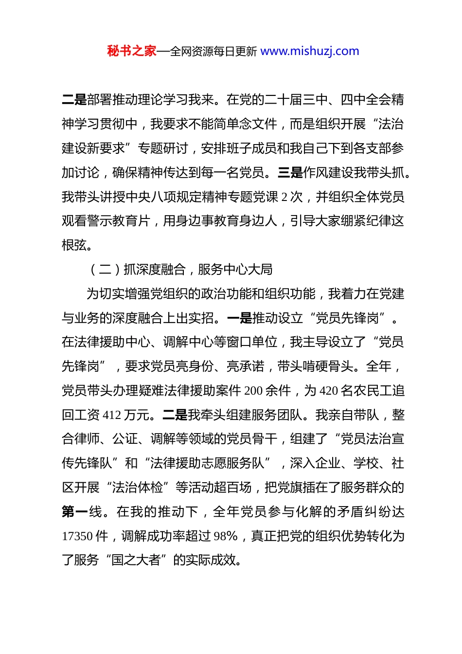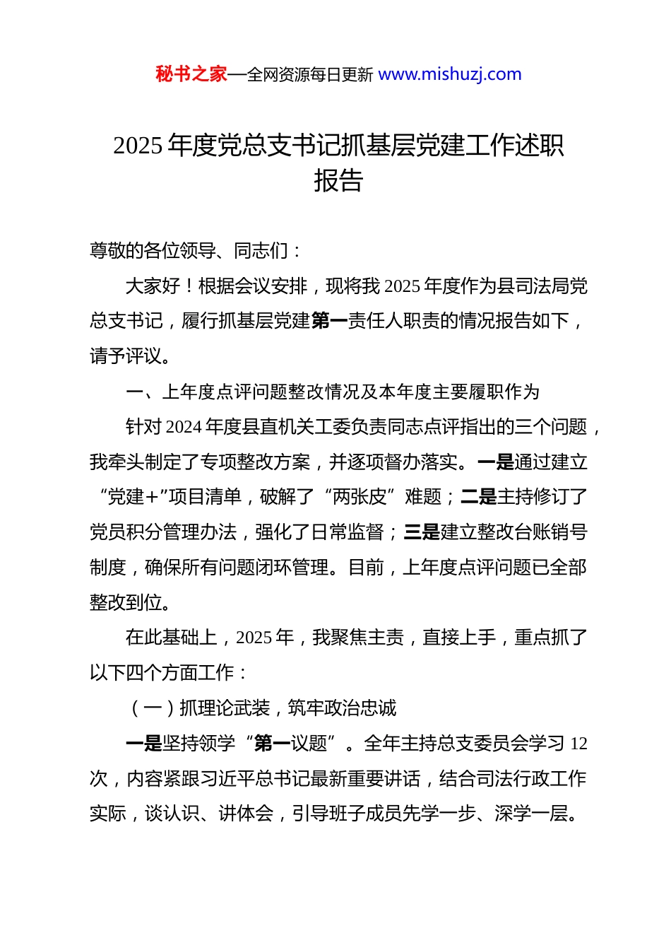 秘书之家—全网资源每日更新 www.mishuzj.com2025 年度党总支书记抓基层党建工作述职报告 尊敬的各位领导、同志们:大家好!根据会议安排,现将我 2025 年度作为县司法局党总支书记,履行抓基层党建第一责任人职责的情况报告如下,请予评议。一、上年度点评问题整改情况及本年度主要履职作为针对 2024 年度县直机关工委负责同志点评指出的三个问题,我牵头制定了专项整改方案,并逐项督办落实。一是通过建立“党建+”项目清单,破解了“两张皮”难题;二是主持修订了党员积分管理办法,强化了日常监督;三是建立整改台账销号制度,确保所有问题闭环管理。目前,上年度点评问题已全部整改到位。在此基础上,2025 年,我聚焦主责,直接上手,重点抓了以下四个方面工作:(一)抓理论武装,筑牢政治忠诚一是坚持领学“第一议题”。全年主持总支委员会学习 12次,内容紧跟习近平总书记最新重要讲话,结合司法行政工作实际,谈认识、讲体会,引导班子成员先学一步、深学一层。秘书之家—全网资源每日更新 www.mishuzj.com二是部署推动理论学习我来。在党的二十届三中、四中全会精神学习贯彻中,我要求不能简单念文件,而是组织开展“法治建设新要求”专题研讨,安排班子成员和我自己下到各支部参加讨论,确保精神传达到每一名党员。三是作风建设我带头抓。我带头讲授中央八项规定精神专题党课 2 次,并组织全体党员观看警示教育片,用身边事教育身边人,引导大家绷紧纪律这根弦。(二)抓深度融合,服务中心大局为切实增强党组织的政治功能和组织功能,我着力在党建与业务的深度融合上出实招。一是推动设立“党员先锋岗”。在法律援助中心、调解中心等窗口单位,我主导设立了“党员先锋岗”,要求党员亮身份、亮承诺,带头啃硬骨头。全年,党员带头办理疑难法律援助案件 200 余件,为 420 名农民工追回工资 412 万元。二是我牵头组建服务团队。我亲自带队,整合律师、公证、调解等领域的党员骨干,组建了“党员法治宣传先锋队”和“法律援助志愿服务队”,深入企业、学校、社区开展“法治体检”等活动超百场,把党旗插在了服务群众的第一线。在我的推动下,全年党员参与化解的矛盾纠纷达17350 件,调解成功率超过 98%,真正把党的组织优势转化为了服务“国之大者”的实际成效。秘书之家—全网资源每日更新 www.mishuzj.com(三)抓队伍建设,锻造过硬队伍队伍是干事创业的根本,我坚持把党员队伍建设抓在手上一是严把党员“入口关”。对每一名发展对象,我都亲自谈话,考察其入党动机和政治觉悟,确保发展质量。二是创新党员培训方式。改变以往“大水漫灌”的培训模式,我组织开展了青年党员法律业务技能比武、老党员“传帮带”等活动,让教育培训更接地气、更有实效。三是强化党员日常管理。我严格督促各支部落实“三会一课”、按期换届等制度,对发现的问题直接点名批评,确保党内政治生活严肃规范。同时,稳妥处置了 1 名不合格党员,树立了鲜明导向。(四)抓责任落实,涵养政治生态作为党总支书记,我始终牢记自己的“第一责任人”身份。一是我主动种好“责任田”。我主持召开了 2 次党建工作专题会和 2 次党风廉政建设专题会,与各支部书记签订责任书,把压力层层传导下去,防止“上热下冷”。二是我敢于较真碰硬。在日常工作中,我注重抓早抓小,对党员干部出现的苗头性、倾向性问题,及时提醒、批评纠正,防止小问题演变成大错误。三是我坚决扛起意识形态工作责任。我定期分析研判意识形态领域风险,加强对司法局网站、微信公众号等平台的管理,确保了司法行政系统的意识形态安全。秘书之家—全网资源每日更新 www.mishuzj.com二、查摆剖析的突出问题对照上级要求和群众期盼,反思我个人的工作,仍有不少差距,问题主要集中在三个方面,其根源都在于我作为“第一责任人”的责任压得还不够实、不够深。(一)抓党建与业务融合的“化学反应”不足,仍停留在“物理相加”。过去一年,我虽然推动了“党员先锋岗”等举措,但回头看,我的思路还比较简单,满足于“业务工作中有党员参与”,这实质上还是“两张皮”思维的惯性。我没能建立起一套有效的评价...