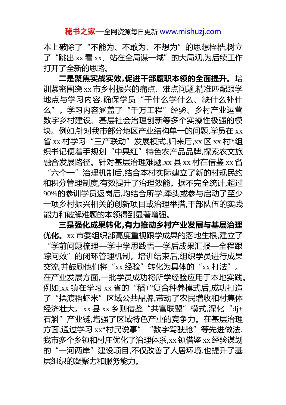 秘书之家—全网资源每日更新 www.mishuzj.comxx 市关于“沉浸式跟学”乡村振兴专题培训工作总结为深入学习借鉴 xx 省在推进“千万工程”和乡村全面振兴中的先进经验与成功做法,xx 市委组织部自 2023 年以来,创新性地组织实施了多期“沉浸式跟学”乡村振兴专题培训。此项工作旨在通过“换位旁听、实战研学”的方式,精准提升我市乡村干部队伍的思维层次与履职本领,为打造 xx版乡村振兴新样板注入强劲动能。截至目前,该培训已覆盖包括乡镇*政正职、优秀村*组织书记在内的数百名基层骨干力量,取得了显著成效。现将工作情况总结如下。一、主要做法与成效自启动以来,xx 市始终将“沉浸式跟学”作为一项系统性、创新性的重点任务来抓,坚持“带着责任学、带着问题学、带着使命学”的原则,通过精心组织与周密安排,确保跟学培训往深里走、往实里走、往心里走,有效推动了学习成果向现实生产力的转化。一是创新培训模式,实现干部思维观念的深刻转变。培训彻底改变了传统课堂式、灌输式的干部教育模式,采取“理论教学+现场观摩+蹲点跟学+交流研讨”四位一体的形式。学员们不参与具体分工、不分管实际工作,而是以“学生”和“影子”的身份,全身心沉浸在 xx 省先进地区的日常工作中,近距离、全方位观摩当地干部在抓班子带队伍、发展特色产业、建设和美乡村、壮大集体经济及优化基层治理等方面的思想理念与工作方法。这种“换位旁听对比”的模式,极大地冲击和刷新了学员的固有认知。许多学员在返岗后表示,通过一个月的跟学,思想受到了强烈震撼,深刻认识到自身在发展思路、创新意识和工作标准上的差距,从根秘书之家—全网资源每日更新 www.mishuzj.com本上破除了“不能为、不敢为、不想为”的思想桎梏,树立了“跳出 xx 看 xx、站在全局谋一域”的大局观,为后续工作打开了全新的思路。二是聚焦实战实效,促进干部履职本领的全面提升。培训紧密围绕 xx 市乡村振兴的痛点、难点问题,精准匹配跟学地点与学习内容,确保学员“干什么学什么、缺什么补什么”。学习内容涵盖了“千万工程”经验、乡村产业运营数字乡村建设、基层社会治理创新等多个实操性极强的模块。例如,针对我市部分地区产业结构单一的问题,学员在 xx省 xx 村学习“三产联动”发展模式,归来后,xx 区 xx 村*组织书记便着手规划“中果红”特色农产品品牌,探索农文旅融合发展路径。针对基层治理难题,xx 县 xx 村在借鉴 xx 省“六个一”治理机制后,结合本村实际建立了新的村规民约和积分管理制度,有效提升了治理效能。据不完全统计,超过90%的参训学员返岗后,均结合所学,牵头或参与启动了至少一项乡村振兴相关的创新项目或治理举措,干部队伍的实践能力和破解难题的本领得到显著增强。三是强化成果转化,有力推动乡村产业发展与基层治理优化。xx 市委组织部高度重视跟学成果的落地生根,建立了“学前问题梳理—学中学思践悟—学后成果汇报—全程跟踪问效”的闭环管理机制。培训结束后,组织学员进行成果交流,并鼓励他们将“xx 经验”转化为具体的“xx 打法”。在产业发展方面,一批学员成功将所学经验应用于本地实践。例如,xx 镇在学习 xx 省的“稻+”复合种养模式后,成功打造了“摆渡稻虾米”区域公共品牌,带动了农民增收和村集体经济壮大。xx 县 xx 乡则借鉴“共富联盟”模式,深化“dj+石斛”产业链,增强了区域特色产业的竞争力。在基层治理方面,通过学习 xx“村民说事”“数字驾驶舱”等先进做法,我市多个乡镇和村庄优化了治理体系,xx 镇借鉴 xx 经验谋划的“一河两岸”建设项目,不仅改善了人居环境,也提升了基层组织的凝聚力和服务能力。秘书之家—全网资源每日更新 www.mishuzj.com四是拓展合作维度,构建区域协同发展的长效机制。沉浸式跟学不仅是一次单向的学习,更是一座双向交流的桥梁。在培训过程中,我市干部与 xx 省的对口单位及干部建立了深厚的友谊和紧密的工作联系。这种非正式的沟通网络在培训结束后依然发挥着重要作用,为解决后续工作中遇到的具体问题提供了宝贵的咨询渠道。更重要的是,通过持续的人员往来与交流互动,xx 市与 xx 省多个县市在产业合作、人才交流、文旅互动等方面达成了...