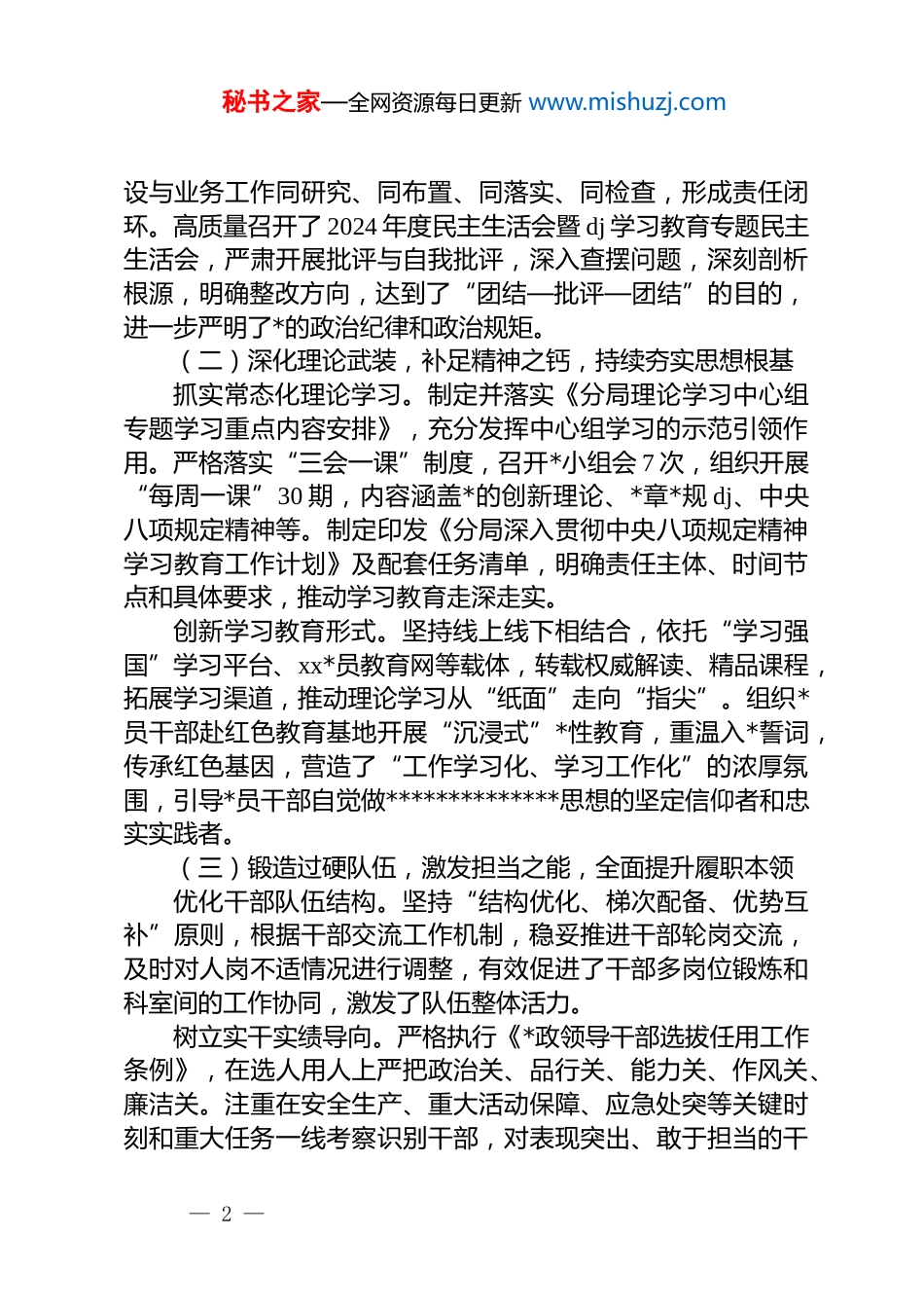 秘书之家—全网资源每日更新 www.mishuzj.comxx 市交通委员会 xx 运输管理分局 2025 年度dj 工作总结2025 年来,在市交通委*组的坚强领导下,xx 运输管理分局*支部坚持以**************思想为指导,深入学习贯彻*的二十大和二十届二中、三中、四中全会精神,全面落实新时代*的建设总要求,以政治建设为统领,以全面从严治*为主线,紧紧围绕交通运输中心工作,扎实推进*的建设各项工作,实现了dj 与业务深度融合、同频共振,为辖区交通运输事业高质量发展提供了坚强的政治保证和组织保障。现将 dj 工作情况总结如下:一、工作开展情况及主要成效分局*支部聚焦主责主业,狠抓工作落实,*的各项建设取得新进展、新成效。(一)突出政治引领,把稳思想之舵,坚决筑牢政治忠诚强化政治机关意识。始终坚持把*的政治建设摆在首位,教育引导全体*员干部深刻领悟“两个确立”的决定性意义,增强“四个意识”、坚定“四个自信”、做到“两个维护”。严格执行“第一议题”制度,将学习贯彻******最新重要讲话和指示批示精神作为支部委员会、*员大会、*小组会的首要内容,确保*中央各项决策部署在分局不折不扣落地生根。召开全体*员干部大会 3 次,及时传达学习上级重要会议和文件精神,不断提高*员干部的政治判断力、政治领悟力、政治执行力。压实管*治*责任。牢固树立“抓好 dj 是最大政绩”的理念,支部领导班子切实履行全面从严治*主体责任,主要负责人认真履行第一责任人职责,班子成员严格落实“一岗双责”。分级制定并落实《全面从严治*主体责任任务安排》,将*风廉政建— 1 —秘书之家—全网资源每日更新 www.mishuzj.com设与业务工作同研究、同布置、同落实、同检查,形成责任闭环。高质量召开了 2024 年度民主生活会暨 dj 学习教育专题民主生活会,严肃开展批评与自我批评,深入查摆问题,深刻剖析根源,明确整改方向,达到了“团结—批评—团结”的目的,进一步严明了*的政治纪律和政治规矩。(二)深化理论武装,补足精神之钙,持续夯实思想根基抓实常态化理论学习。制定并落实《分局理论学习中心组专题学习重点内容安排》,充分发挥中心组学习的示范引领作用。严格落实“三会一课”制度,召开*小组会 7 次,组织开展“每周一课”30 期,内容涵盖*的创新理论、*章*规 dj、中央八项规定精神等。制定印发《分局深入贯彻中央八项规定精神学习教育工作计划》及配套任务清单,明确责任主体、时间节点和具体要求,推动学习教育走深走实。创新学习教育形式。坚持线上线下相结合,依托“学习强国”学习平台、xx*员教育网等载体,转载权威解读、精品课程,拓展学习渠道,推动理论学习从“纸面”走向“指尖”。组织*员干部赴红色教育基地开展“沉浸式”*性教育,重温入*誓词,传承红色基因,营造了“工作学习化、学习工作化”的浓厚氛围,引导*员干部自觉做**************思想的坚定信仰者和忠实实践者。(三)锻造过硬队伍,激发担当之能,全面提升履职本领优化干部队伍结构。坚持“结构优化、梯次配备、优势互补”原则,根据干部交流工作机制,稳妥推进干部轮岗交流,及时对人岗不适情况进行调整,有效促进了干部多岗位锻炼和科室间的工作协同,激发了队伍整体活力。树立实干实绩导向。严格执行《*政领导干部选拔任用工作条例》,在选人用人上严把政治关、品行关、能力关、作风关、廉洁关。注重在安全生产、重大活动保障、应急处突等关键时刻和重大任务一线考察识别干部,对表现突出、敢于担当的干— 2 —秘书之家—全网资源每日更新 www.mishuzj.com部及时予以发现和合理使用,让“实干者”有平台、有舞台,树立了鲜明的重实干、重实绩的用人导向。提升综合能力素养。积极组织干部参加干教网在线学习及各类专题培训。选派优秀年轻干部参加委系统优秀年轻干部培训班,充分利用上级学习培育平台,着力提升干部把握大局、组织管理、统筹协调和沟通交流的能力,努力锻造与新时代交通运输事业发展要求相匹配的“硬核”本领。(四)推动融合发展,彰显 dj 之效,用心用情服务民生分局*支部坚持围绕中心抓 dj、抓好 dj 促业务,推动 dj 工作与运输管理、安...
