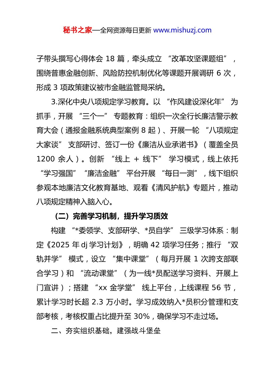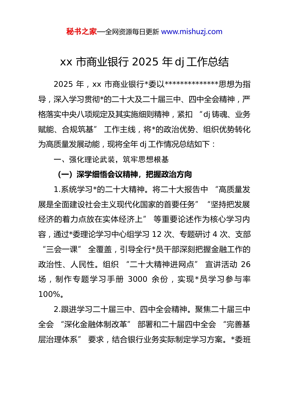 秘书之家—全网资源每日更新 www.mishuzj.comxx 市商业银行 2025 年 dj 工作总结2025 年,xx 市商业银行*委以**************思想为指导,深入学习贯彻*的二十大及二十届三中、四中全会精神,严格落实中央八项规定及其实施细则精神,紧扣 “dj 铸魂、业务赋能、合规筑基” 工作主线,将*的政治优势、组织优势转化为高质量发展动能,现将全年 dj 工作情况总结如下:一、强化理论武装,筑牢思想根基(一)深学细悟会议精神,把握政治方向1.系统学习*的二十大精神。将二十大报告中 “高质量发展是全面建设社会主义现代化国家的首要任务”“坚持把发展经济的着力点放在实体经济上” 等重要论述作为核心学习内容,通过*委理论学习中心组学习 12 次、专题研讨 4 次、支部“三会一课” 全覆盖,引导全行*员干部深刻把握金融工作的政治性、人民性。组织 “二十大精神进网点” 宣讲活动 26场,制作专题学习手册 3000 余份,实现*员学习参与率100%。2.跟进学习二十届三中、四中全会精神。聚焦二十届三中全会 “深化金融体制改革” 部署和二十届四中全会 “完善基层治理体系” 要求,结合银行业务实际制定学习方案。*委班秘书之家—全网资源每日更新 www.mishuzj.com子带头撰写心得体会 18 篇,牵头成立 “改革攻坚课题组”,围绕普惠金融创新、风险防控机制优化等课题开展调研 6 次,形成 3 项政策建议被市金融监管局采纳。3.深化中央八项规定学习教育。以 “作风建设深化年” 为抓手,开展 “三个一” 专题教育:组织一次全行长廉洁警示教育大会(通报金融系统典型案例 8 起)、开展一轮 “八项规定大家谈” 支部研讨、签订一份《廉洁从业承诺书》(覆盖全员1200 余人)。创新 “线上 + 线下” 学习模式,线上依托“学习强国”“廉洁金融” 平台开展 “每日一测”,线下组织参观本地廉洁文化教育基地、观看《清风护航》专题片,推动八项规定精神入脑入心。(二)完善学习机制,提升学习质效构建 “*委领学、支部研学、*员自学” 三级学习体系:制定《2025 年 dj 学习计划》,明确 42 项学习任务;推行 “双轨并学” 模式,设立 “集中课堂”(每月开展 1 次跨支部联合学习)和 “流动课堂”(为一线*员配送学习资料、开展上门宣讲);搭建 “xx 金学堂” 线上平台,上线课程 56 节,累计学习时长超 2.3 万小时。学习成效纳入*员积分管理和支部考核,考核权重占比提升至 30%,确保学习不走过场。二、夯实组织基础,建强战斗堡垒秘书之家—全网资源每日更新 www.mishuzj.com(一)健全组织体系,规范支部建设1.优化组织设置。紧跟业务发展步伐,实现 “支部建在业务链上、*旗插在一线阵地”:新增 “科创金融*支部”“乡村振兴*支部” 2 个特色支部,调整优化 18 个基层*支部设置,确保全行 32 个支部全覆盖、无盲区。严格落实 “四强” *支部创建标准,实施 “月提示、季督查、半年推进、年终考评”机制,全年评选先进支部 6 个、优秀*务工作者 15 名。2.深化品牌创建。打造 “一支部一品牌” dj 矩阵:营业部*支部 “红色窗口・服务为民”、普惠金融*支部 “dj + 普惠・助企纾困”、县域支行*支部 “金穗惠民・情系三农” 等特色品牌成效显著。其中,乡村振兴*支部创新 “农商凤水・惠农 xx” 品牌,入选全市金融系统 dj 创新案例。(二)强化*员管理,激发先锋活力1.严格*员发展与教育。按照 “控制总量、优化结构、提高 质 量 ” 要 求 , 发 展 新 * 员 28 名 ( 其 中 业 务 骨 干 占 比75%),开展新*员集中培训 3 期。设立 43 个 “*员先锋示范岗”、126 个 “*员责任区”,明确*员在客户服务、攻坚破难中的带头责任,全年*员带头完成急难任务 47 项。2.发挥*员攻坚作用。组建 “*员先锋队” 12 支(含普惠青年先锋队、科创服务专班等),聚焦业务痛点开展专项攻秘书之家—全网资源每日更新 www.mishuzj.com坚。例如,科创服务专班由 18 名*员骨干组成,全年为 227家科技企业提供信贷支持,投放 “科创 e 贷” 16.46 亿元,增速...