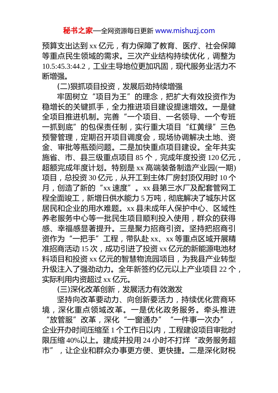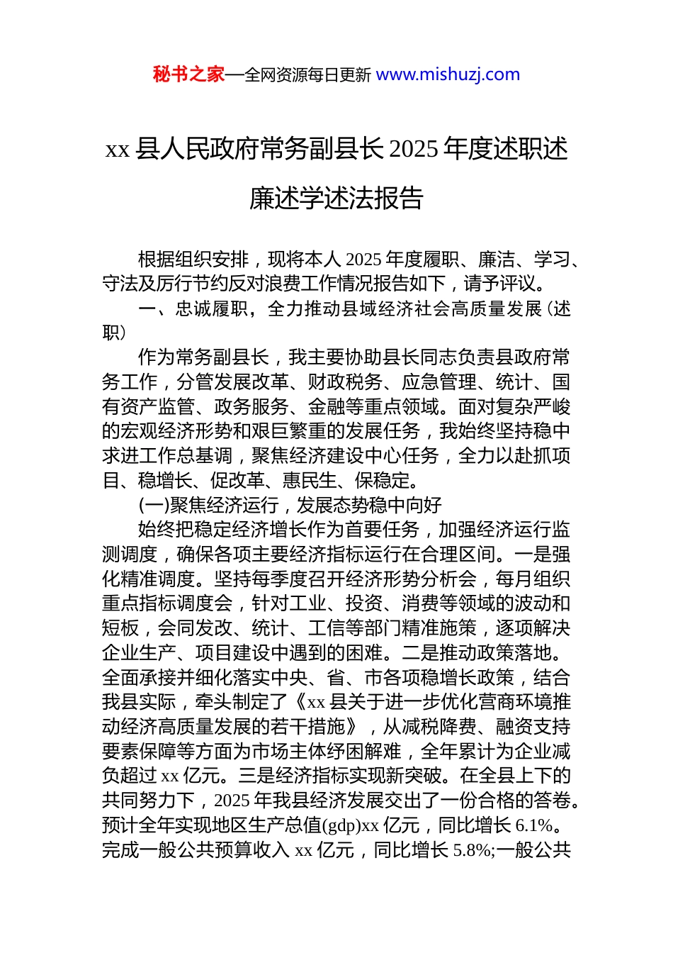 秘书之家—全网资源每日更新 www.mishuzj.comxx 县人民政府常务副县长 2025 年度述职述廉述学述法报告根据组织安排,现将本人 2025 年度履职、廉洁、学习、守法及厉行节约反对浪费工作情况报告如下,请予评议。一、忠诚履职,全力推动县域经济社会高质量发展(述职)作为常务副县长,我主要协助县长同志负责县政府常务工作,分管发展改革、财政税务、应急管理、统计、国有资产监管、政务服务、金融等重点领域。面对复杂严峻的宏观经济形势和艰巨繁重的发展任务,我始终坚持稳中求进工作总基调,聚焦经济建设中心任务,全力以赴抓项目、稳增长、促改革、惠民生、保稳定。(一)聚焦经济运行,发展态势稳中向好始终把稳定经济增长作为首要任务,加强经济运行监测调度,确保各项主要经济指标运行在合理区间。一是强化精准调度。坚持每季度召开经济形势分析会,每月组织重点指标调度会,针对工业、投资、消费等领域的波动和短板,会同发改、统计、工信等部门精准施策,逐项解决企业生产、项目建设中遇到的困难。二是推动政策落地。全面承接并细化落实中央、省、市各项稳增长政策,结合我县实际,牵头制定了《xx 县关于进一步优化营商环境推动经济高质量发展的若干措施》,从减税降费、融资支持要素保障等方面为市场主体纾困解难,全年累计为企业减负超过 xx 亿元。三是经济指标实现新突破。在全县上下的共同努力下,2025 年我县经济发展交出了一份合格的答卷。预计全年实现地区生产总值(gdp)xx 亿元,同比增长 6.1%。完成一般公共预算收入 xx 亿元,同比增长 5.8%;一般公共秘书之家—全网资源每日更新 www.mishuzj.com预算支出达到 xx 亿元,有力保障了教育、医疗、社会保障等重点民生领域的需求。三次产业结构持续优化,调整为10.5:45.3:44.2,工业主导地位更加巩固,现代服务业活力不断增强。(二)狠抓项目投资,发展后劲持续增强牢固树立“项目为王”的理念,把扩大有效投资作为稳增长的关键抓手,全力推进项目建设提速增效。一是健全项目推进机制。完善“一个项目、一名领导、一个专班一抓到底”的包保责任制,实行重大项目“红黄绿”三色预警管理,定期召开项目调度会,现场协调解决土地、资金、审批等瓶颈问题。二是加快重点项目建设。全年共实施省、市、县三级重点项目 85 个,完成年度投资 120 亿元,超额完成年度计划。特别是 xx 高端装备制造产业园(一期)项目,总投资 30 亿元,从开工到主体厂房封顶仅用时 10 个月,创造了新的“xx 速度”。xx 县第三水厂及配套管网工程全面竣工,新增日供水能力 5 万吨,彻底解决了城东片区居民和企业的用水难题。xx 县未成年人保护中心、区域性养老服务中心等一批民生项目顺利投入使用,群众的获得感、幸福感显著提升。三是聚力招商引资。坚持把招商引资作为“一把手”工程,带队赴 xx、xx 等重点区域开展精准招商活动 15 次,成功引进了投资 xx 亿元的新能源电池材料项目和投资 xx 亿元的智慧物流园项目,为我县产业转型升级注入了强劲动力。全年新签约亿元以上产业项目 22 个,实际利用内资超过 xx 亿元。(三)深化改革创新,发展活力有效激发坚持向改革要动力、向创新要活力,持续优化营商环境,深化重点领域改革。一是优化政务服务。牵头推进“放管服”改革,深化“一窗通办”“一件事一次办”,企业开办时间压缩至 1 个工作日以内,工程建设项目审批时限压缩 40%以上。建成并投用 24 小时不打烊“政务服务超市”,让企业和群众办事更方便、更快捷。二是深化财税秘书之家—全网资源每日更新 www.mishuzj.com金融改革。全面实施预算绩效管理,提高财政资金使用效益。积极搭建银企对接平台,引导金融机构加大对实体经济特别是中小微企业的信贷支持,全年新增贷款余额超过40 亿元,有效缓解了企业融资难、融资贵问题。三是防范化解重大风险。始终把安全生产放在首位,严格落实安全生产责任制,深入开展重点行业领域安全隐患排查整治,全年生产安全事故起数和死亡人数实现“双下降”。同时稳妥有序化解政府债务风险,守住了不发生系统性风险的底线,为经济社会发展营造了安全稳定的环境。...