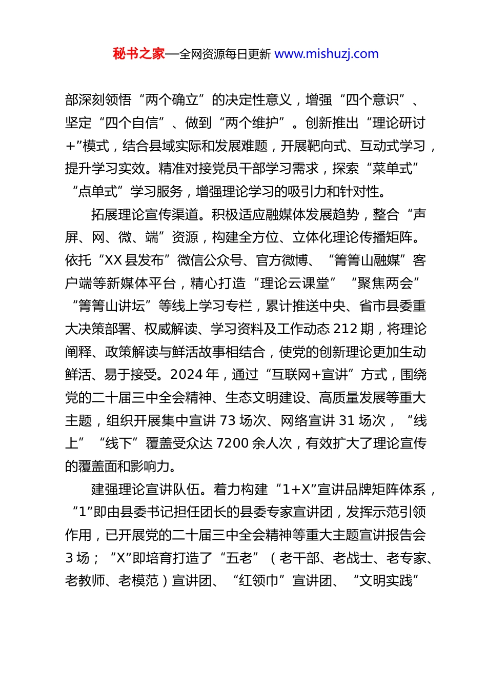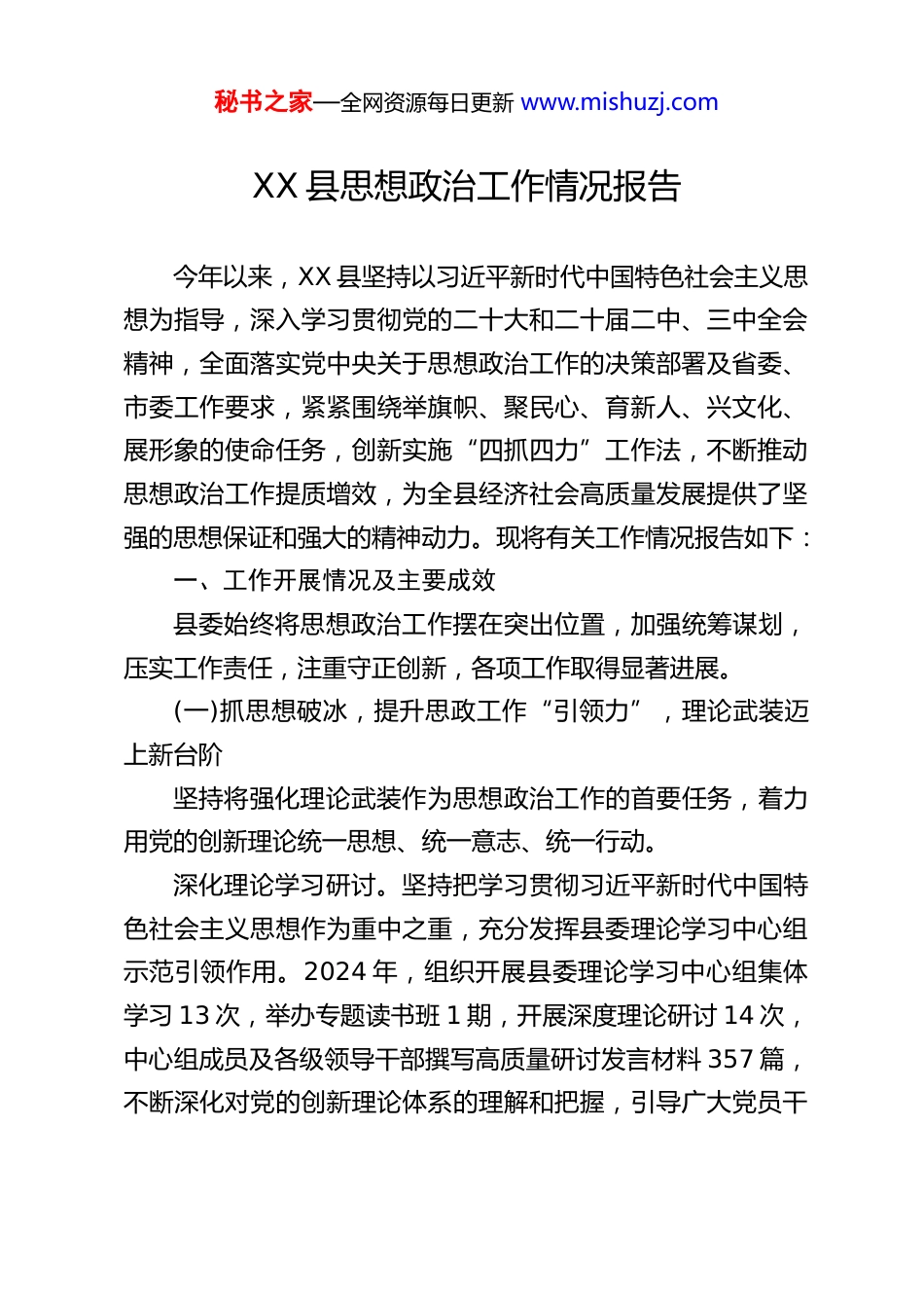 秘书之家—全网资源每日更新 www.mishuzj.comXX 县思想政治工作情况报告今年以来,XX 县坚持以习近平新时代中国特色社会主义思想为指导,深入学习贯彻党的二十大和二十届二中、三中全会精神,全面落实党中央关于思想政治工作的决策部署及省委、市委工作要求,紧紧围绕举旗帜、聚民心、育新人、兴文化、展形象的使命任务,创新实施“四抓四力”工作法,不断推动思想政治工作提质增效,为全县经济社会高质量发展提供了坚强的思想保证和强大的精神动力。现将有关工作情况报告如下:一、工作开展情况及主要成效县委始终将思想政治工作摆在突出位置,加强统筹谋划,压实工作责任,注重守正创新,各项工作取得显著进展。(一)抓思想破冰,提升思政工作“引领力”,理论武装迈上新台阶坚持将强化理论武装作为思想政治工作的首要任务,着力用党的创新理论统一思想、统一意志、统一行动。深化理论学习研讨。坚持把学习贯彻习近平新时代中国特色社会主义思想作为重中之重,充分发挥县委理论学习中心组示范引领作用。2024 年,组织开展县委理论学习中心组集体学习 13 次,举办专题读书班 1 期,开展深度理论研讨 14 次,中心组成员及各级领导干部撰写高质量研讨发言材料 357 篇,不断深化对党的创新理论体系的理解和把握,引导广大党员干秘书之家—全网资源每日更新 www.mishuzj.com部深刻领悟“两个确立”的决定性意义,增强“四个意识”、坚定“四个自信”、做到“两个维护”。创新推出“理论研讨+”模式,结合县域实际和发展难题,开展靶向式、互动式学习,提升学习实效。精准对接党员干部学习需求,探索“菜单式”“点单式”学习服务,增强理论学习的吸引力和针对性。拓展理论宣传渠道。积极适应融媒体发展趋势,整合“声屏、网、微、端”资源,构建全方位、立体化理论传播矩阵。依托“XX 县发布”微信公众号、官方微博、“箐箐山融媒”客户端等新媒体平台,精心打造“理论云课堂”“聚焦两会”“箐箐山讲坛”等线上学习专栏,累计推送中央、省市县委重大决策部署、权威解读、学习资料及工作动态 212 期,将理论阐释、政策解读与鲜活故事相结合,使党的创新理论更加生动鲜活、易于接受。2024 年,通过“互联网+宣讲”方式,围绕党的二十届三中全会精神、生态文明建设、高质量发展等重大主题,组织开展集中宣讲 73 场次、网络宣讲 31 场次,“线上”“线下”覆盖受众达 7200 余人次,有效扩大了理论宣传的覆盖面和影响力。建强理论宣讲队伍。着力构建“1+X”宣讲品牌矩阵体系,“1”即由县委书记担任团长的县委专家宣讲团,发挥示范引领作用,已开展党的二十届三中全会精神等重大主题宣讲报告会3 场;“X”即培育打造了“五老”(老干部、老战士、老专家、老教师、老模范)宣讲团、“红领巾”宣讲团、“文明实践”秘书之家—全网资源每日更新 www.mishuzj.com宣讲团等多支贴近实际、贴近生活、贴近群众的特色宣讲小分队。这些队伍自觉“沉下去”,深入机关、企业、校园、社区、农村、基层一线,用群众喜闻乐见的语言和形式,广泛开展分众化、互动化宣讲 46 场次,直接受众千余人次,切实将“理论话语”转换为“群众语言”,将“理论宣讲”变为推动发展的“思想旋桨”,推动了党的创新理论“飞入寻常百姓家”。(二)抓阵地联建,重塑思政工作“吸引力”,育人载体实现新拓展坚持盘活存量、优化增量、共建共享,不断加强和改进思想政治工作阵地建设与管理,使其成为凝聚群众、引导群众、服务群众的重要平台。优化公共文化服务阵地。坚持“优化配置、合理调度、共享使用”原则,加大对图书馆、博物馆、文化馆、乡镇(街道)综合文化站、村(社区)综合性文化服务中心、农家书屋等公共文化设施的投入与管理力度,推动各类设施免费开放、高效利用。2024 年,全县各类公共文化场所接待群众超过 2万人次。在提供基本公共文化服务的同时,有机融入思想政治教育内容,开展形式多样的阅读推广、文化讲座、展览展示活动,使这些场所成为传播主流价值、丰富群众精神文化生活的重要空间。夯实农村思想文化阵地。以农村精神文明建设“十个一”主题创建活动为抓手,深入推进乡...