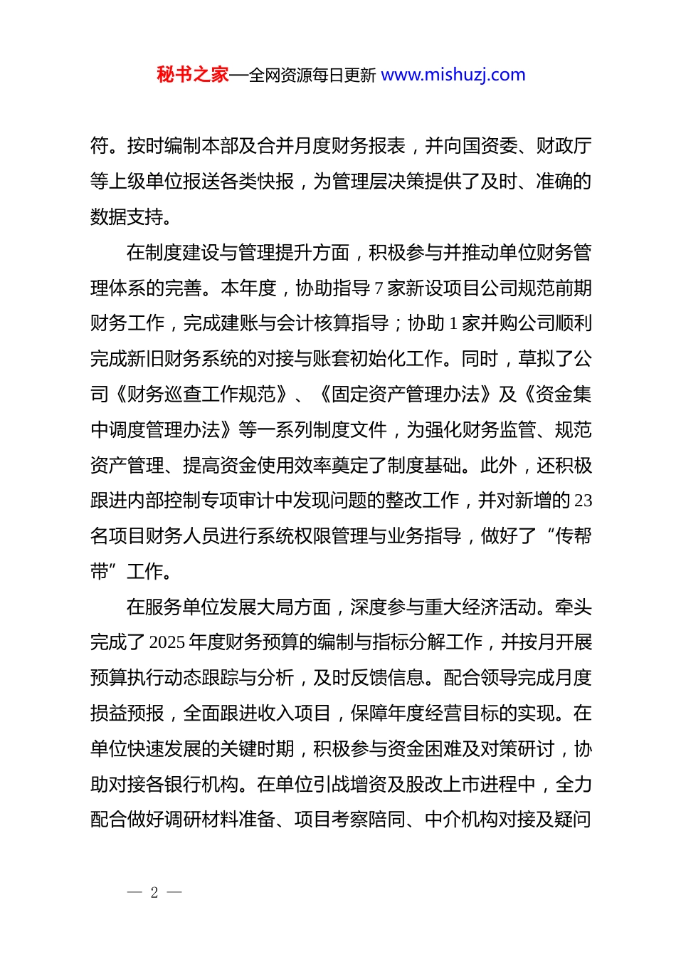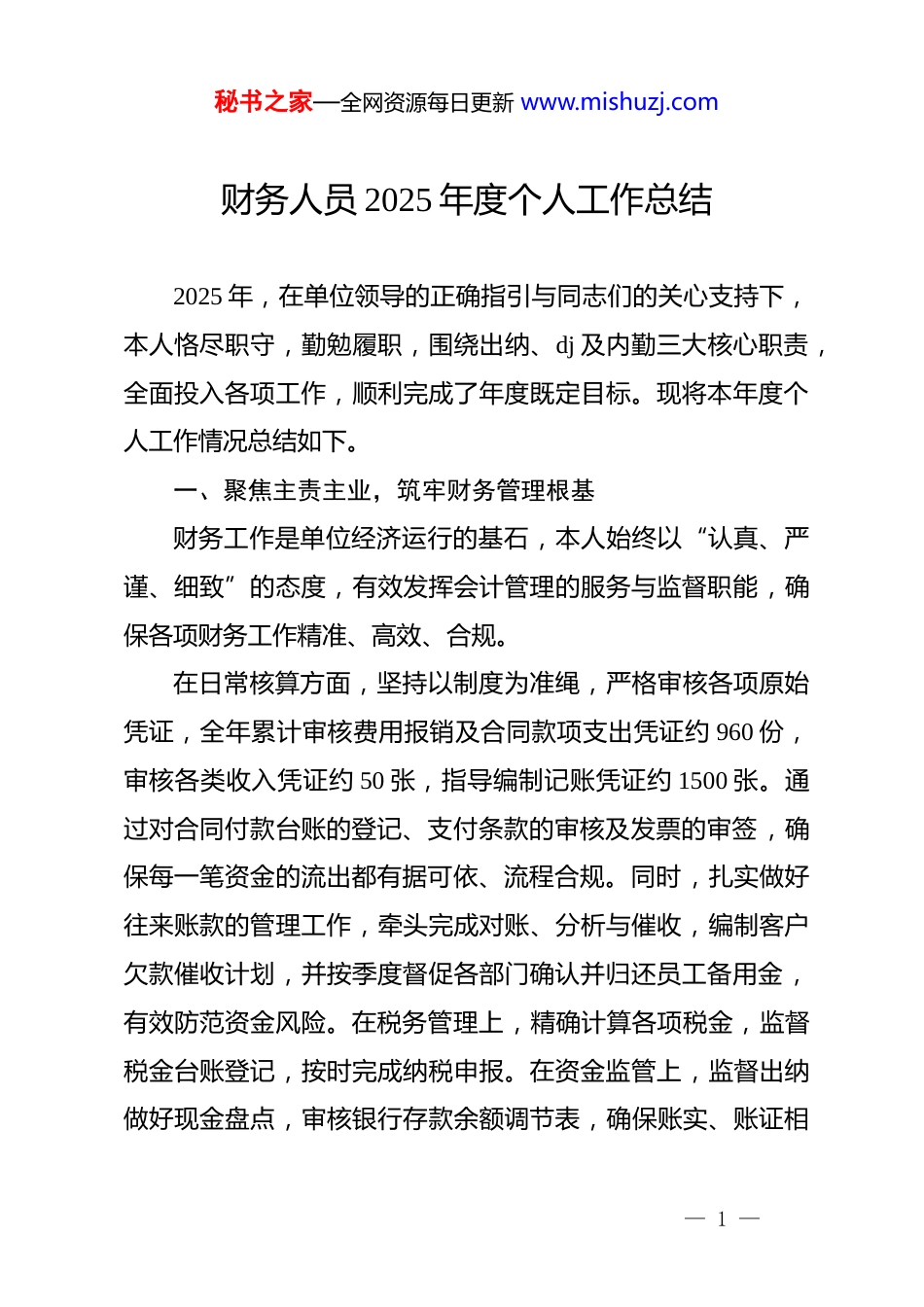 秘书之家—全网资源每日更新 www.mishuzj.com财务人员 2025 年度个人工作总结2025 年,在单位领导的正确指引与同志们的关心支持下,本人恪尽职守,勤勉履职,围绕出纳、dj 及内勤三大核心职责,全面投入各项工作,顺利完成了年度既定目标。现将本年度个人工作情况总结如下。一、聚焦主责主业,筑牢财务管理根基财务工作是单位经济运行的基石,本人始终以“认真、严谨、细致”的态度,有效发挥会计管理的服务与监督职能,确保各项财务工作精准、高效、合规。在日常核算方面,坚持以制度为准绳,严格审核各项原始凭证,全年累计审核费用报销及合同款项支出凭证约 960 份,审核各类收入凭证约 50 张,指导编制记账凭证约 1500 张。通过对合同付款台账的登记、支付条款的审核及发票的审签,确保每一笔资金的流出都有据可依、流程合规。同时,扎实做好往来账款的管理工作,牵头完成对账、分析与催收,编制客户欠款催收计划,并按季度督促各部门确认并归还员工备用金,有效防范资金风险。在税务管理上,精确计算各项税金,监督税金台账登记,按时完成纳税申报。在资金监管上,监督出纳做好现金盘点,审核银行存款余额调节表,确保账实、账证相— 1 —秘书之家—全网资源每日更新 www.mishuzj.com符。按时编制本部及合并月度财务报表,并向国资委、财政厅等上级单位报送各类快报,为管理层决策提供了及时、准确的数据支持。在制度建设与管理提升方面,积极参与并推动单位财务管理体系的完善。本年度,协助指导 7 家新设项目公司规范前期财务工作,完成建账与会计核算指导;协助 1 家并购公司顺利完成新旧财务系统的对接与账套初始化工作。同时,草拟了公司《财务巡查工作规范》、《固定资产管理办法》及《资金集中调度管理办法》等一系列制度文件,为强化财务监管、规范资产管理、提高资金使用效率奠定了制度基础。此外,还积极跟进内部控制专项审计中发现问题的整改工作,并对新增的 23名项目财务人员进行系统权限管理与业务指导,做好了“传帮带”工作。在服务单位发展大局方面,深度参与重大经济活动。牵头完成了 2025 年度财务预算的编制与指标分解工作,并按月开展预算执行动态跟踪与分析,及时反馈信息。配合领导完成月度损益预报,全面跟进收入项目,保障年度经营目标的实现。在单位快速发展的关键时期,积极参与资金困难及对策研讨,协助对接各银行机构。在单位引战增资及股改上市进程中,全力配合做好调研材料准备、项目考察陪同、中介机构对接及疑问— 2 —秘书之家—全网资源每日更新 www.mishuzj.com解答等工作,并根据行业特性编报了公司资产证券化三年行动方案,为单位资本运营规划贡献了力量。二、坚定政治信念,夯实基层 dj 工作堡垒*务工作是凝心聚力、引领方向的政治任务。本人作为*务工作者,始终将*的政治建设摆在首位,以高度的政治责任感推动基层 dj 工作走深走实。在强化理论武装方面,严格落实“第一议题”制度,确保*中央的最新精神第一时间传达学习。特别是在*的二十届四中全会后,迅速组织*员通过理论学习中心组、“三会一课”等形式开展多层次、全覆盖的学习研讨,引导全体*员深刻领悟全会精神实质,自觉统一思想和行动。为推动学习与工作深度融合,探索开展“透过业务看政治讲忠诚”案例分享活动,引导*员在实践中感悟*的领导,将政治忠诚内化于心、外化于行。在严抓作风建设方面,以深入贯彻中央八项规定精神学习教育为契机,协助制定单位学习教育实施方案,组织*员深入学习纪律规定,通过观看警示教育片、通报典型案例、参加“青年纪法讲堂”等方式,筑牢拒腐防变的思想防线。同时,注重抓常抓长,定期开展廉政谈心谈话,在重要节假日发布廉洁提醒,坚决防止“四风”问题反弹,持续巩固风清气正的政治生态。— 3 —秘书之家—全网资源每日更新 www.mishuzj.com在夯实组织基础方面,着力加强基层*组织标准化、规范化建设,严格执行各项*内政治生活制度,提升组织生活质量。在*员发展上,坚持政治标准,严守发展程序,本年度成功指导和发展了 3 名业务骨干加入*组织,为*员队伍注入了新鲜血液。同时,积极组织*员深入共建...