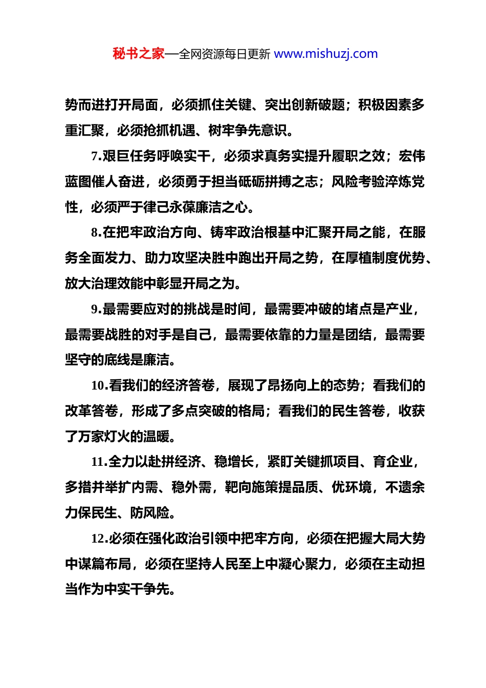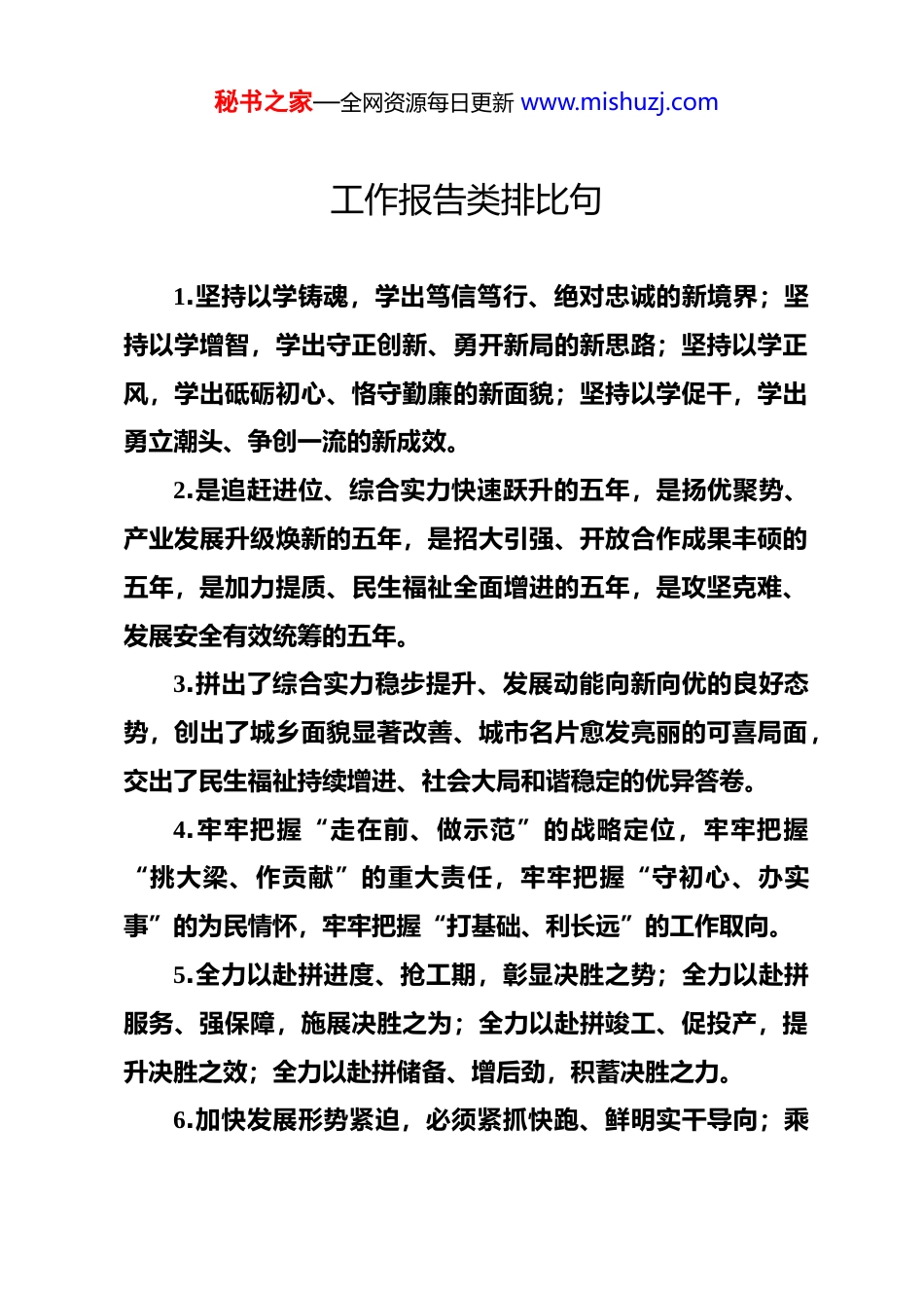 秘书之家—全网资源每日更新 www.mishuzj.com工作报告类排比句 1.坚持以学铸魂,学出笃信笃行、绝对忠诚的新境界;坚持以学增智,学出守正创新、勇开新局的新思路;坚持以学正风,学出砥砺初心、恪守勤廉的新面貌;坚持以学促干,学出勇立潮头、争创一流的新成效。2.是追赶进位、综合实力快速跃升的五年,是扬优聚势、产业发展升级焕新的五年,是招大引强、开放合作成果丰硕的五年,是加力提质、民生福祉全面增进的五年,是攻坚克难、发展安全有效统筹的五年。3.拼出了综合实力稳步提升、发展动能向新向优的良好态势,创出了城乡面貌显著改善、城市名片愈发亮丽的可喜局面,交出了民生福祉持续增进、社会大局和谐稳定的优异答卷。4.牢牢把握“走在前、做示范”的战略定位,牢牢把握“挑大梁、作贡献”的重大责任,牢牢把握“守初心、办实事”的为民情怀,牢牢把握“打基础、利长远”的工作取向。5.全力以赴拼进度、抢工期,彰显决胜之势;全力以赴拼服务、强保障,施展决胜之为;全力以赴拼竣工、促投产,提升决胜之效;全力以赴拼储备、增后劲,积蓄决胜之力。6.加快发展形势紧迫,必须紧抓快跑、鲜明实干导向;乘秘书之家—全网资源每日更新 www.mishuzj.com势而进打开局面,必须抓住关键、突出创新破题;积极因素多重汇聚,必须抢抓机遇、树牢争先意识。7.艰巨任务呼唤实干,必须求真务实提升履职之效;宏伟蓝图催人奋进,必须勇于担当砥砺拼搏之志;风险考验淬炼党性,必须严于律己永葆廉洁之心。8.在把牢政治方向、铸牢政治根基中汇聚开局之能,在服务全面发力、助力攻坚决胜中跑出开局之势,在厚植制度优势、放大治理效能中彰显开局之为。9.最需要应对的挑战是时间,最需要冲破的堵点是产业,最需要战胜的对手是自己,最需要依靠的力量是团结,最需要坚守的底线是廉洁。10.看我们的经济答卷,展现了昂扬向上的态势;看我们的改革答卷,形成了多点突破的格局;看我们的民生答卷,收获了万家灯火的温暖。11.全力以赴拼经济、稳增长,紧盯关键抓项目、育企业,多措并举扩内需、稳外需,靶向施策提品质、优环境,不遗余力保民生、防风险。12.必须在强化政治引领中把牢方向,必须在把握大局大势中谋篇布局,必须在坚持人民至上中凝心聚力,必须在主动担当作为中实干争先。秘书之家—全网资源每日更新 www.mishuzj.com13.当有绝对忠诚的高度自觉,当有争雄竞先的坚定信心,当有敢为善为的昂扬斗志,当有为民造福的真挚情怀,当有脚踏实地的过硬作风。14.具备胸怀全局的视野格局,确立争创一流的工作追求,强化勇挑大梁的责任担当,健全狠抓落实的责任体系,营造事争一流的浓厚氛围。15.要深刻把握目标所在,永葆“闯”的精神;要深刻把握方向所在,永葆“创”的劲头破;要深刻把握路径所在,永葆“干”的作风。16.坚持党的领导,做到紧跟紧随;坚持站位全局,做到同向同行;坚持人民至上,做到为民惠民;坚持全面从严,做到务实求实。17.开出了高举旗帜、维护核心的政治自觉,开出了击鼓催征、团结奋进的磅礴力量,开出了风清气正、务实高效的良好会风。18.注入了克难求进的强大力量,增添了破危抢机的坚定信心,指明了奋勇突破的前行路径,提振了干事创业的精神状态。19.激发知难而进、迎难而上的顽强意志,增强敢于创新、勇于担当的实干锐气,凝聚同心协力、团结奋斗的磅礴力量。20.乘势而进、接续奋斗的信心越来越强,干事创业、推动秘书之家—全网资源每日更新 www.mishuzj.com发展的路径越来越明,迎难而上、勇毅前行的底气越来越足。21.是牢记嘱托、感恩奋进的政治必答题,是放大优势、争先进位的发展必答题,是回应期盼、增进福祉的民生必答题。22.是一次高举旗帜、凝心聚力的大会,是一次求真务实、催人奋进的大会,更是一次共谋发展、再谱新篇的大会。23.是一次高举旗帜、凝心聚力的大会,是一次谋局定向、继往开来的大会,更是一次鼓舞士气、催人实干的大会。24.是夯实基础、全面发力的关键时期,是扬长补短、全面崛起的关键阶段,是转型突破、跨越奋进的紧要时期。25.“向最难之处攻坚”的韧性闯劲,“思路一变天地宽”的革新方法,“在方寸之间巧做文章”的发展智...