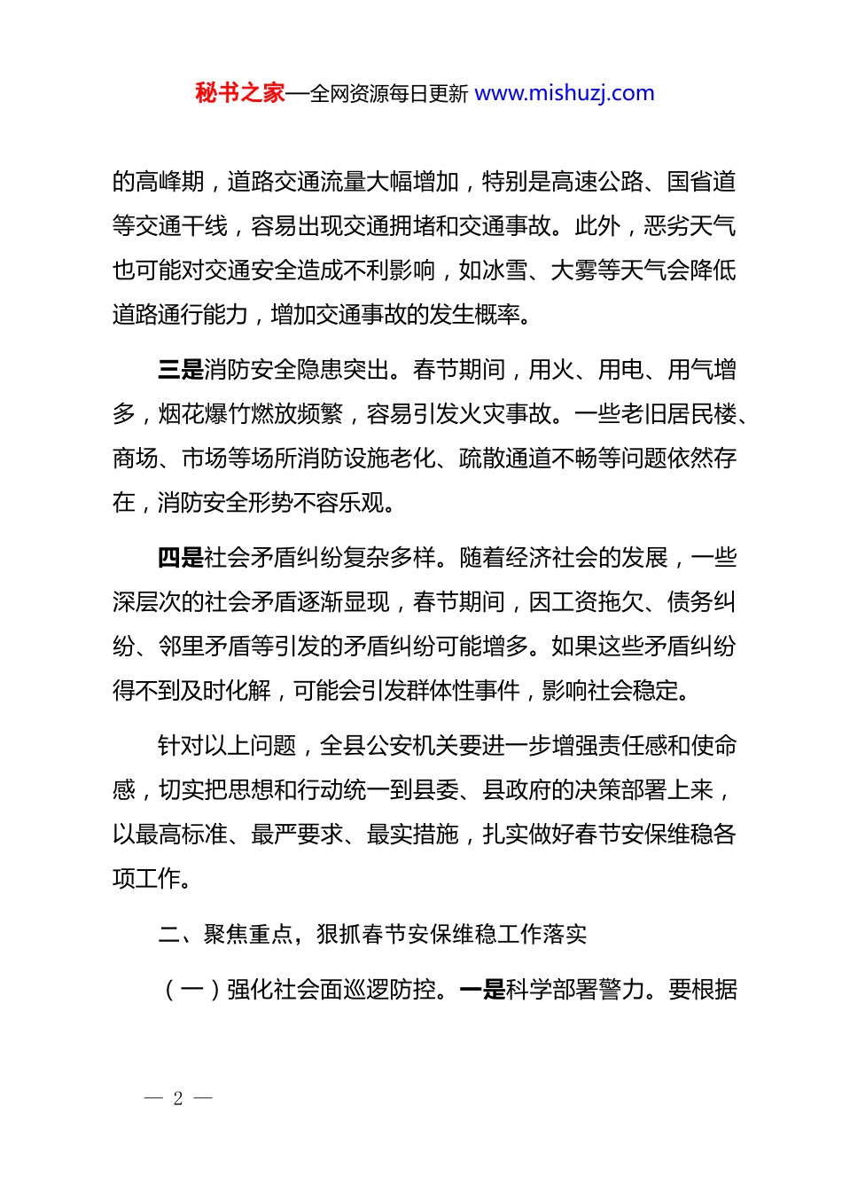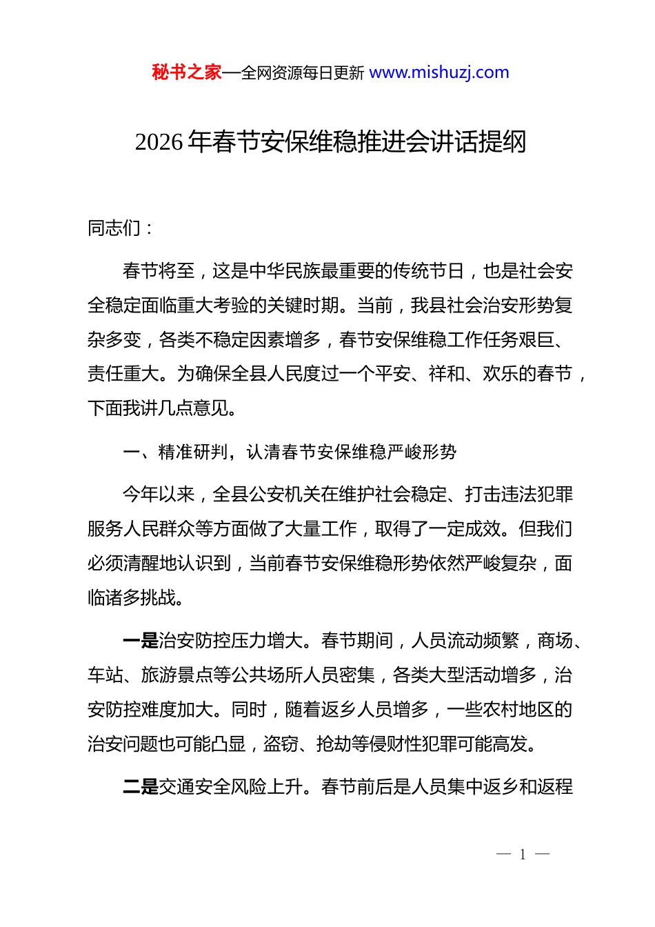 秘书之家—全网资源每日更新 www.mishuzj.com2026 年春节安保维稳推进会讲话提纲同志们:春节将至,这是中华民族最重要的传统节日,也是社会安全稳定面临重大考验的关键时期。当前,我县社会治安形势复杂多变,各类不稳定因素增多,春节安保维稳工作任务艰巨、责任重大。为确保全县人民度过一个平安、祥和、欢乐的春节,下面我讲几点意见。一、精准研判,认清春节安保维稳严峻形势今年以来,全县公安机关在维护社会稳定、打击违法犯罪服务人民群众等方面做了大量工作,取得了一定成效。但我们必须清醒地认识到,当前春节安保维稳形势依然严峻复杂,面临诸多挑战。一是治安防控压力增大。春节期间,人员流动频繁,商场、车站、旅游景点等公共场所人员密集,各类大型活动增多,治安防控难度加大。同时,随着返乡人员增多,一些农村地区的治安问题也可能凸显,盗窃、抢劫等侵财性犯罪可能高发。二是交通安全风险上升。春节前后是人员集中返乡和返程— 1 —秘书之家—全网资源每日更新 www.mishuzj.com的高峰期,道路交通流量大幅增加,特别是高速公路、国省道等交通干线,容易出现交通拥堵和交通事故。此外,恶劣天气也可能对交通安全造成不利影响,如冰雪、大雾等天气会降低道路通行能力,增加交通事故的发生概率。三是消防安全隐患突出。春节期间,用火、用电、用气增多,烟花爆竹燃放频繁,容易引发火灾事故。一些老旧居民楼、商场、市场等场所消防设施老化、疏散通道不畅等问题依然存在,消防安全形势不容乐观。四是社会矛盾纠纷复杂多样。随着经济社会的发展,一些深层次的社会矛盾逐渐显现,春节期间,因工资拖欠、债务纠纷、邻里矛盾等引发的矛盾纠纷可能增多。如果这些矛盾纠纷得不到及时化解,可能会引发群体性事件,影响社会稳定。针对以上问题,全县公安机关要进一步增强责任感和使命感,切实把思想和行动统一到县委、县政府的决策部署上来,以最高标准、最严要求、最实措施,扎实做好春节安保维稳各项工作。二、聚焦重点,狠抓春节安保维稳工作落实(一)强化社会面巡逻防控。一是科学部署警力。要根据— 2 —秘书之家—全网资源每日更新 www.mishuzj.com春节期间社会治安特点和规律,合理调整警力部署,加大对重点区域、重点部位、重点时段的巡逻防控力度。特别是要加强对商场、车站、广场等人员密集场所的巡逻防控,提高见警率和管事率,增强群众安全感。二是加强武装巡逻。要组织特警、巡警等警力开展武装巡逻,提高应急处置能力。同时,要加强与武警部队的联勤联动,形成强大的防控合力。三是发挥群防群治力量。要充分发动社区干部、网格员、志愿者等群防群治力量,参与社会面巡逻防控工作,形成全社会共同参与的良好局面。(二)加强交通安全管理。一是强化路面管控。要加大对高速公路、国省道、农村道路等重点路段的巡逻管控力度,严厉查处超速、超载、酒驾、疲劳驾驶等交通违法行为,确保道路交通安全畅通。二是做好恶劣天气应对准备。要密切关注天气变化,提前做好应对恶劣天气的各项准备工作。一旦出现冰雪、大雾等恶劣天气,要及时采取交通管制、疏导分流等措施,确保道路安全通行。三是加强交通安全宣传。要通过多种形式,广泛宣传交通安全知识,提高群众的交通安全意识和自我保护能力。特别是要加强对返乡人员的交通安全宣传,提醒他们遵守交通规则,文明出行。— 3 —秘书之家—全网资源每日更新 www.mishuzj.com(三)排查整治消防安全隐患。一是开展消防安全检查。要组织消防、治安等部门对商场、市场、宾馆、饭店、娱乐场所等人员密集场所,以及易燃易爆单位、老旧居民楼等重点场所进行全面消防安全检查,及时发现和消除火灾隐患。二是加强消防宣传教育。要通过多种渠道,广泛宣传消防安全知识,提高群众的消防安全意识和自防自救能力。特别是要加强对烟花爆竹燃放安全知识的宣传,引导群众文明、安全燃放烟花爆竹。三是做好灭火救援准备。要加强消防队伍建设,提高灭火救援能力。同时,要做好灭火救援物资储备和装备维护保养工作,确保一旦发生火灾事故,能够迅速、有效地进行处置。(四)化解社会矛盾纠纷。一是开展矛盾纠纷排查。要组织民...