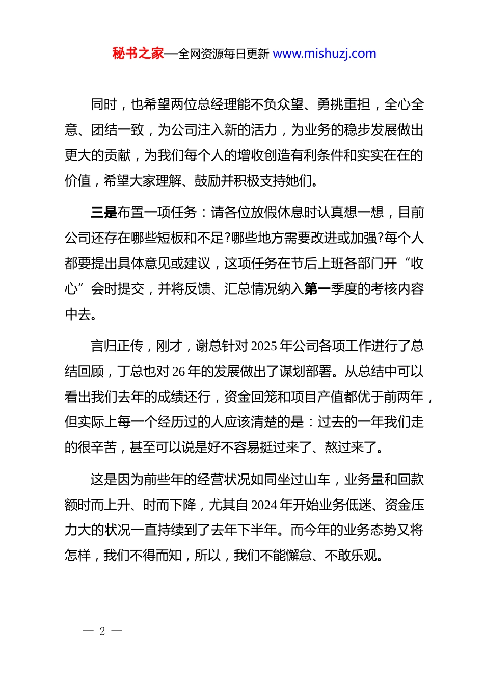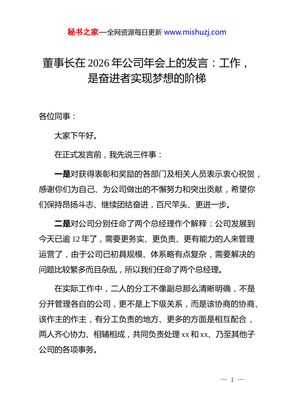 秘书之家—全网资源每日更新 www.mishuzj.com董事长在 2026 年公司年会上的发言:工作,是奋进者实现梦想的阶梯各位同事:大家下午好。在正式发言前,我先说三件事:一是对获得表彰和奖励的各部门及相关人员表示衷心祝贺,感谢你们为自己、为公司做出的不懈努力和突出贡献,希望你们保持昂扬斗志、继续团结奋进,百尺竿头、更进一步。二是对公司分别任命了两个总经理作个解释:公司发展到今天已逾 12 年了,需要更务实、更负责、更有能力的人来管理运营了,由于公司已初具规模、体系略有点复杂,需要解决的问题比较繁多而且杂乱,所以我们任命了两个总经理。在实际工作中,二人的分工不像副总那么清晰明确,不是分开管理各自的公司,更不是上下级关系,而是该协商的协商、该作主的作主,有分工负责的地方、更多的方面是相互配合,两人齐心协力、相辅相成,共同负责处理 xx 和 xx、乃至其他子公司的各项事务。— 1 —秘书之家—全网资源每日更新 www.mishuzj.com同时,也希望两位总经理能不负众望、勇挑重担,全心全意、团结一致,为公司注入新的活力,为业务的稳步发展做出更大的贡献,为我们每个人的增收创造有利条件和实实在在的价值,希望大家理解、鼓励并积极支持她们。三是布置一项任务:请各位放假休息时认真想一想,目前公司还存在哪些短板和不足?哪些地方需要改进或加强?每个人都要提出具体意见或建议,这项任务在节后上班各部门开“收心”会时提交,并将反馈、汇总情况纳入第一季度的考核内容中去。言归正传,刚才,谢总针对 2025 年公司各项工作进行了总结回顾,丁总也对 26 年的发展做出了谋划部署。从总结中可以看出我们去年的成绩还行,资金回笼和项目产值都优于前两年,但实际上每一个经历过的人应该清楚的是:过去的一年我们走的很辛苦,甚至可以说是好不容易挺过来了、熬过来了。这是因为前些年的经营状况如同坐过山车,业务量和回款额时而上升、时而下降,尤其自 2024 年开始业务低迷、资金压力大的状况一直持续到了去年下半年。而今年的业务态势又将怎样,我们不得而知,所以,我们不能懈怠、不敢乐观。— 2 —秘书之家—全网资源每日更新 www.mishuzj.com今天的年会,既是对过去一年的总结,也是对未来征程的展望。下面,我主要谈一个话题:工作。由此阐述三个基本问题:何为工作?为何工作?如何工作?考虑好并解决好这些问题,不仅关乎着个人的成长,更决定了我们团队如何在激烈的市场竞争中立足。一、何为工作?既是生存之道,也是使命之需。从网上搜索到工作的定义是“通过主动付出劳动或技能,换取回报并创造价值的持续性活动”。所以,工作的本质其实很简单:拿你具有的,换你想要的----这也是这个世界的基本生存规则。刚参加工作时,我们都以为工作就是“有碗饭吃”。而现在,我越来越体会到工作其实是一场实现自我价值的修行,是一个生存到使命的进化过程。一般来说,人总会这样:先是要有碗饭吃,有了饭然后就想要有菜,菜有了就会嫌没油水,油水有了又觉得腻,挑肥拣瘦过来又抱怨菜的品种少了,花样增多了却说没一样合自己胃口的……。而这也说明,人的欲望是会逐步升级的,那么你所具备的、用于价值交换的能力是否也在升级呢?许多时候,我们有些人一方面抱怨薪资低,一方面又躺平不想动。— 3 —秘书之家—全网资源每日更新 www.mishuzj.com的确,三五千的底薪是有点少,但是让你加班你嫌累、外出作业你嫌远,有捞“外快”的机会你又嫌太麻烦,那么请告诉我:为了多挣钱你付出过什么,吃过什么苦、受过哪些累?你只有一双手,却要通吃所有红利,你觉得可能吗?什么约束都不想受,什么技能都不想学,什么苦都不想吃,什么地方都不想去,就这还嫌薪资待遇不好。想成功又怕冒险,想发财挣大钱却把希望寄托在渺茫的幻想当中,你不觉得自己可笑吗?如今,有些人的想法很矛盾、让人很费解:没做好准备就想要机遇;没执行力却想要发财;不独立却要自由;不行动却爱思考。没被接纳却想让别人认可;没有进步还怕被别人代替;没认清现实却空想未来;没有明确方向却怪努力没用。都说人穷是有原因的,我觉得大多数原因归根结底就是不思进取,愚...