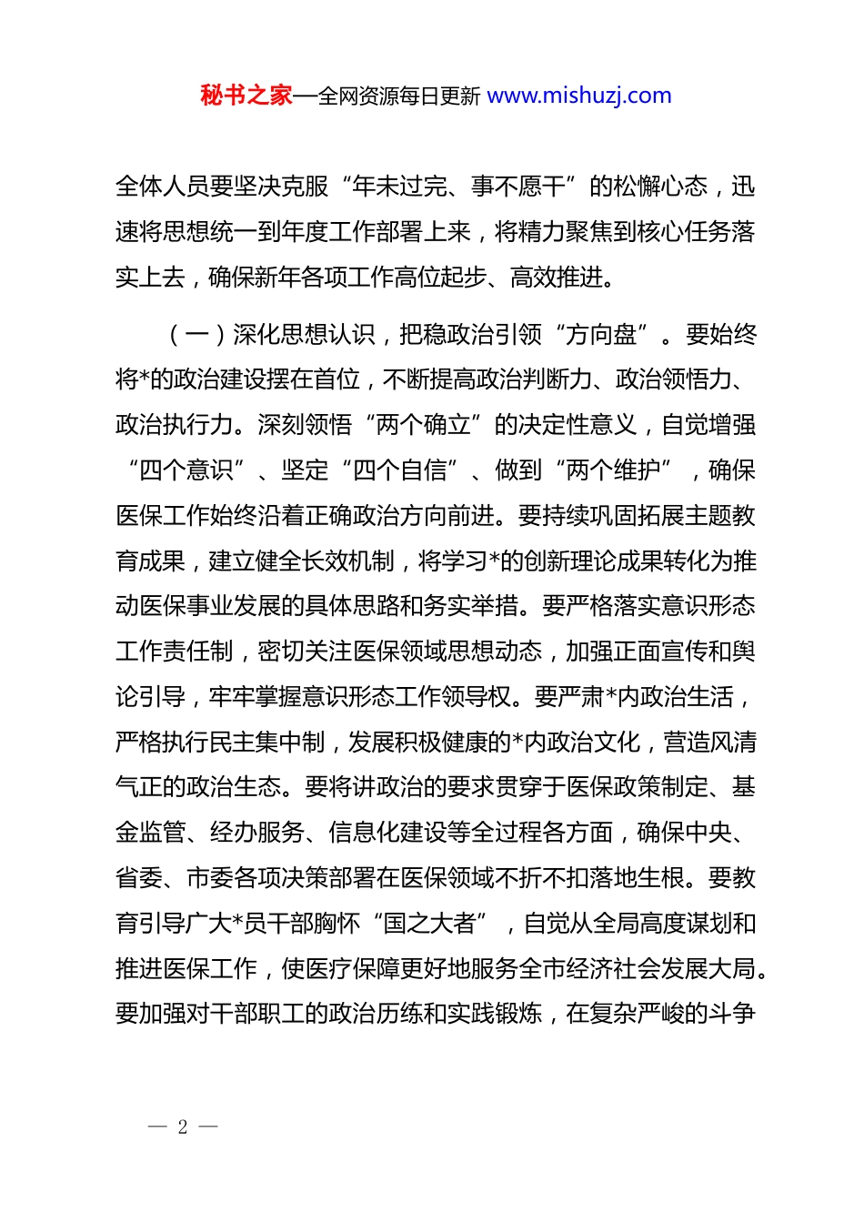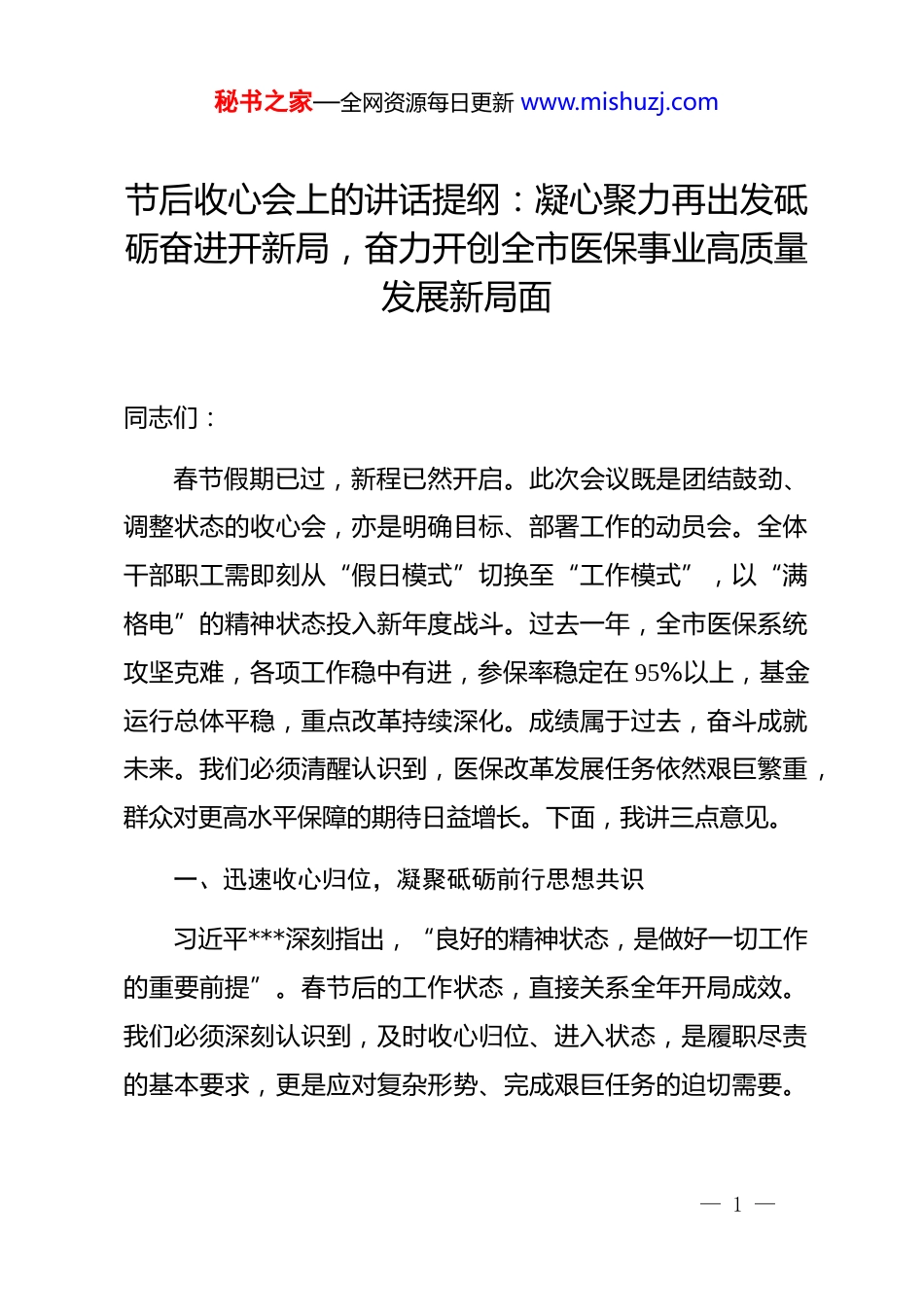 秘书之家—全网资源每日更新 www.mishuzj.com节后收心会上的讲话提纲:凝心聚力再出发砥砺奋进开新局,奋力开创全市医保事业高质量发展新局面同志们:春节假期已过,新程已然开启。此次会议既是团结鼓劲、调整状态的收心会,亦是明确目标、部署工作的动员会。全体干部职工需即刻从“假日模式”切换至“工作模式”,以“满格电”的精神状态投入新年度战斗。过去一年,全市医保系统攻坚克难,各项工作稳中有进,参保率稳定在 95%以上,基金运行总体平稳,重点改革持续深化。成绩属于过去,奋斗成就未来。我们必须清醒认识到,医保改革发展任务依然艰巨繁重,群众对更高水平保障的期待日益增长。下面,我讲三点意见。一、迅速收心归位,凝聚砥砺前行思想共识习近平***深刻指出,“良好的精神状态,是做好一切工作的重要前提”。春节后的工作状态,直接关系全年开局成效。我们必须深刻认识到,及时收心归位、进入状态,是履职尽责的基本要求,更是应对复杂形势、完成艰巨任务的迫切需要。— 1 —秘书之家—全网资源每日更新 www.mishuzj.com全体人员要坚决克服“年未过完、事不愿干”的松懈心态,迅速将思想统一到年度工作部署上来,将精力聚焦到核心任务落实上去,确保新年各项工作高位起步、高效推进。(一)深化思想认识,把稳政治引领“方向盘”。要始终将*的政治建设摆在首位,不断提高政治判断力、政治领悟力、政治执行力。深刻领悟“两个确立”的决定性意义,自觉增强“四个意识”、坚定“四个自信”、做到“两个维护”,确保医保工作始终沿着正确政治方向前进。要持续巩固拓展主题教育成果,建立健全长效机制,将学习*的创新理论成果转化为推动医保事业发展的具体思路和务实举措。要严格落实意识形态工作责任制,密切关注医保领域思想动态,加强正面宣传和舆论引导,牢牢掌握意识形态工作领导权。要严肃*内政治生活,严格执行民主集中制,发展积极健康的*内政治文化,营造风清气正的政治生态。要将讲政治的要求贯穿于医保政策制定、基金监管、经办服务、信息化建设等全过程各方面,确保中央、省委、市委各项决策部署在医保领域不折不扣落地生根。要教育引导广大*员干部胸怀“国之大者”,自觉从全局高度谋划和推进医保工作,使医疗保障更好地服务全市经济社会发展大局。要加强对干部职工的政治历练和实践锻炼,在复杂严峻的斗争— 2 —秘书之家—全网资源每日更新 www.mishuzj.com中经风雨、见世面、壮筋骨,锻造一支政治上绝对可靠、对*绝对忠诚的医保铁军。(二)锤炼过硬作风,绷紧纪律规矩“高压线”。作风建设关乎事业成败,必须常抓不懈、久久为功。要锲而不舍落实中央八项规定及其实施细则精神,紧盯“四风”问题新表现新动向,深化整治形式主义、官僚主义,切实为基层减负。要大兴调查研究之风,围绕 drg/dip 支付方式改革深化、门诊共济保障机制平稳实施、长期护理保险制度探索、基金监管长效治理等难点堵点问题,深入定点医药机构、企业、社区和群众中掌握实情、找准症结、提出对策。要大力弘扬“马上就办、真抓实干”的优良作风,对定下的事情雷厉风行、抓紧实施,对部署的工作一抓到底、务求实效,坚决反对推诿扯皮、拖沓敷衍。要强化纪律教育,组织学习新修订的《中国共产*纪律处分条例》等*内法规,让*员干部知敬畏、存戒惧、守底线。要加强廉洁文化建设,深入挖掘医保系统廉洁元素,开展警示教育活动,注重家庭家教家风建设,筑牢拒腐防变的思想道德防线。要完善内控机制,聚焦药品耗材招采、目录调整、费用审核、结算支付、行政审批等关键岗位和重点环节,排查廉政风险点,健全权力运行制约和监督体系,让权力在阳光下运行。要畅通— 3 —秘书之家—全网资源每日更新 www.mishuzj.com群众监督渠道,认真办理群众信访举报,以零容忍态度惩治损害群众利益的腐败问题和作风问题。(三)明确目标方位,绘就年度发展“路线图”。开局关乎全局,起步决定后程。要紧紧围绕国家、省医保局年度工作要点和市委、市政府中心工作,紧密结合我市实际,科学谋划、精准制定 2026 年全市医疗保障工作要点及任务分解表。要聚焦“保基本、可持续、全覆盖、优服务...