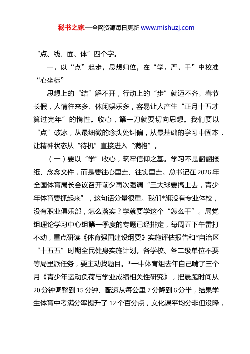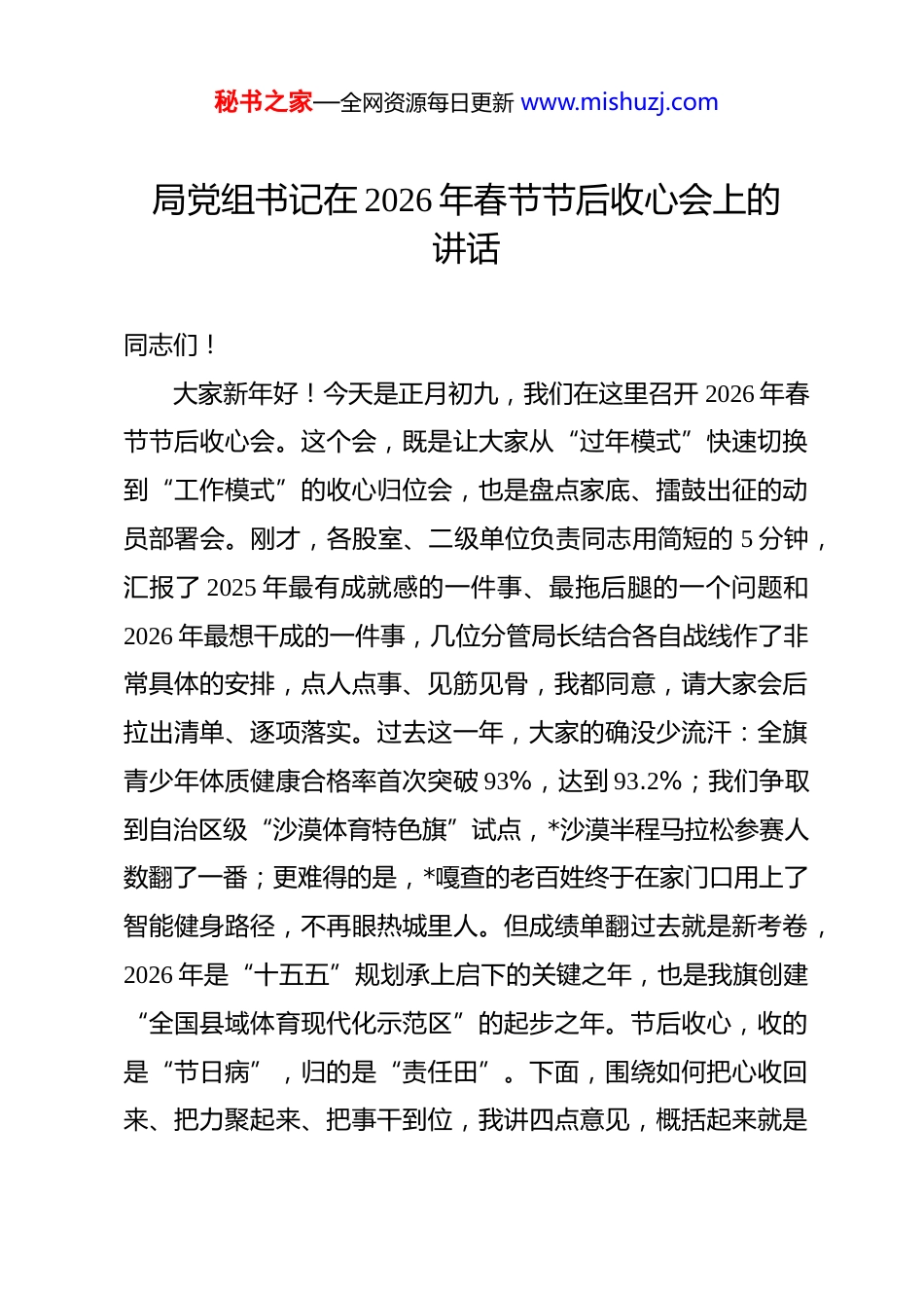 秘书之家—全网资源每日更新 www.mishuzj.com局党组书记在 2026 年春节节后收心会上的讲话 同志们!大家新年好!今天是正月初九,我们在这里召开 2026 年春节节后收心会。这个会,既是让大家从“过年模式”快速切换到“工作模式”的收心归位会,也是盘点家底、擂鼓出征的动员部署会。刚才,各股室、二级单位负责同志用简短的 5 分钟,汇报了 2025 年最有成就感的一件事、最拖后腿的一个问题和2026 年最想干成的一件事,几位分管局长结合各自战线作了非常具体的安排,点人点事、见筋见骨,我都同意,请大家会后拉出清单、逐项落实。过去这一年,大家的确没少流汗:全旗青少年体质健康合格率首次突破 93%,达到 93.2%;我们争取到自治区级“沙漠体育特色旗”试点,*沙漠半程马拉松参赛人数翻了一番;更难得的是,*嘎查的老百姓终于在家门口用上了智能健身路径,不再眼热城里人。但成绩单翻过去就是新考卷,2026 年是“十五五”规划承上启下的关键之年,也是我旗创建“全国县域体育现代化示范区”的起步之年。节后收心,收的是“节日病”,归的是“责任田”。下面,围绕如何把心收回来、把力聚起来、把事干到位,我讲四点意见,概括起来就是秘书之家—全网资源每日更新 www.mishuzj.com“点、线、面、体”四个字。一、以“点”起步,思想归位,在“学、严、干”中校准“心坐标”思想上的“结”解不开,行动上的“步”就迈不齐。春节长假,人情往来多、休闲娱乐多,容易让人产生“正月十五才算过完年”的惰性。收心,第一刀就要切向思想。我们要以“点”破冰,从最细微的念头处纠偏,从最基础的学习中固本,让精神状态从“待机”直接进入“满格”。(一)要以“学”收心,筑牢信仰之基。学习不是翻翻报纸、念念文件,而是要往心里走、往实里走。总书记在 2026 年全国体育局长会议召开前夕再次强调“三大球要搞上去,青少年体育要抓起来”,这句话分量很重。我们*旗没有专业体校,没有职业俱乐部,怎么落实?学就要学这个“怎么干”。局党组理论学习中心组第一季度的专题已经排定,每周五下午雷打不动,重点研读《体育强国建设纲要》实施评估报告和*自治区“十五五”时期全民健身实施计划。各学校、各二级单位不要等局里派任务,要主动找题目。*一中体育组去年自己啃了三个月《青少年运动负荷与学业成绩相关性研究》,把晨跑时间从20 分钟调整到 15 分钟、配速从每公里 7 分降到 6 分半,结果学生体育中考满分率提升了 12 个百分点,文化课平均分非但没降,秘书之家—全网资源每日更新 www.mishuzj.com反而比全区同类学校高出 4.8 分。这个案例说明,学懂弄通了,工作就有出路。今年,教研室要牵头梳理“学校体育百问”,把大课间怎么组织、体育作业怎么布置、运动损伤怎么预防这些具体问题,编成工具书,发给每一名体育教师。学习成果要量化,年底所有体育教师必须通过“运动处方”技能考核,不过关的暂停评优资格。(二)要以“严”立规,校准行为坐标。节后上班,最怕什么?怕的是人进了办公室,心还在酒桌上;怕的是考勤机打了卡,人却溜出去办私事。昨天下午我提前到单位转了一圈,有的办公室门开着、灯亮着,人却不知去向;有的同志坐在电脑前,鼠标点的却是购物网站。这种“隐形脱岗”比明着旷工更可怕。今年是旗委确定的“作风效能攻坚年”,我们教育体育局绝不能当反面典型。从今天起,实行“双签到”制度,上午八点半、下午两点半,人脸识别和股室负责人签字双保险;外出办事必须填写去向牌,标明时间、地点、事由,办公室每天随机抽查两次。发现第一次,股室内部作检查;发现第二次,全局通报并取消年度评优资格;发现第三次,调整工作岗位。我不是要跟谁过不去,而是要对得起这份俸禄、对得起老百姓的期盼。去年群众评议,有家长反映某小学体育器材室钥匙在体育老师手里,老师请假三天,器材室就锁了三天,孩子们只秘书之家—全网资源每日更新 www.mishuzj.com能围着操场跑圈。这就是作风问题,是不作为!今年,所有学校体育设施必须实行“AB 角”管理,任何岗位都有替补,任何环节不许断档。纪检组要把这项内容作为重点,一竿子插到底。(...