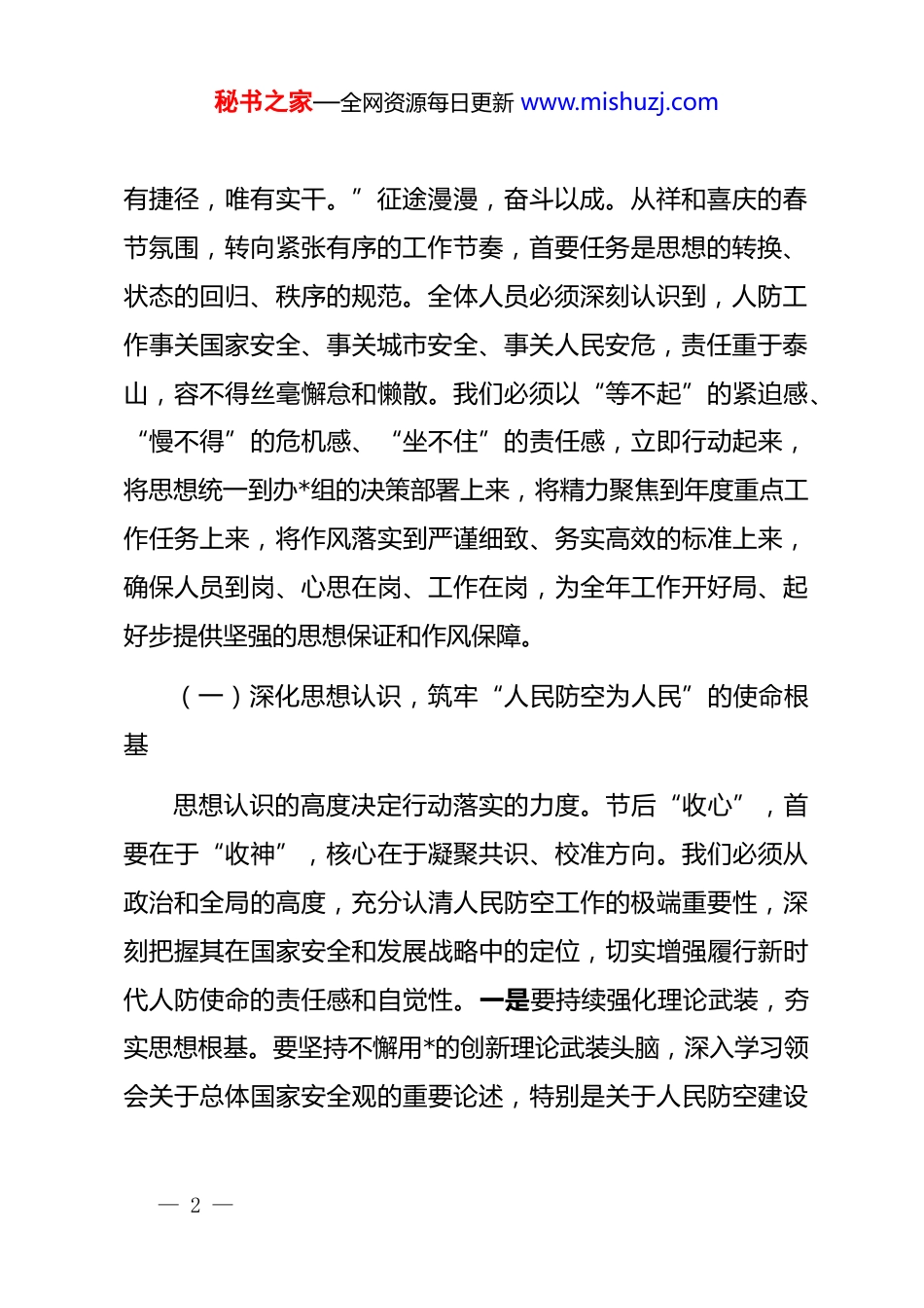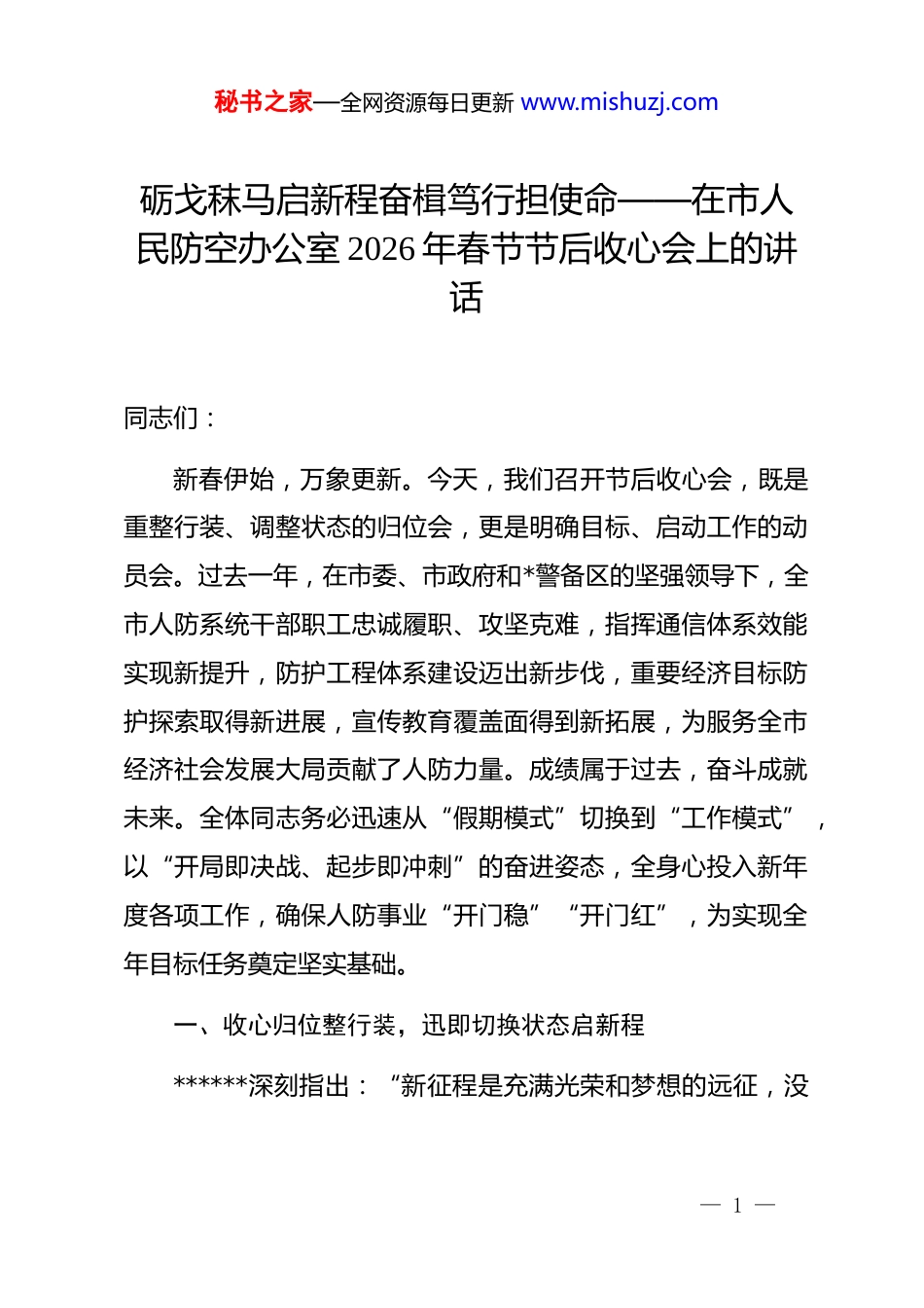 秘书之家—全网资源每日更新 www.mishuzj.com砺戈秣马启新程奋楫笃行担使命——在市人民防空办公室 2026 年春节节后收心会上的讲话同志们:新春伊始,万象更新。今天,我们召开节后收心会,既是重整行装、调整状态的归位会,更是明确目标、启动工作的动员会。过去一年,在市委、市政府和*警备区的坚强领导下,全市人防系统干部职工忠诚履职、攻坚克难,指挥通信体系效能实现新提升,防护工程体系建设迈出新步伐,重要经济目标防护探索取得新进展,宣传教育覆盖面得到新拓展,为服务全市经济社会发展大局贡献了人防力量。成绩属于过去,奋斗成就未来。全体同志务必迅速从“假期模式”切换到“工作模式”,以“开局即决战、起步即冲刺”的奋进姿态,全身心投入新年度各项工作,确保人防事业“开门稳”“开门红”,为实现全年目标任务奠定坚实基础。一、收心归位整行装,迅即切换状态启新程******深刻指出:“新征程是充满光荣和梦想的远征,没— 1 —秘书之家—全网资源每日更新 www.mishuzj.com有捷径,唯有实干。”征途漫漫,奋斗以成。从祥和喜庆的春节氛围,转向紧张有序的工作节奏,首要任务是思想的转换、状态的回归、秩序的规范。全体人员必须深刻认识到,人防工作事关国家安全、事关城市安全、事关人民安危,责任重于泰山,容不得丝毫懈怠和懒散。我们必须以“等不起”的紧迫感、“慢不得”的危机感、“坐不住”的责任感,立即行动起来,将思想统一到办*组的决策部署上来,将精力聚焦到年度重点工作任务上来,将作风落实到严谨细致、务实高效的标准上来,确保人员到岗、心思在岗、工作在岗,为全年工作开好局、起好步提供坚强的思想保证和作风保障。(一)深化思想认识,筑牢“人民防空为人民”的使命根基思想认识的高度决定行动落实的力度。节后“收心”,首要在于“收神”,核心在于凝聚共识、校准方向。我们必须从政治和全局的高度,充分认清人民防空工作的极端重要性,深刻把握其在国家安全和发展战略中的定位,切实增强履行新时代人防使命的责任感和自觉性。一是要持续强化理论武装,夯实思想根基。要坚持不懈用*的创新理论武装头脑,深入学习领会关于总体国家安全观的重要论述,特别是关于人民防空建设— 2 —秘书之家—全网资源每日更新 www.mishuzj.com的****批示精神,深刻理解其核心要义、精神实质和实践要求。要通过系统学习,不断增进对“国之大者”的领悟,明确人防工作在国家总体安全布局中的坐标方位,确保人防事业发展始终沿着正确政治方向前进。要将学习成果转化为谋划工作的思路、推动落实的举措和履职尽责的能力,切实解决思想上的困惑、认识上的偏差、实践中的难题,以理论上的清醒保证行动上的坚定。二是要准确把握形势任务,保持战略清醒。当前,国家安全环境的复杂性、严峻性、不确定性上升,传统安全威胁与非传统安全威胁相互交织。城市作为经济社会发展的重要载体,其安全防护面临新的挑战。我们必须清醒认识人防建设面临的新形势新要求,准确把握城市发展、科技进步、战争形态演变给人防工作带来的深刻影响。要增强忧患意识,树立底线思维,密切关注安全动态,深入分析风险隐患,做到见微知著、防患未然,牢牢掌握工作主动权。要摒弃和平积弊,克服麻痹思想,时刻保持“警钟长鸣、常备不懈”的战斗姿态。三是要牢固树立宗旨意识,践行初心使命。人民防空是国之大事,是国家战略,是长期战略,根本目的是保护人民生命财产安全。要始终坚持以人民为中心的发展思想,将“人民防空为人民”的宗旨贯穿于工作全过程、各方面。在规划编制、工程建设、演练组织、宣传教育等各项工作中,都要充分考虑人民群众的— 3 —秘书之家—全网资源每日更新 www.mishuzj.com需求和关切,努力提升城市综合防护能力,为人民群众铸就坚不可摧的护民之盾。要畅通渠道,倾听民意,积极回应社会对人防工作的期待,不断提升人民群众对人防工作的知晓度、参与度和满意度,夯实人防事业的群众基础。(二)严明纪律规矩,淬炼“令行禁止作风硬”的过硬队伍纪律是执行路线的保证,规矩是成就事业的基石。节后状态的回稳,离不开严明的纪律约束和优良的作风保障。一支...