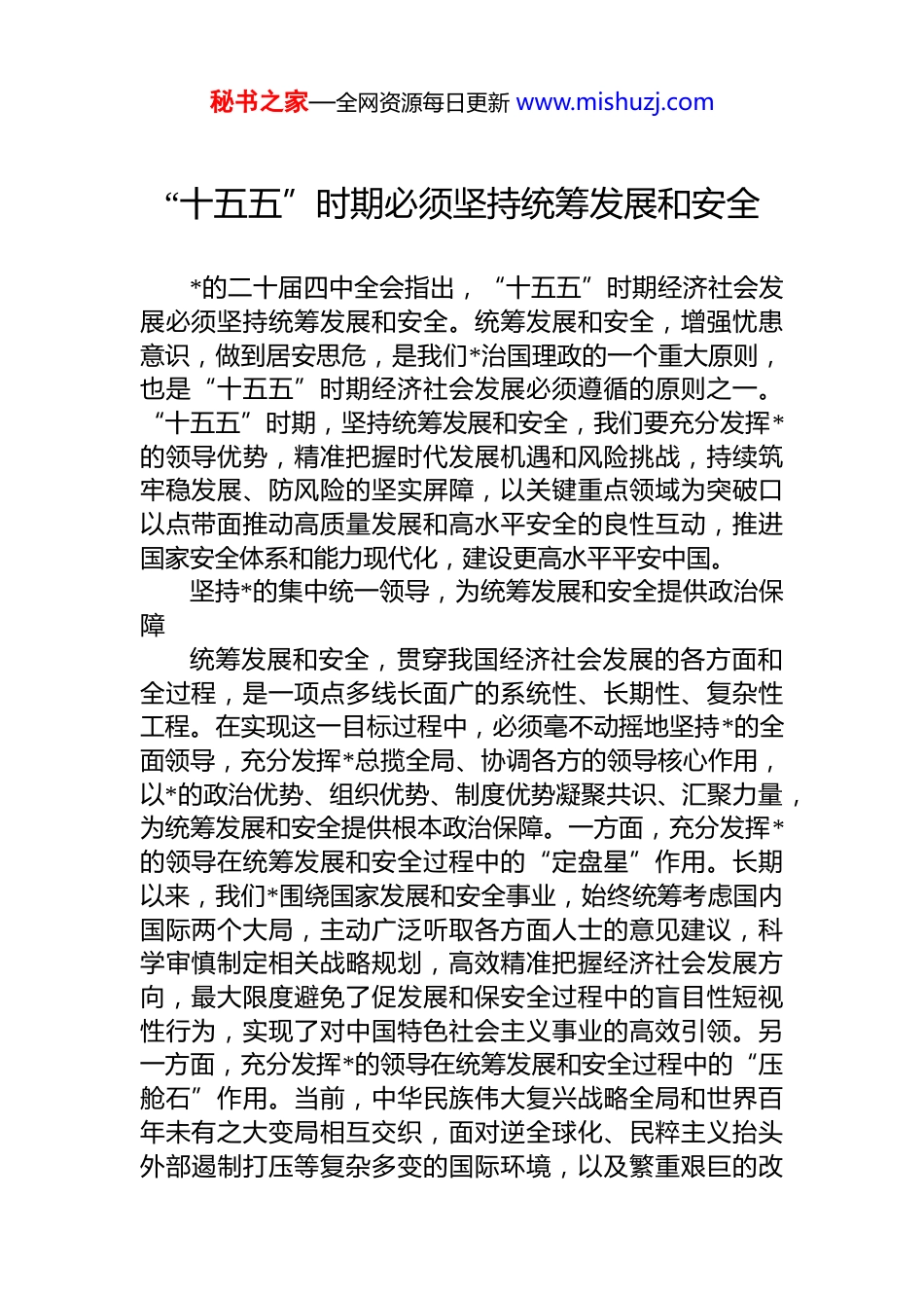 秘书之家—全网资源每日更新 www.mishuzj.com“十五五”时期必须坚持统筹发展和安全*的二十届四中全会指出,“十五五”时期经济社会发展必须坚持统筹发展和安全。统筹发展和安全,增强忧患意识,做到居安思危,是我们*治国理政的一个重大原则,也是“十五五”时期经济社会发展必须遵循的原则之一。“十五五”时期,坚持统筹发展和安全,我们要充分发挥*的领导优势,精准把握时代发展机遇和风险挑战,持续筑牢稳发展、防风险的坚实屏障,以关键重点领域为突破口以点带面推动高质量发展和高水平安全的良性互动,推进国家安全体系和能力现代化,建设更高水平平安中国。坚持*的集中统一领导,为统筹发展和安全提供政治保障统筹发展和安全,贯穿我国经济社会发展的各方面和全过程,是一项点多线长面广的系统性、长期性、复杂性工程。在实现这一目标过程中,必须毫不动摇地坚持*的全面领导,充分发挥*总揽全局、协调各方的领导核心作用,以*的政治优势、组织优势、制度优势凝聚共识、汇聚力量,为统筹发展和安全提供根本政治保障。一方面,充分发挥*的领导在统筹发展和安全过程中的“定盘星”作用。长期以来,我们*围绕国家发展和安全事业,始终统筹考虑国内国际两个大局,主动广泛听取各方面人士的意见建议,科学审慎制定相关战略规划,高效精准把握经济社会发展方向,最大限度避免了促发展和保安全过程中的盲目性短视性行为,实现了对中国特色社会主义事业的高效引领。另一方面,充分发挥*的领导在统筹发展和安全过程中的“压舱石”作用。当前,中华民族伟大复兴战略全局和世界百年未有之大变局相互交织,面对逆全球化、民粹主义抬头外部遏制打压等复杂多变的国际环境,以及繁重艰巨的改秘书之家—全网资源每日更新 www.mishuzj.com革发展稳定任务,必须发挥*的领导优势,广泛调动各级*委和政府、企业、社会组织和人民群众参与国家治理和社会治理的积极性,逐步建立健全与中国式现代化相适应的经济、政治、文化、社会、生态文明等领域的体制机制,完善社会主义法治,为统筹发展和安全提供强劲动能。锚定时代历史方位,精准把握发展机遇和风险挑战正确认识*和人民事业所处的历史方位和发展阶段,是我们*明确阶段性中心任务、制定路线方针政策的根本依据。*的二十届四中全会指出,“十五五”时期是基本实现社会主义现代化夯实基础、全面发力的关键时期,在基本实现社会主义现代化进程中具有承前启后的重要地位。因此,锚定时代历史方位,精准把握时代发展机遇和风险挑战,是统筹发展和安全的战略基点。一方面,准确把握“十五五”时期的时代坐标。面对错综复杂的国际形势和艰巨繁重的国内改革发展稳定任务,以***同志为核心的*中央团结带领全*全国各族人民,迎难而上、砥砺前行,经受住世纪疫情严重冲击,有效应对一系列重大风险挑战,推动*和国家事业取得新的重大成就。我国经济实力、科技实力、综合国力跃上新台阶,中国式现代化迈出新的坚实步伐,第二个百年奋斗目标新征程实现良好开局。但必须看到,不平衡不充分的发展问题依然存在,产业链供应链韧性和安全水平亟须提升,政治安全、经济安全、科技安全等问题仍然较为突出。另一方面,科学把握战略机遇和有效应对风险挑战。“十五五”时期我国发展环境面临深刻复杂变化,我国发展处于战略机遇和风险挑战并存、不确定难预料因素增多的时期。随着新一轮科技革命和产业变革加速推进,我们要充分利用好新一轮科技革命和产业变革的窗口期,以及我国具备的丰富人才资源优势、完整产业体系优势、超大规模市场优势和新型举国体制优势,加大对人工智能、数字经济、量子通信、新能源等前沿领域的政策支持和投入力度,培育我国全球竞争新优势。在抢抓机秘书之家—全网资源每日更新 www.mishuzj.com遇的同时,必须清醒认识到,我国发展面临的风险挑战具有复杂性、系统性。比如,工业软件和高端芯片受制于人的局面可能影响供应链安全,人口老龄化可能带来就业结构性压力,等等。坚持底线思维和极限思维,筑牢防范化解重大风险坚实屏障“十五五”时期,统筹发展和安全要坚持底线思维和极限思维,筑牢防范化解重大风险的坚实屏障。针对一段时间以...