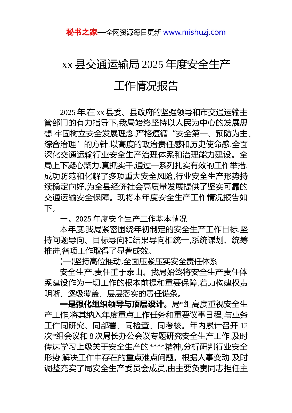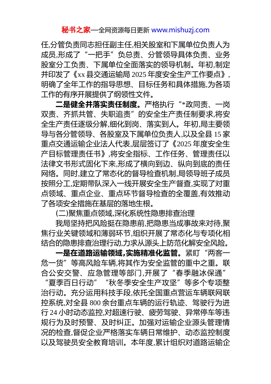 秘书之家—全网资源每日更新 www.mishuzj.comxx 县交通运输局 2025 年度安全生产工作情况报告2025 年,在 xx 县委、县政府的坚强领导和市交通运输主管部门的有力指导下,我局始终坚持以人民为中心的发展思想,牢固树立安全发展理念,严格遵循“安全第一、预防为主、综合治理”的方针,以高度的政治责任感和历史使命感,全面深化交通运输行业安全生产治理体系和治理能力建设。全局上下凝心聚力,真抓实干,通过一系列扎实有效的工作举措,成功防范和化解了多项重大安全风险,行业安全生产形势持续稳定向好,为全县经济社会高质量发展提供了坚实可靠的交通运输安全保障。现将本年度安全生产工作情况报告如下。一、2025 年度安全生产工作基本情况本年度,我局紧密围绕年初制定的安全生产工作目标,坚持问题导向、目标导向和结果导向相统一,系统谋划、统筹推进,各项工作取得了显著成效。(一)坚持高位推动,全面压紧压实安全责任体系安全生产,责任重于泰山。我局始终将安全生产责任体系建设作为一切工作的根本前提和重要保障,着力构建权责明晰、逐级覆盖、层层落实的责任链条。一是强化组织领导与顶层设计。局*组高度重视安全生产工作,将其纳入年度重点工作任务和重要议事日程,与业务工作同研究、同部署、同检查、同考核。年内累计召开 12次*组会议和 8 次局长办公会议专题研究安全生产工作,及时传达学习上级关于安全生产的****精神,分析研判行业安全形势,解决工作中存在的重点难点问题。根据人事变动,及时调整充实了局安全生产委员会成员,由主要负责同志担任主秘书之家—全网资源每日更新 www.mishuzj.com任,分管负责同志担任副主任,相关股室和下属单位负责人为成员,形成了“一把手”负总责、分管领导具体负责、业务股室分工负责、下属单位全面落实的领导机制。年初,制定并印发了《xx 县交通运输局 2025 年度安全生产工作要点》,明确了全年工作的指导思想、目标任务和具体措施,为各项工作的有序开展提供了纲领性文件。二是健全并落实责任制度。严格执行“*政同责、一岗双责、齐抓共管、失职追责”的安全生产责任制要求,将安全生产责任逐级分解,细化到岗、落实到人。年初,局主要领导与各分管领导、各股室及下属单位负责人,以及全县 15 家重点交通运输企业法人代表,层层签订了《2025 年度安全生产目标管理责任书》,将安全指标、工作任务、管理责任以法律文书形式固化下来,形成了横向到边、纵向到底的责任网络。同时,建立了常态化的督导检查机制,局领导班子成员按照分工,定期带队深入一线开展安全生产督查,实现了对重点领域、重点企业、重点环节督导检查的全覆盖,有效推动了各项安全措施在基层的落地生根。(二)聚焦重点领域,深化系统性隐患排查治理我局坚持把风险挺在隐患前,把隐患当成事故来对待,聚焦行业关键领域和薄弱环节,组织开展了常态化与专项化相结合的隐患排查治理行动,力求从源头上防范化解安全风险。一是在道路运输领域,实施精准化监管。紧盯“两客一危一货”等高风险车辆,将其作为安全监管的重中之重。联合公安交警、应急管理等部门,开展了“春季融冰保通”“夏季百日行动”“秋冬季安全生产攻坚”等多个专项整治行动。充分运用科技手段,依托全国重点营运车辆联网联控系统,对全县 800 余台重点车辆的运行轨迹、驾驶行为进行 24 小时动态监控,对超速行驶、疲劳驾驶、异常停车等违规行为及时预警、及时纠正。加强对运输企业源头管理情况的检查,督促企业严格落实车辆日常维护、动态监控制度以及驾驶员安全教育培训。本年度,累计组织对道路运输企秘书之家—全网资源每日更新 www.mishuzj.com业开展安全检查 120 余次,共排查并督促整改各类安全隐患76 处,其中涉及车辆技术状况不良、gps 动态监控设备离线、驾驶员档案不健全等问题均已全部完成闭环整改。二是在水上交通领域,筑牢渡运安全防线。我县境内水系丰富,乡镇渡口渡运安全直接关系到沿岸群众的生命财产安全。我局始终以“万无一失”的标准抓实渡口渡运安全监管。严格执行渡船年度检验制度,严把渡船适航关,对达不到安全技术标准的船只,坚决予以停航整改。加强对渡口运营单位和渡工的管理,定期组织开展安全知识和...